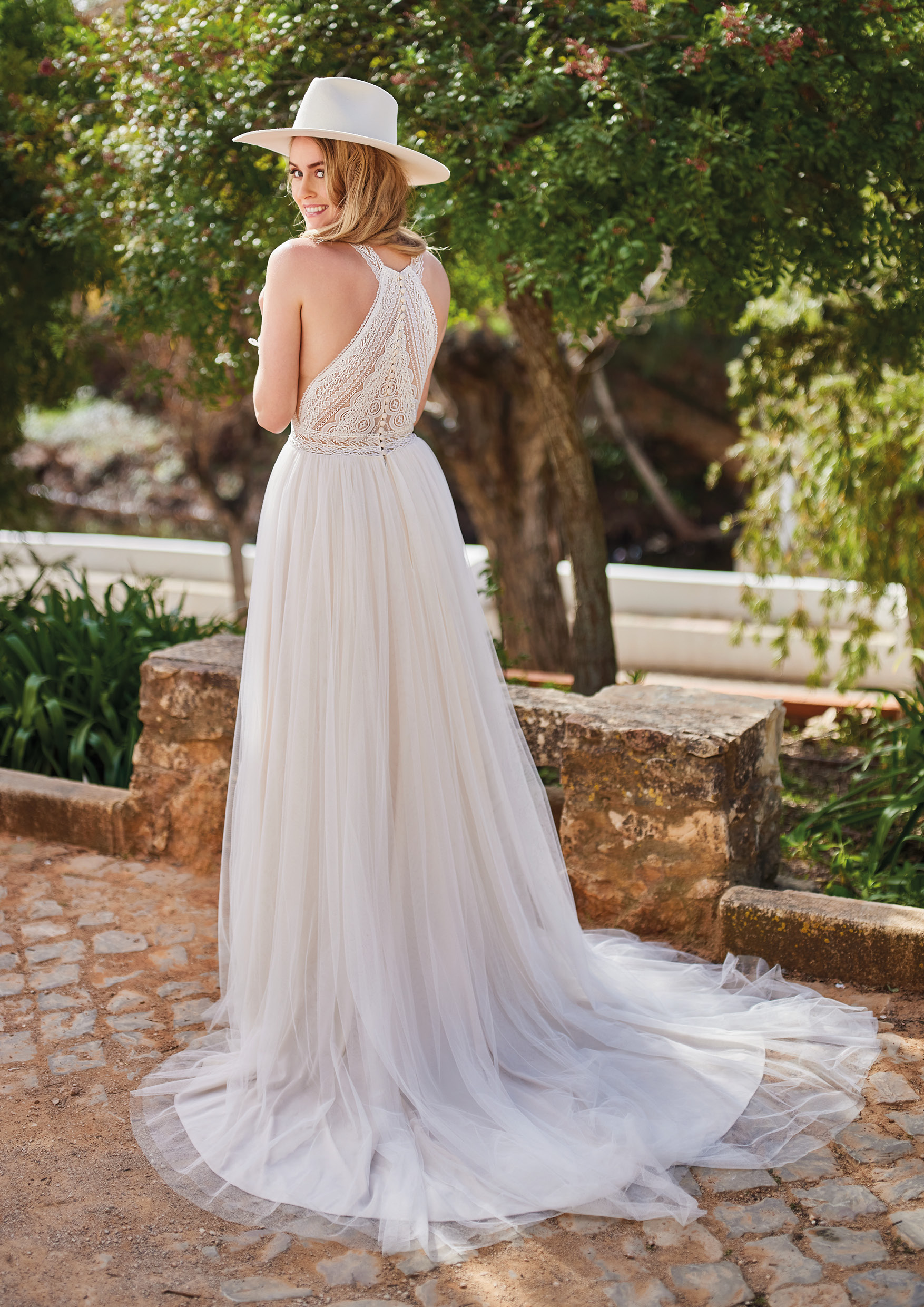 Unverwechselbare, einzigartige Details kennzeichnen dieses zauberhafte, von Boho und Vintage inspirierte Brautkleid in einem zarten Champagner-Ton. Aus mehreren Lagen weich fließenden Netzgeweben entsteht dieses zauberhafte Brautkleid im Modern-Vintage-Stil. Das Kleid besticht durch eine A-Linien-Silhouette mit einem hoch angesetztem Ausschnitt mit einem offenen Mittelakzent, und einen faszinierenden Rückenakzent, der alle Blicke auf sich zieht. Der Rock hat viel Volumen, aber einem kurzen Schleppe. Auch im Farbton Elfenbein erhältlich.