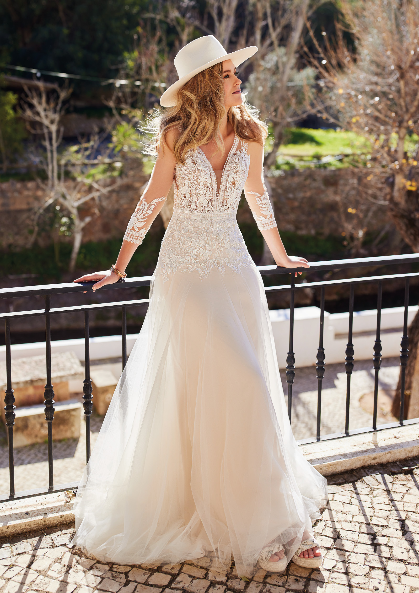 Dieses von Boho und Vintage inspirierte Hochzeitskleid im Empire-Taille-Stil verzaubert durch seinen tiefen V-Ausschnitt und einen wunderschönen Rückenakzent im Schlüsselloch-Optik, der garantiert alle Blicke auf sich ziehen wird. Mit seinen außergewöhnlichen Dreiviertel-Ärmeln kreiert dieses Kleid einen romantischen und eleganten Look, doch zugleich strahlt es echten Vintage-Charme aus. Der Rock hat viel Volumen, aber einem kurzen Schleppe. Das Kleid ist im Farbton Champagner abgebildet, es ist zudem in Elfenbein erhältlich.