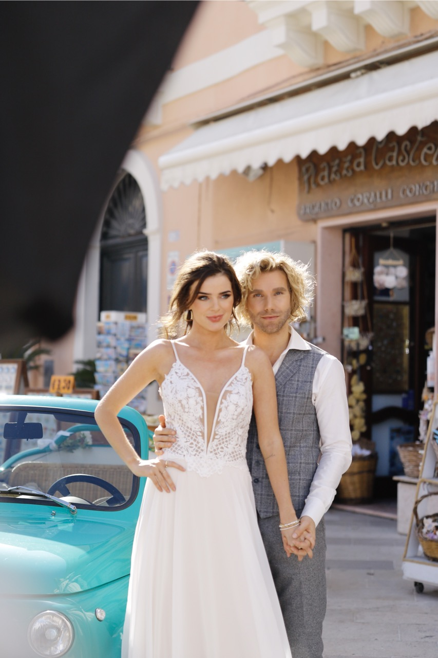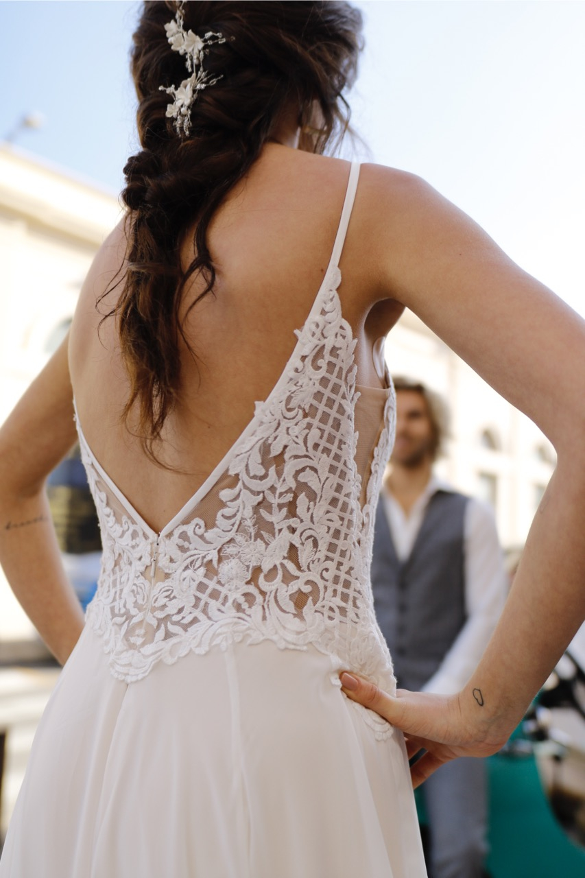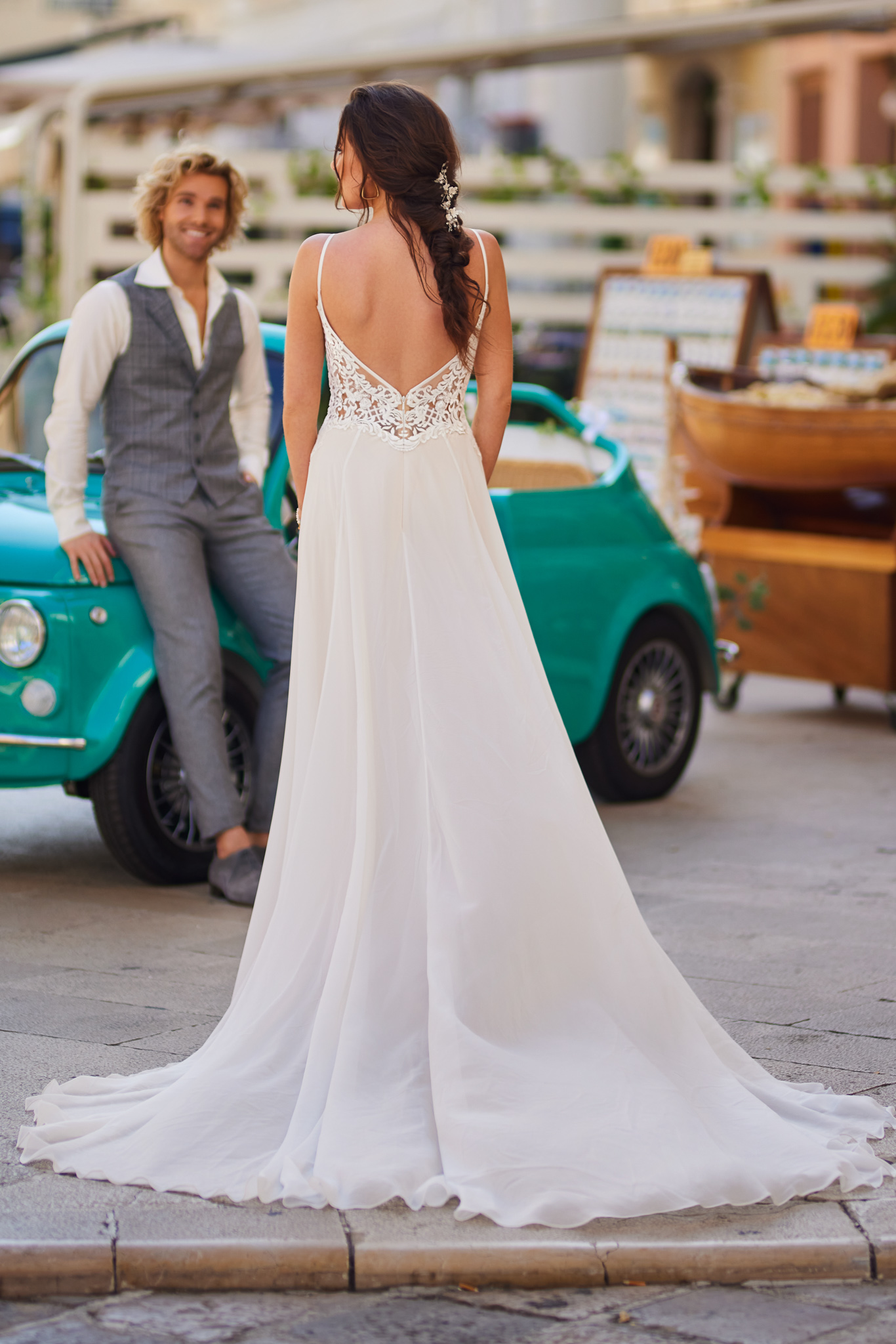 Dieses auffällige und doch elegante Brautkleid im Boho-Stil ist mit wunderschönen Spitzeneinsätzen am Mieder versehen, die einen spektakulären tiefen V-Ausschnitt und einen offenen Rücken schaffen. Der Rock ist aus mehreren Lagen weichen, traumhaften Chiffons gefertigt. Alle Materialdetails anzeigen
