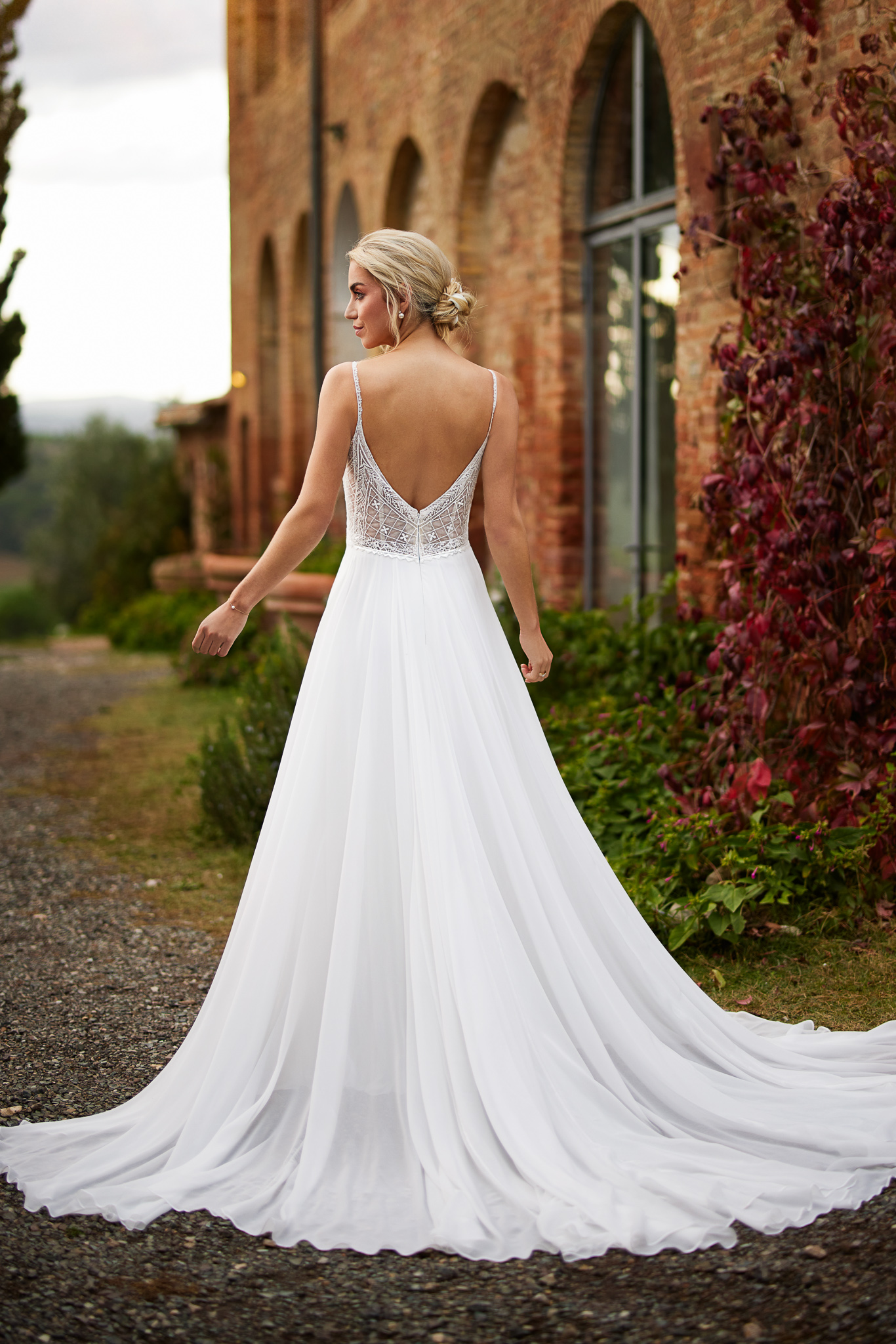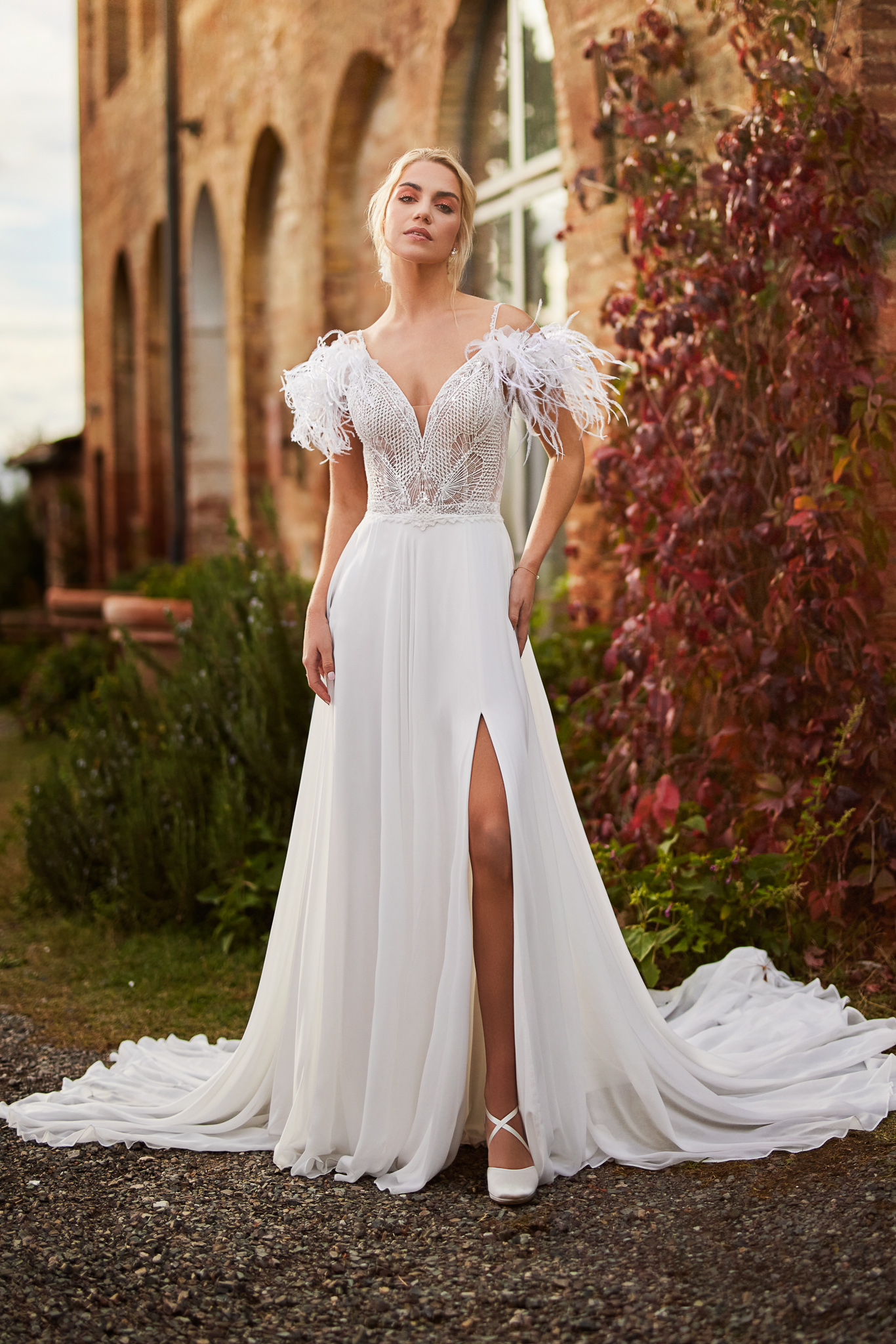 Dieses luxuriöse Brautkleid im Double-Look ist mit eleganten, abnehmbaren Federärmel ausgestattet, um zwischen der Zeremonie und dem Empfang einen anderen Look zu schaffen. Das Mieder ist mit ein glamouröses Spitzendesign gestaltet und bildet vorne einen zarten V-Ausschnitt. Der Rock hat einen Schlitz und besteht aus mehreren Lagen zarter Chiffon gefertigt. Alle Materialdetails anzeigen