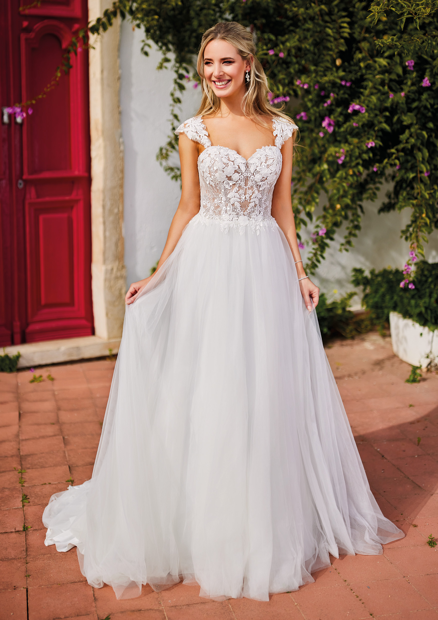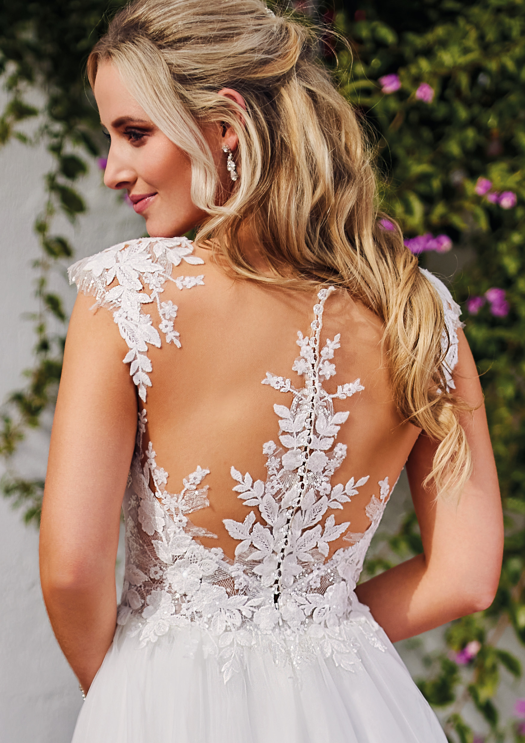 Sanft schwingend und sehr feminin besticht dieses elfenbeinfarbene Brautkleid im A-Linien-Stil durch ein ebenso romantisches wie traditionsverbundenes Erscheinungsbild. Das Mieder hat einen herzförmigen Ausschnitt, es ist mit reichen Spitzendetails überzogen und besticht durch elegante Kappärmel. Die Halslinie und der Rücken sind mit durchsichtigen Spitzenelementen verziert, die an aparte weiße Tattoos erinnern und wirken, als ob die Spitze auf der Haut schweben würde. Ein schlichter, eleganter Rock aus mehreren Lagen Tüll, abgerundet mit einer eleganten Schleppe, verleiht dem Kleid ein romantisches Flair. Alle Materialdetails anzeigen