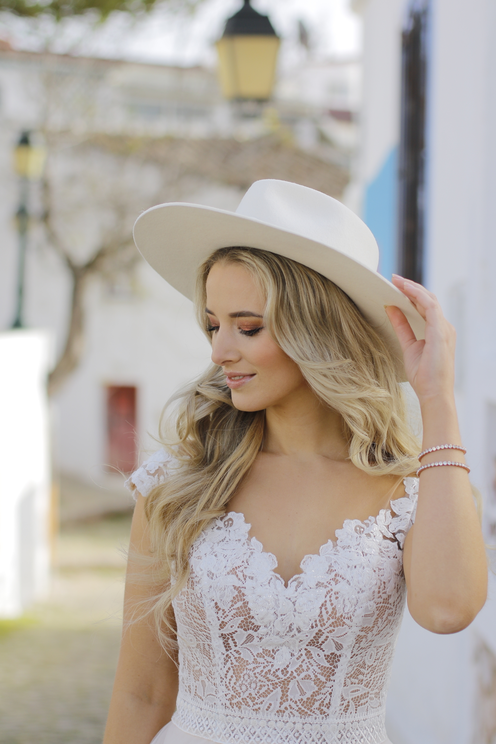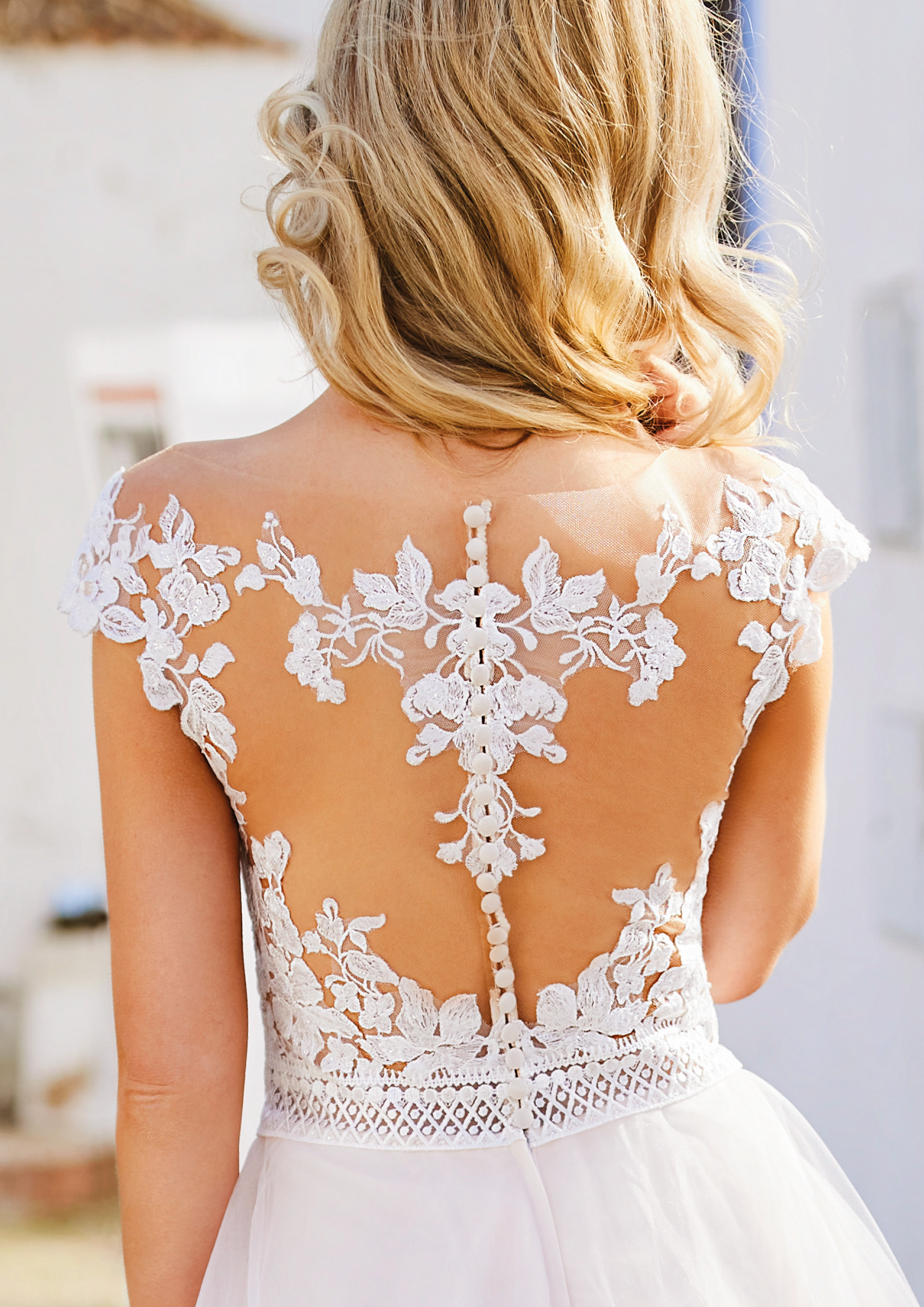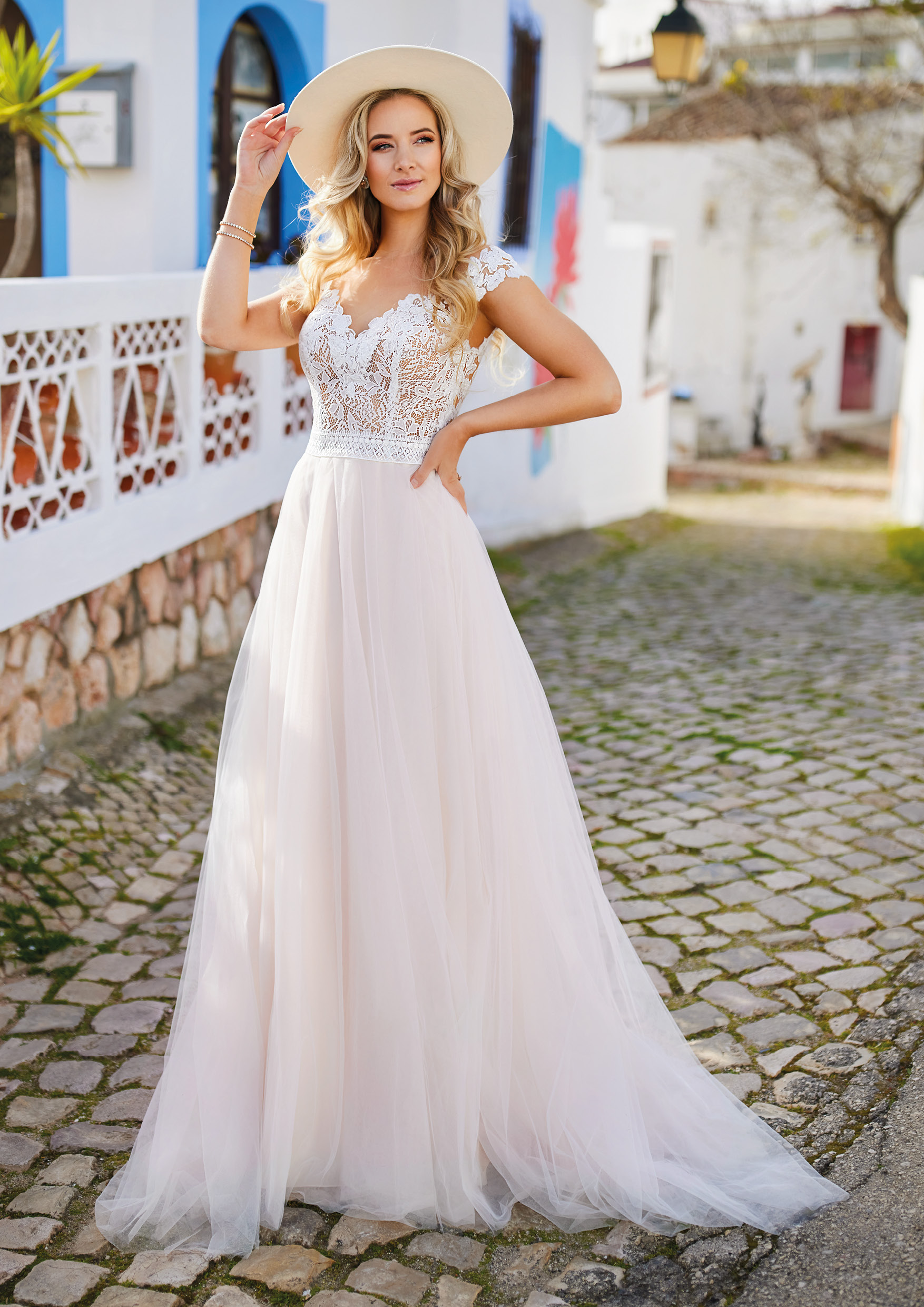 Mehrere Lagen traumhafter Gewebe werden für die Kreation dieses zeitlosen champagnerfarbene Brautkleides im A-Linien-Stil eingesetzt. Das Mieder hat einen herzförmigen Ausschnitt, es ist mit reichen Spitzendetails überzogen und besticht durch elegante Kappärmel. Die Halslinie und der Rücken sind mit durchsichtigen Spitzenelementen verziert, die an aparte weiße Tattoos erinnern und wirken, als ob die Spitze auf der Haut schweben würde. Ein schlichter, eleganter Rock aus mehreren Lagen Tüll, abgerundet mit einer eleganten Schleppe, verleiht dem Kleid ein romantisches Flair. Kombiniere dieses Brautkleid mit einem Hut, um den Look einem Boho-Touch zu verleihen. Dieses Brautkleid ist auch in Elfenbeinfarbe erhältlich. Alle Materialdetails anzeigen