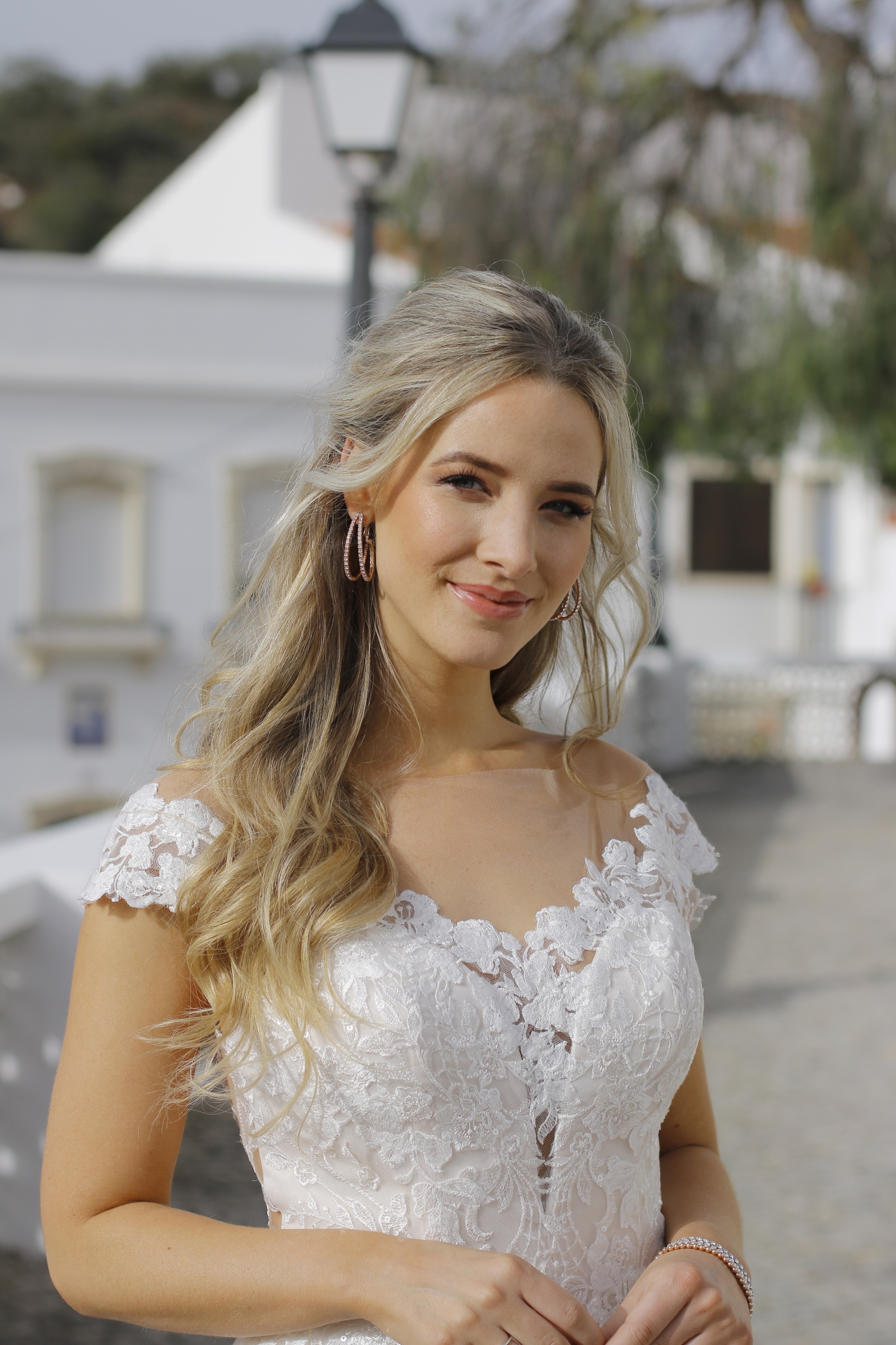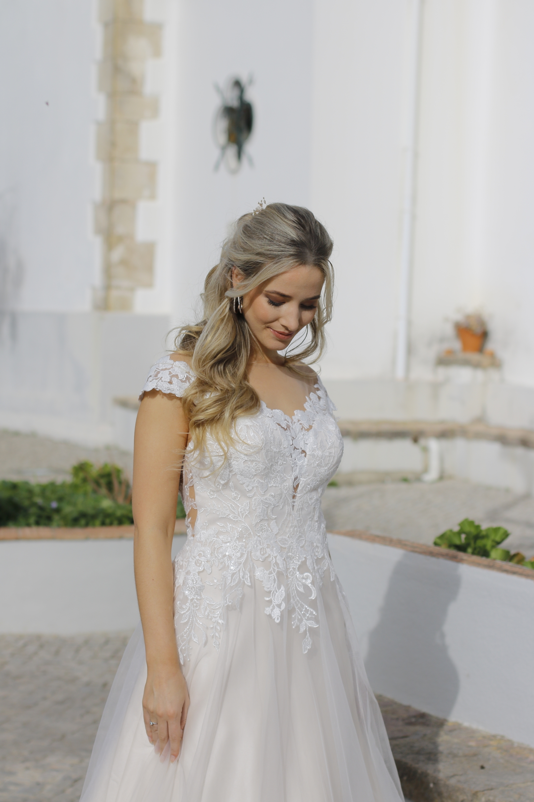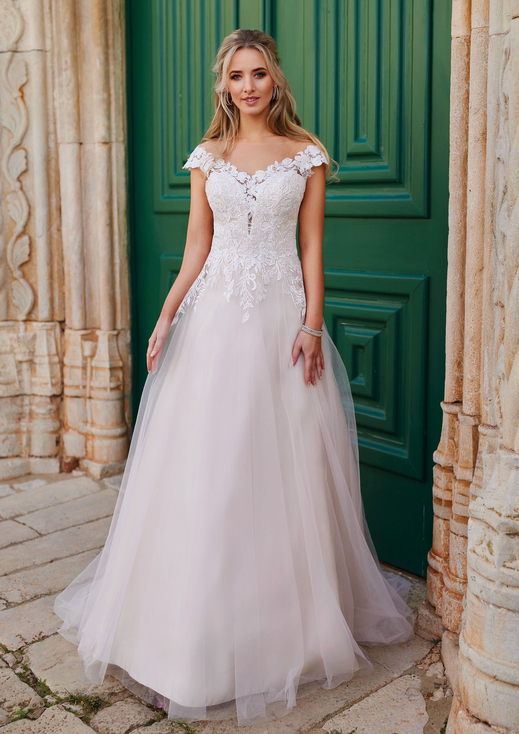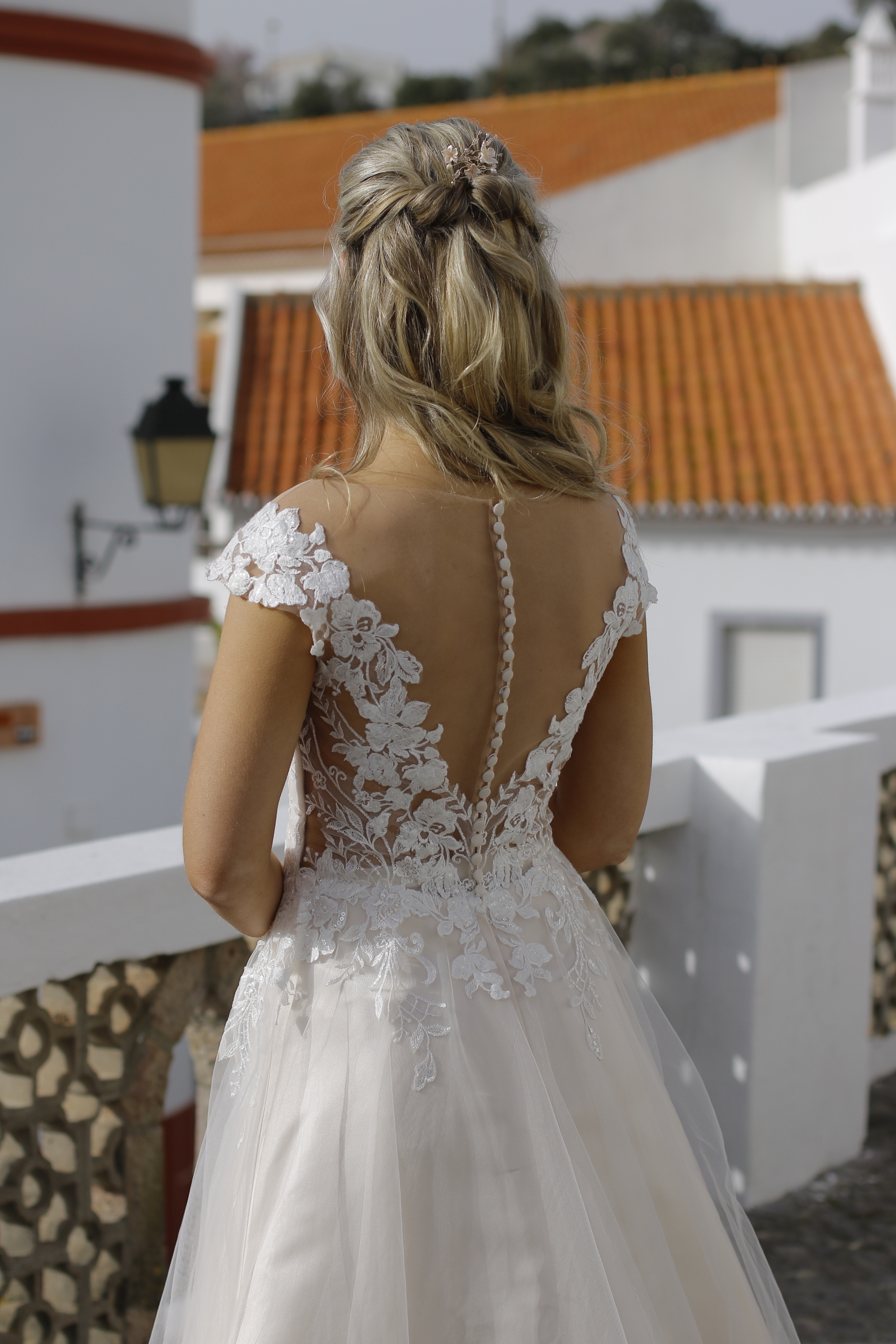 Dieses elegante und moderne champagnerfarbene Brautkleid ist aus mehreren Lagen von traumhafter Gewebe. Die Silhouette im A-Linien-Stil zaubert einen betont romantischen und voluminösen Look. Es hat ein mit Spitze überzogenes Mieder mit einem Sweetheart-Ausschnitt und einen durchsichtigen Einsatz, der dem geschwungenen Bateau-Ausschnitt und schulterfreien Ärmeln Halt gibt. Die Rückenpartie ist mit fantastischen durchsichtigen Spitzenakzenten gearbeitet, die an weiße Tattoos erinnern und wirken, als ob die Spitze auf der Haut schweben würde. Ein schlichter, eleganter Rock aus mehreren Lagen Tüll, abgerundet mit einer eleganten Schleppe, verleiht dem Kleid ein romantisches Flair. Alle Materialdetails anzeigen