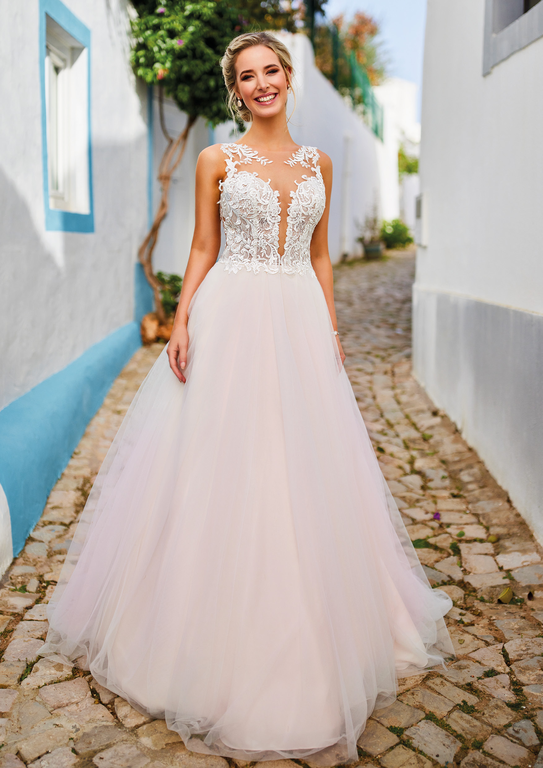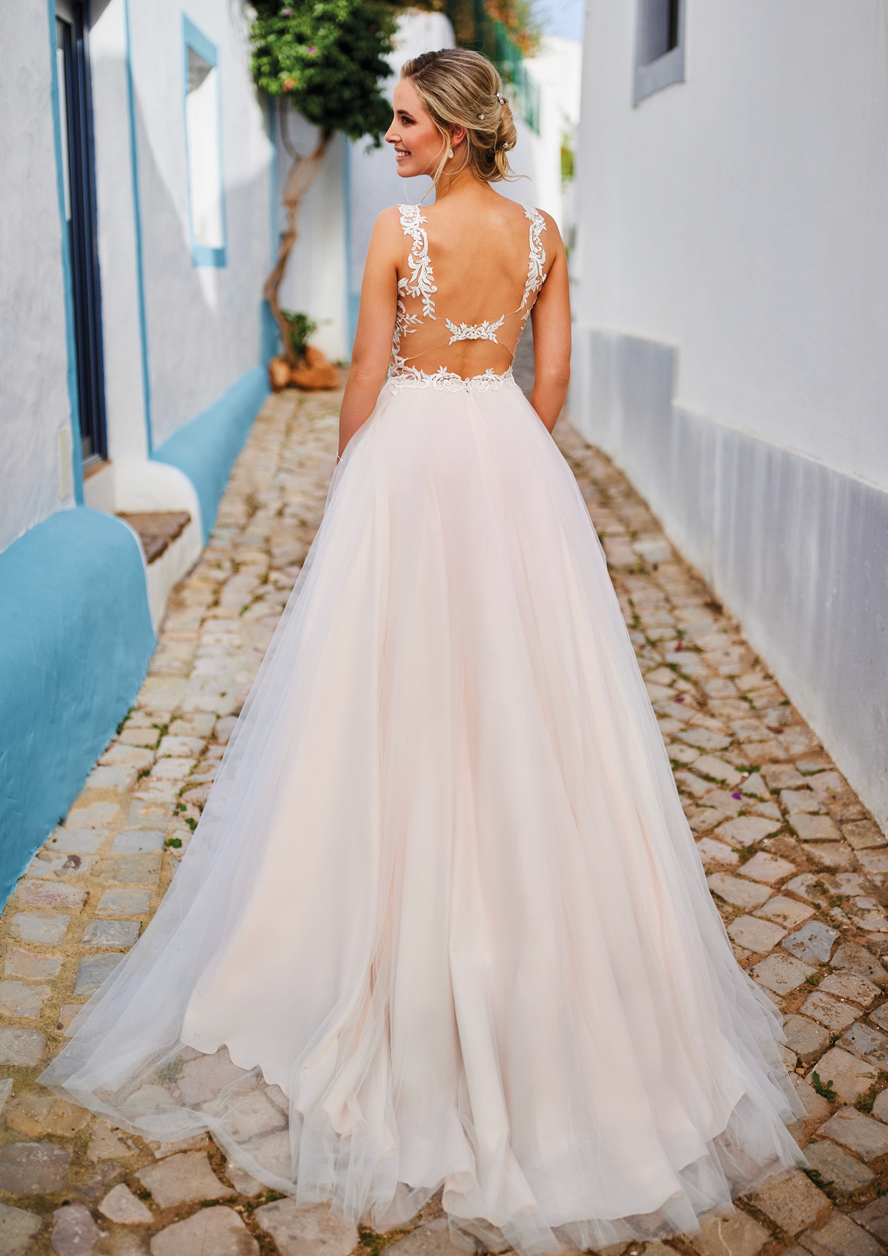 Mehrere Lagen zauberhafter Gewebe werden für die Kreation dieses elegante und moderne champagnerfarbene Brautkleides im A-Linien-Stil eingesetzt. Das Mieder ist mit Spitze überzogen und hat einen herzförmigen- und tiefem V-Ausschnitt. Der ungewöhnliche Rückenakzent in Schlüsselloch-Optik ist mit hautfarbenem Tüll und Spitzenapplikationen gearbeitet. Das Kleid hat elegante Kappärmel mit Blumen floralen Spitzendetails bedeckt. Eine voluminöse Schleppe, die aus mehreren Lagen fließenden Satinstoff und Tüll besteht, rundet das Kleid ab. Auch im Farbton Elfenbein erhältlich. Alle Materialdetails anzeigen