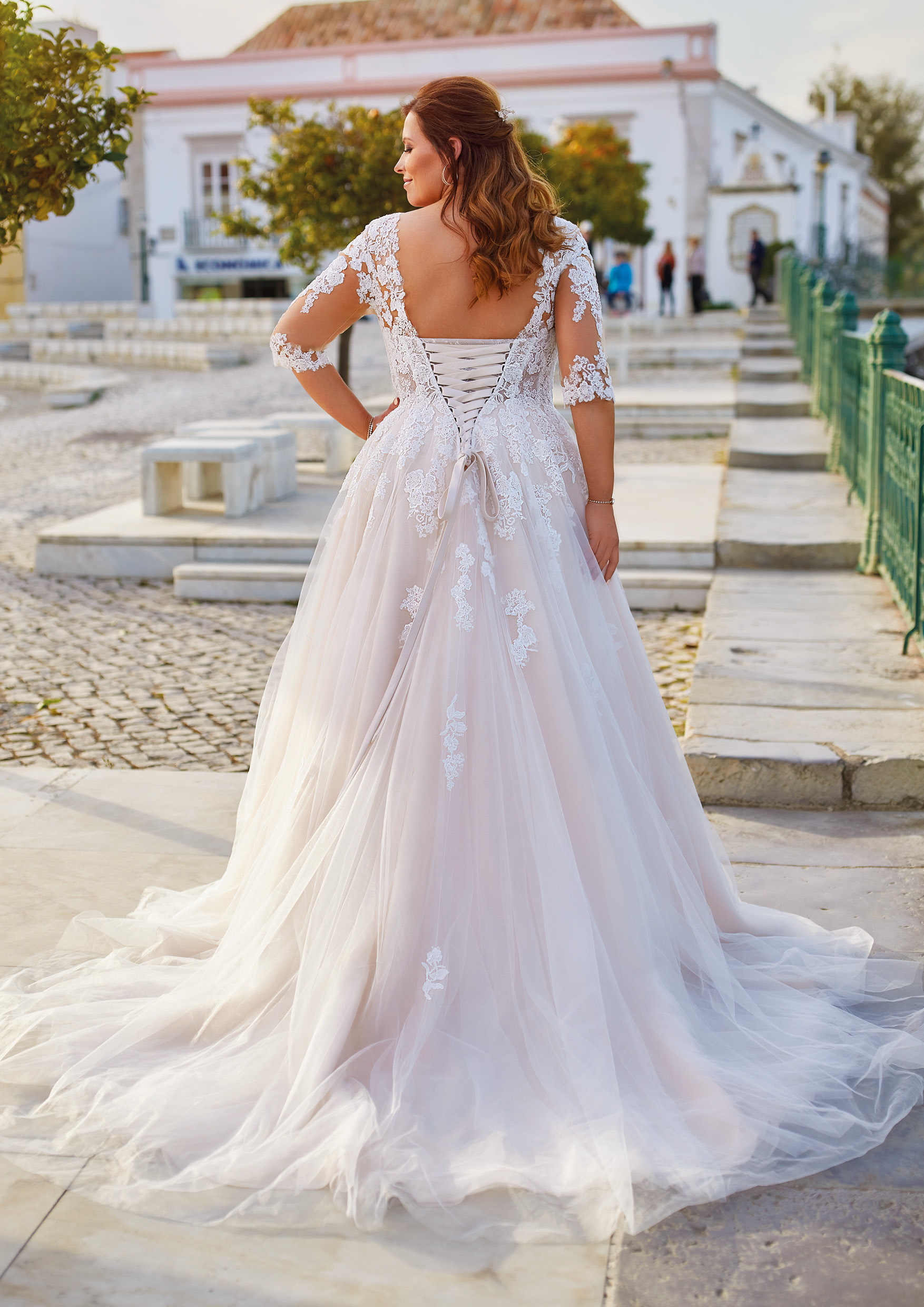 Romantisch, traditionell und elegant ist dieses Brautkleid im Stil A-Linie/Ballkleid für die Plus Size und Curvy Braut. Ein bezauberndes Dekolleté in tiefen V-look entwickelt sein ganzes Flair durch zusätzlich bestickte Spitze, die sich über Vorder- und Rückseite des Mieders hinzieht. Der Spitzenstoff des Miederbereichs geht in die eleganten Dreiviertelärmel über, die aus nudefarbenem Tüll gefertigt und ebenfalls mit filigraner Spitze verziert sind. In der Rückenpartie faszinieren eine zauberhafte Korsettschnürung und ein Rückenakzent in Schlüsselloch-Optik. Das Kleid ist im Rockbereich aus mehreren Lagen Tüll und Stoff gefertigt, die in eine romantische Schleppe auslaufen. Das Kleid ist im Farbton Champagner abgebildet, es ist zudem in Elfenbein erhältlich. Alle Materialdetails anzeigen