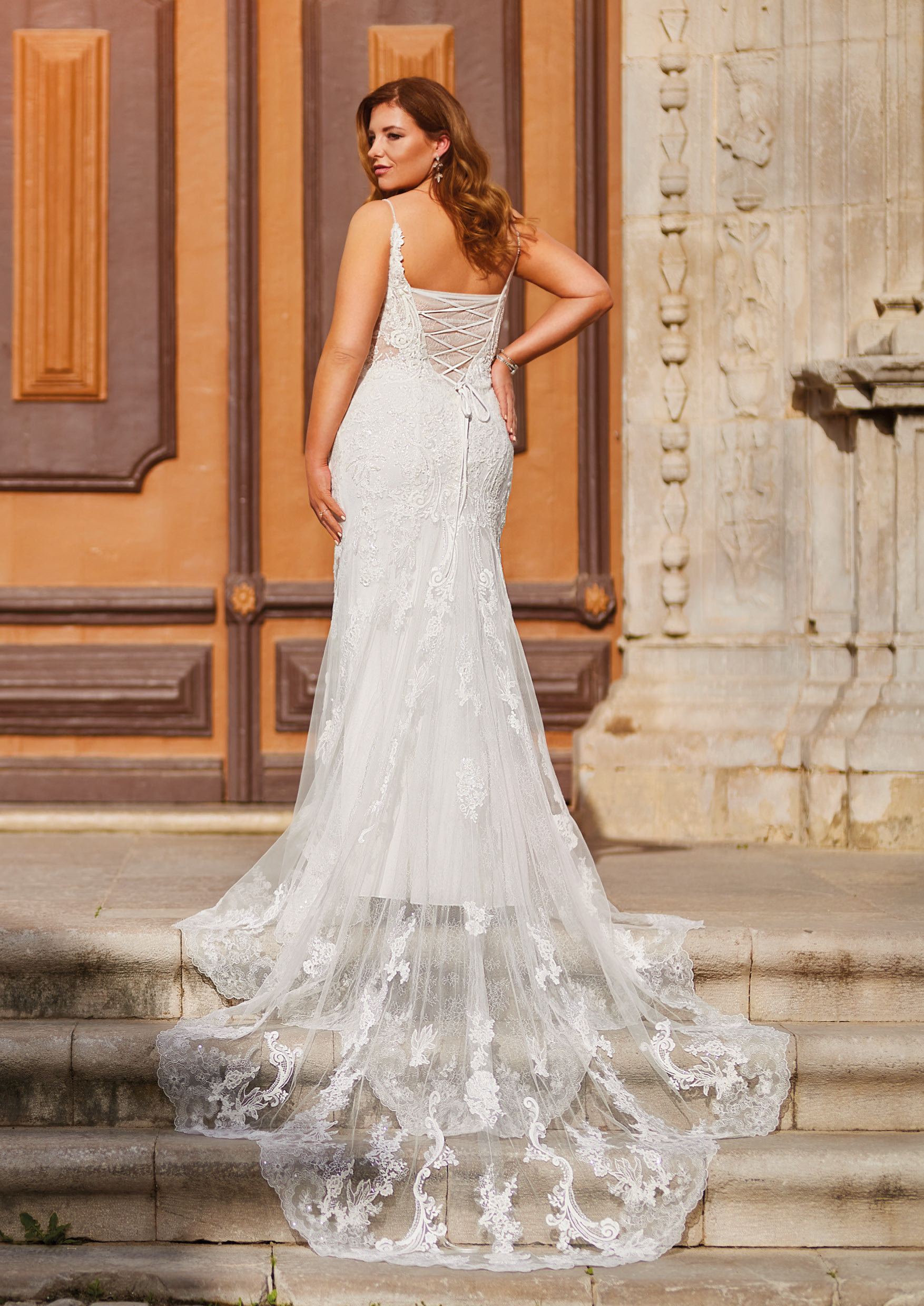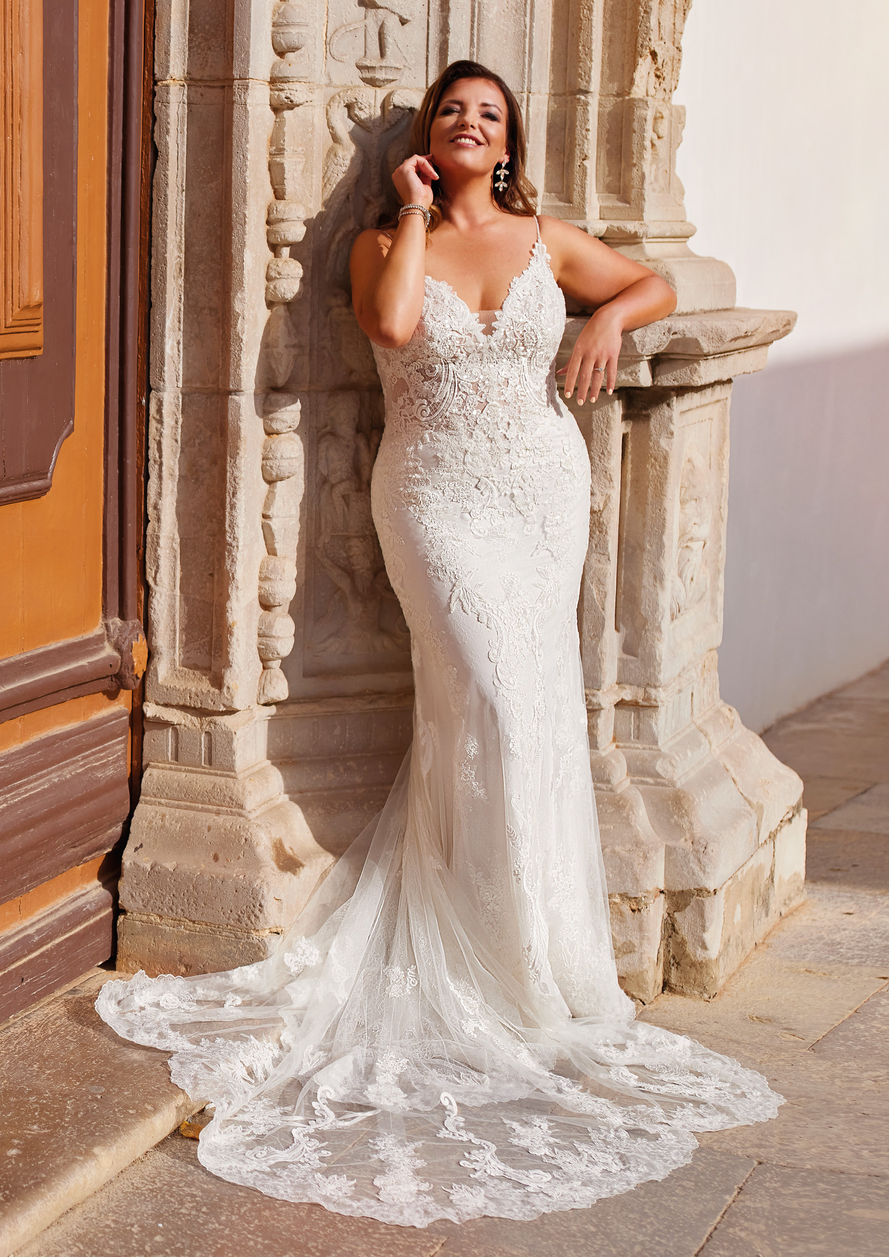 Luxuriös und erlesen wirkt dieses elfenbeinfarbene Brautkleid für die Plus Size und Curvy Braut, das durch traumhafte Allover-Spitze und eine Fit & Flare-Silhouette gekennzeichnet ist. In Vorder partie ist es mit einem V-förmigen Ausschnitt ausgeführt und die Rückseite des Kleides ist mit einer zeitlosen Schnürung akzentuiert. Das Mieder ist vollständig mit bestickten Spitzenapplikationen überzogen, und die schmalen Träger sind mit aparten Spitzedetails verziert. Die Schleppe ist mit den gleichen Spitzenakzenten ausgeführt, wodurch die Abschlüsse eine luxuriöse Optik erhalten. Größe ist nichts weiter als eine Zahl. Alle Materialdetails anzeigen