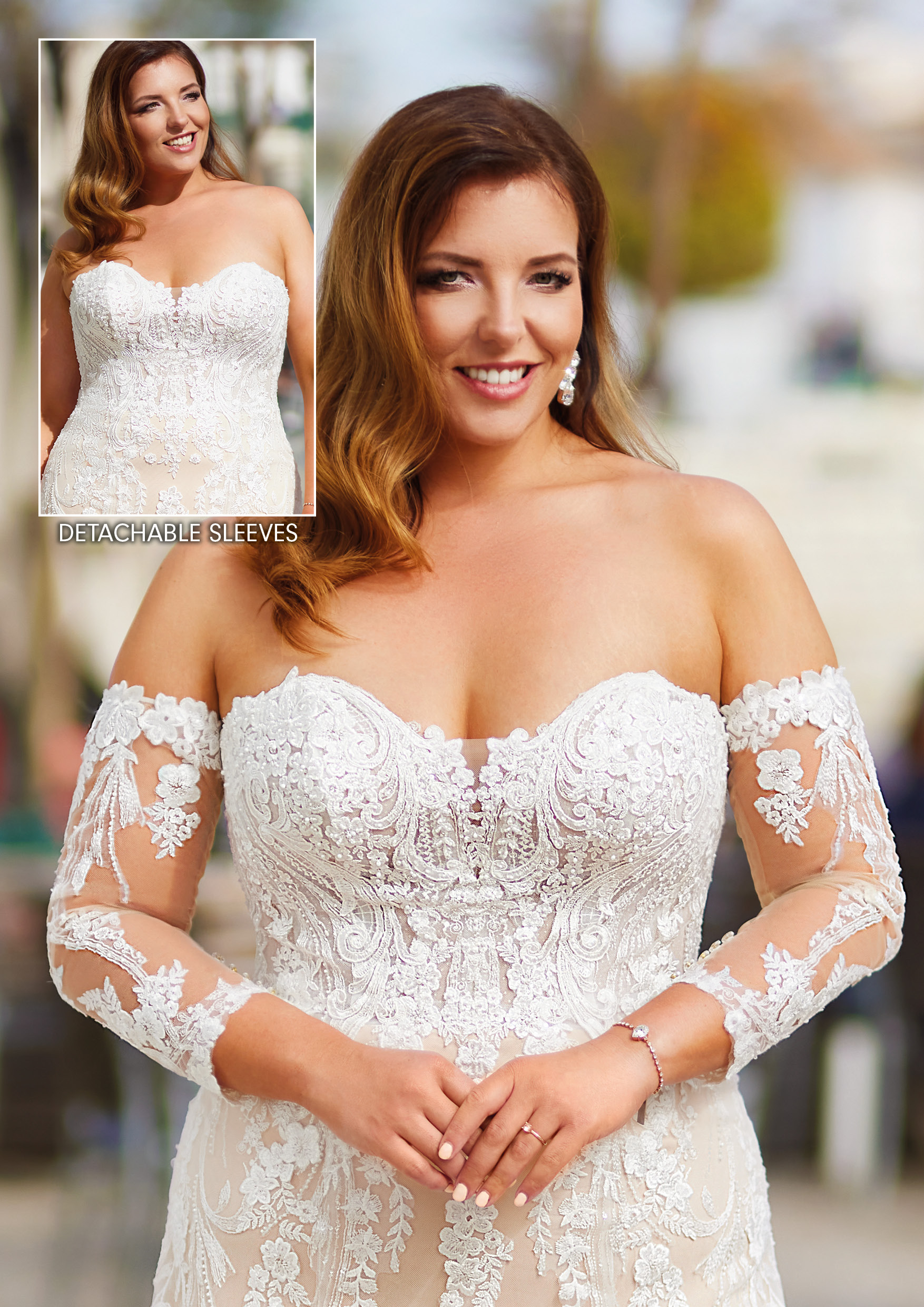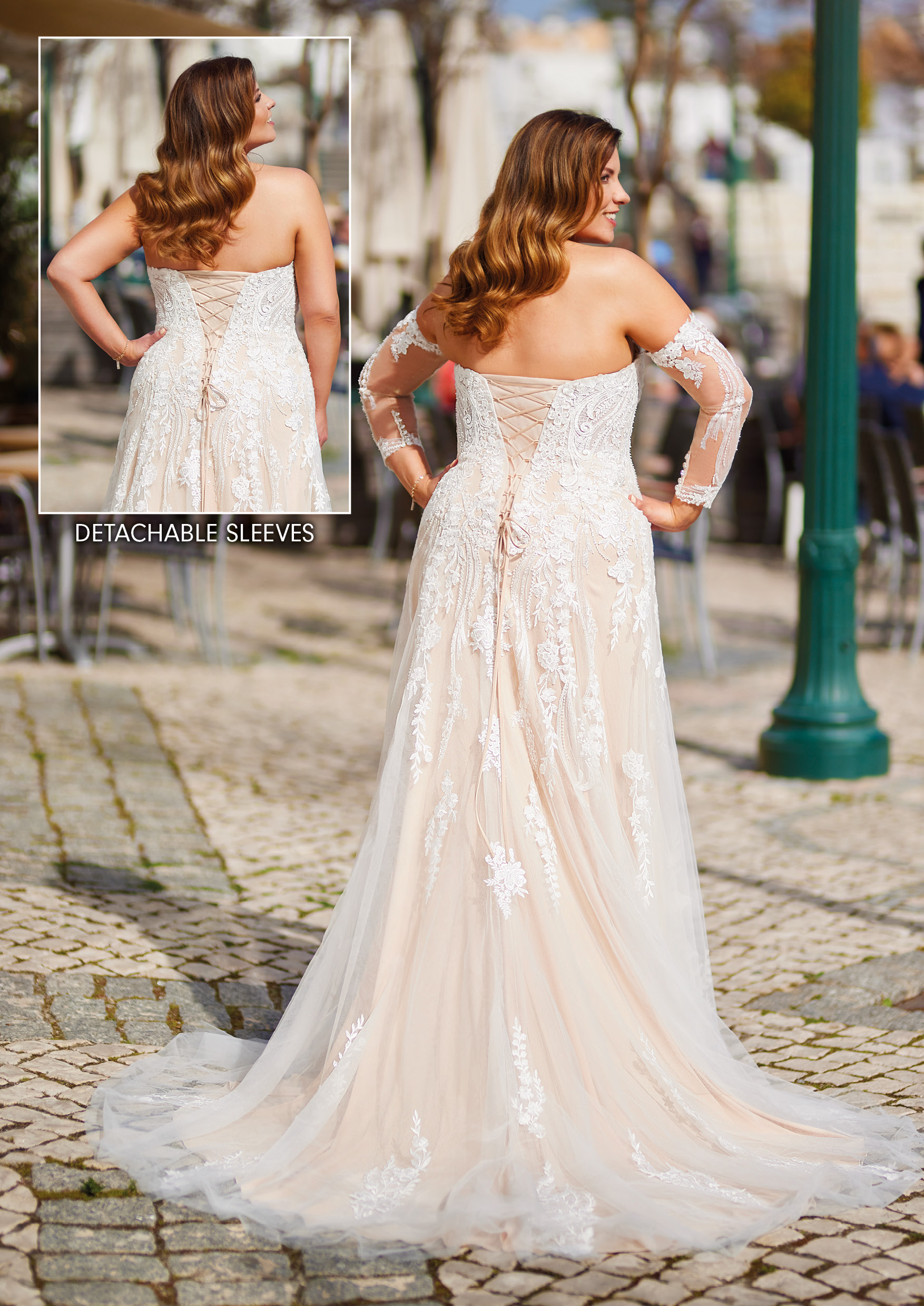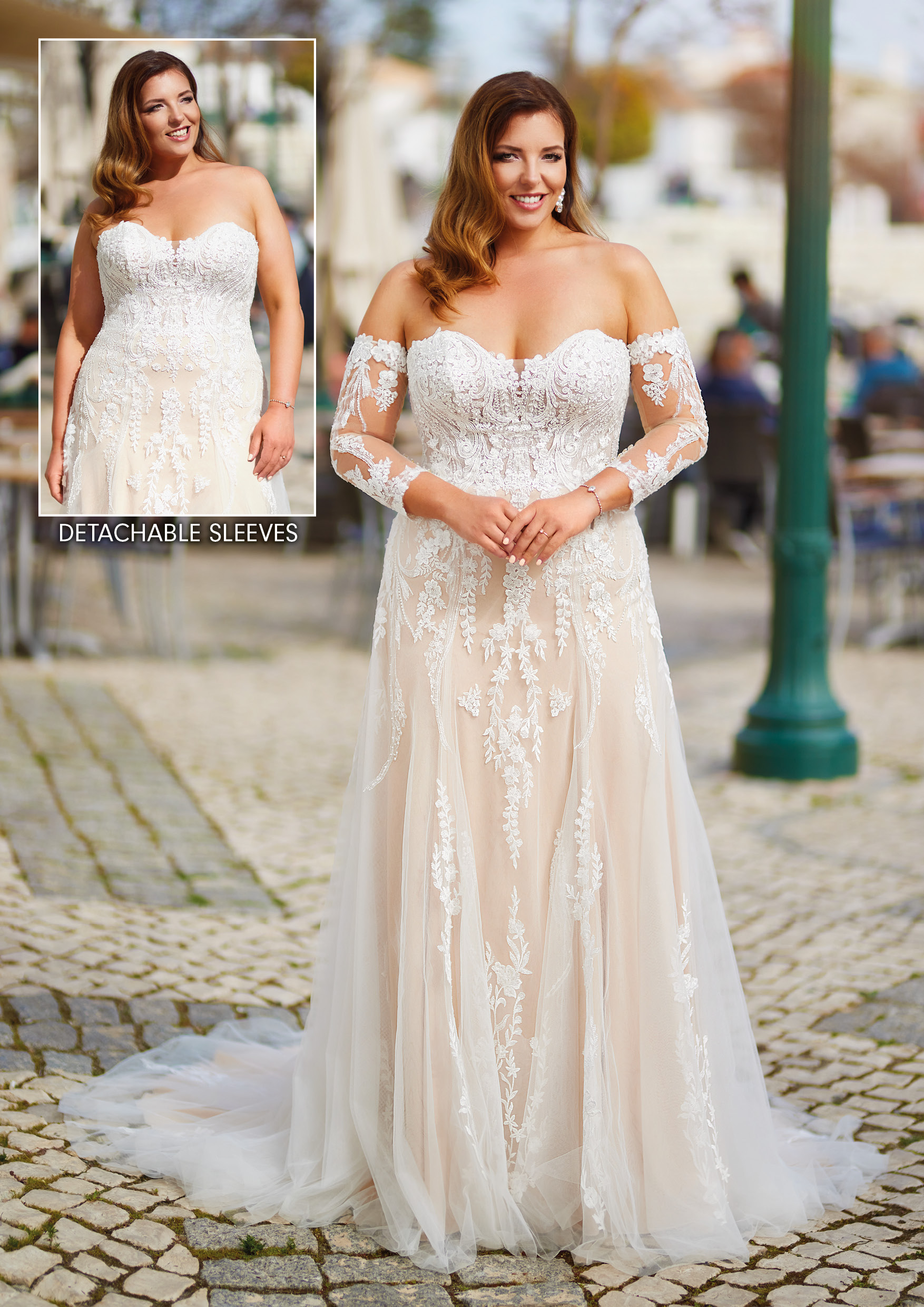Luxuriös und erlesen wirkt dieses champagnerfarbene Brautkleid für die Plus Size und Curvy Braut, das durch traumhafte Allover-Spitze und eine Fit & Flare-Silhouette gekennzeichnet ist. Die Ärmel des Kleides sind abnehmbar, sodass sich zwei fabelhafte Looks kreieren lassen. Das Oberteil mit herzförmigen Ausschnitt und die abnehmbare Ärmel sind mit zauberhaften Spitzendetails ausgeführt. Kleides ist mit einer zeitlosen Schnürung akzentuiert. Der Rock des Kleides läuft in eine bauschige Schleppe aus mehreren Lagen Spitze und Tüllgewebe aus. Mit diesem Kleid werden Träume wahr. Auch im Farbton Elfenbein erhältlich. Alle Materialdetails anzeigen