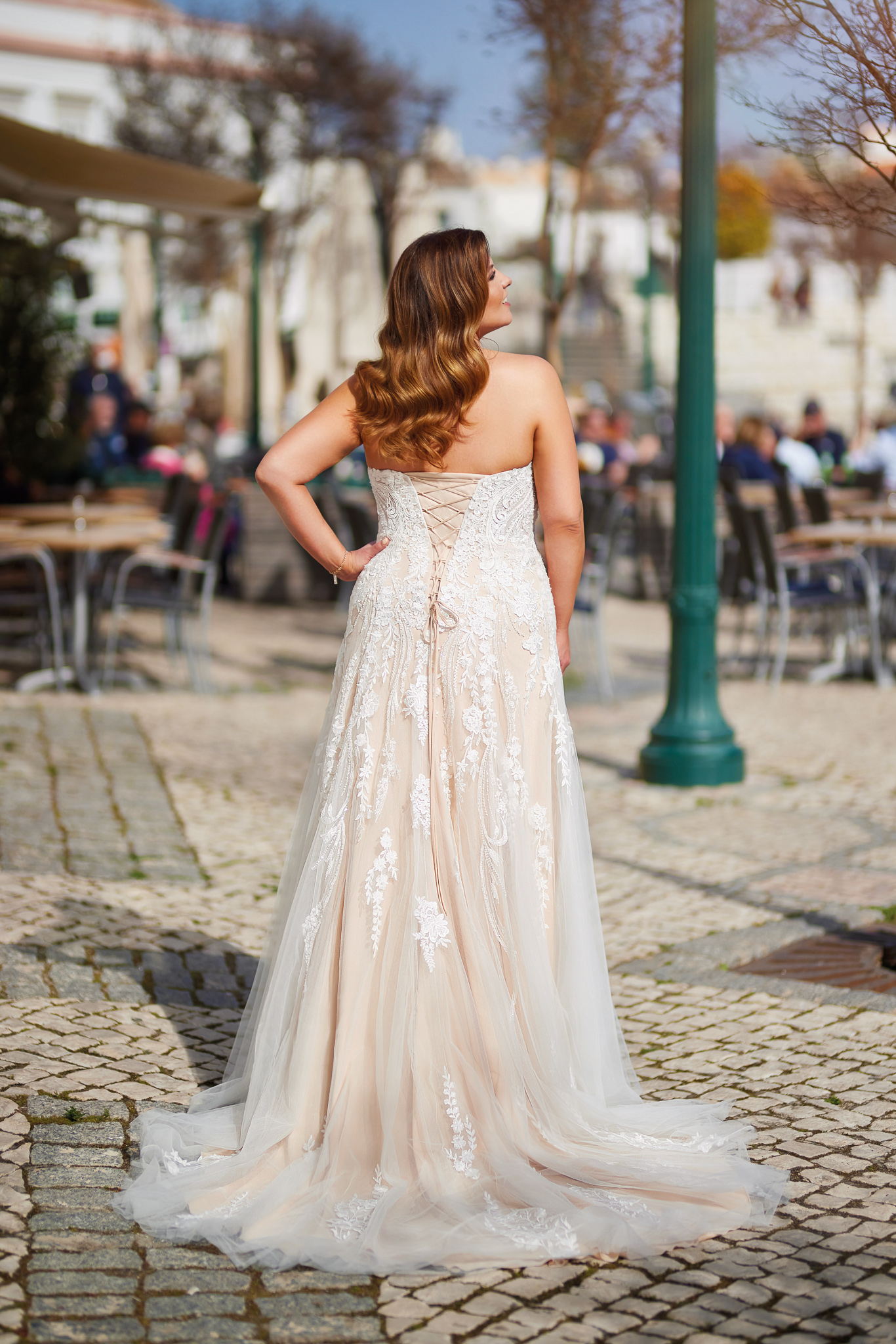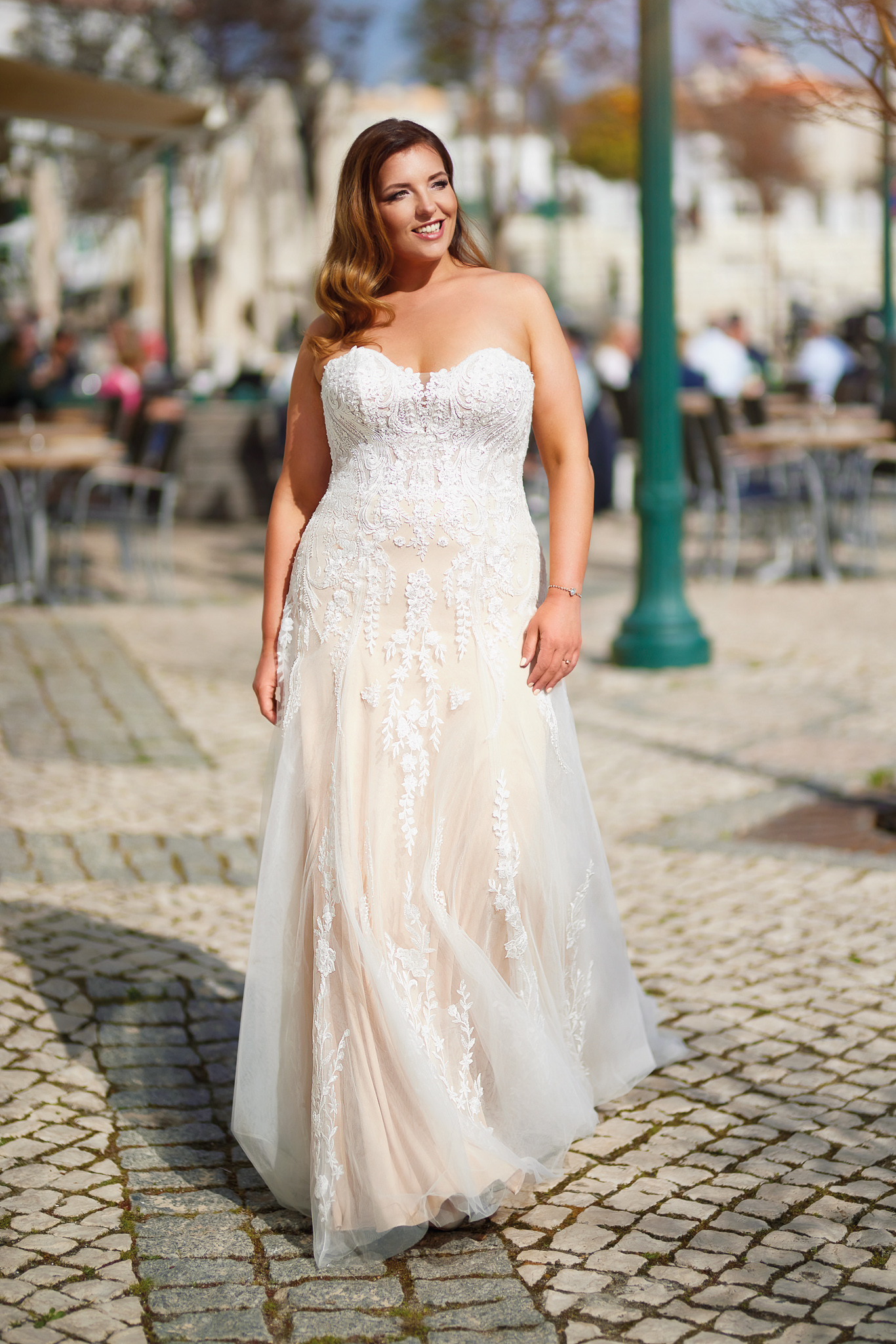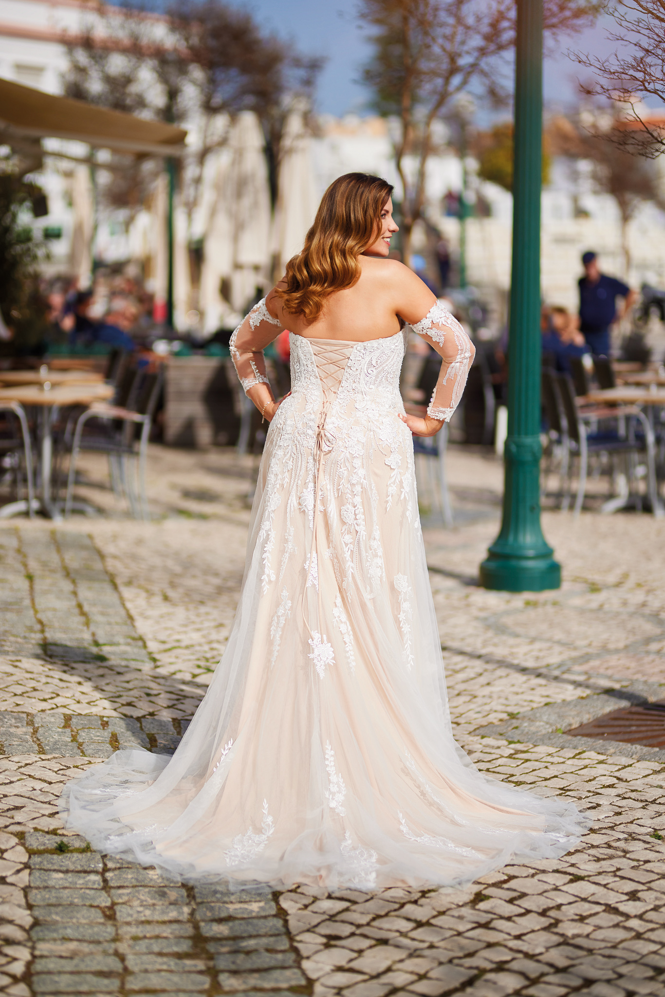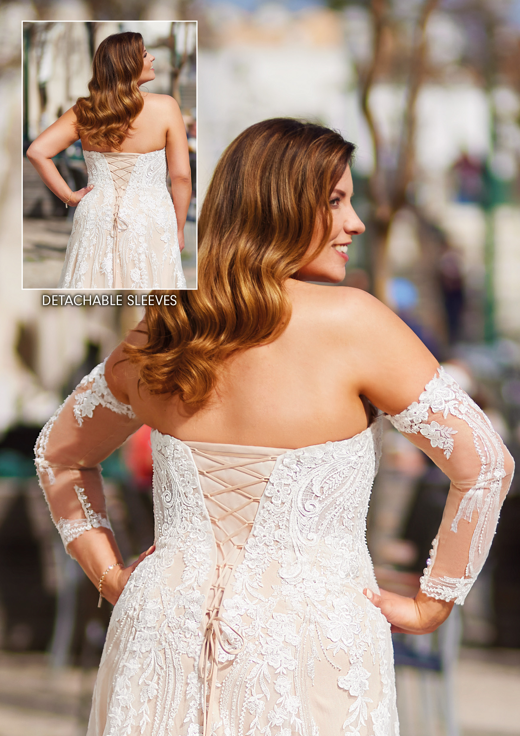 Luxuriös und erlesen wirkt dieses champagnerfarbene Brautkleid für die Plus Size und Curvy Braut, das durch traumhafte Allover-Spitze und eine Fit & Flare-Silhouette gekennzeichnet ist. Die Ärmel des Kleides sind abnehmbar, sodass sich zwei fabelhafte Looks kreieren lassen. Das Oberteil mit herzförmigen Ausschnitt und die abnehmbare Ärmel sind mit zauberhaften Spitzendetails ausgeführt. Kleides ist mit einer zeitlosen Schnürung akzentuiert. Der Rock des Kleides läuft in eine bauschige Schleppe aus mehreren Lagen Spitze und Tüllgewebe aus. Mit diesem Kleid werden Träume wahr. Auch im Farbton Elfenbein erhältlich. Alle Materialdetails anzeigen