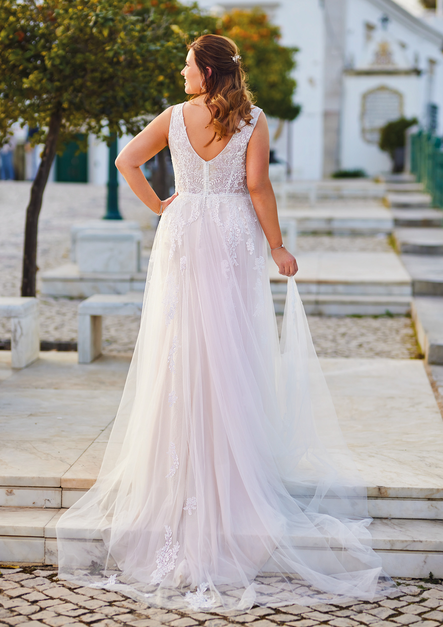 Luxuriös und erlesen wirkt dieses champagnerfarbene Brautkleid für die Plus Size und Curvy Braut, das durch traumhafte Spitzendetails und eine Fit & Flare-Silhouette gekennzeichnet ist. In Vorder- und Rückenpartie ist es mit einem V-förmigen Ausschnitt ausgeführt. Das Mieder ist vollständig mit bestickten Spitzenapplikationen überzogen. Die obere Lage des Rockes bezaubert durch den gleichen Spitzenakzenten, die diesem Kleid seinen besonderen Charme verleiht. Der Rock läuft in eine bauschige Schleppe aus mehreren Lagen Tüllgewebe aus. Auch im Farbton Elfenbein erhältlich. Alle Materialdetails anzeigen