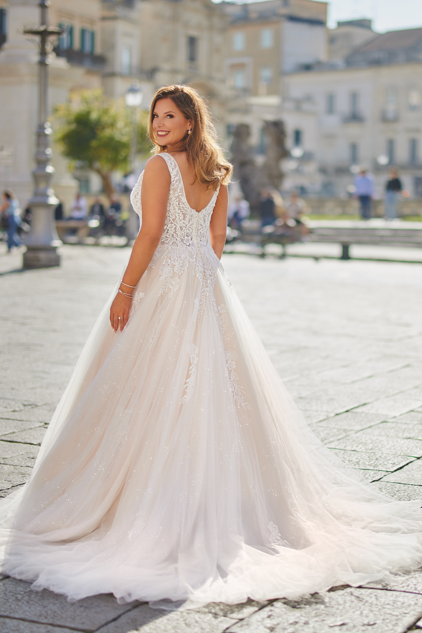 Dieses feminine und elegante Plus-Size-Brautkleid hat ein halbtransparentes Mieder mit V-Ausschnitt. Mehrere Lagen mit Spitzenapplikationen enden knapp unterhalb der Taille. Der Rock ist aus mehreren Lagen geschmeidigem Tüll über Satin gefertigt. Alle Materialdetails anzeigen