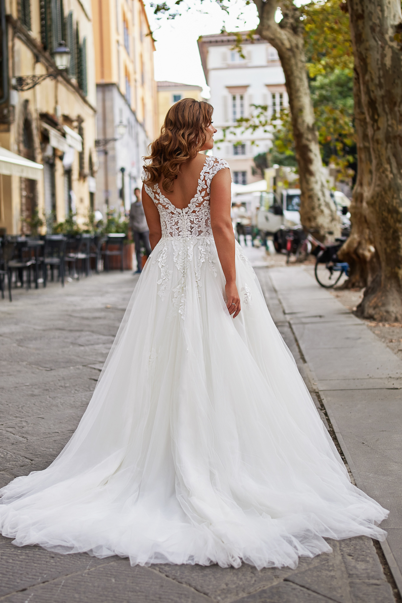 Dieses elegante und romantische Plus-Size-Brautkleid ist mit wunderschönen Spitzenapplikationen auf einem Mieder mit V-Ausschnitt und eine eleganten durchsichtigen Kappenärmeln gestaltet. Der Rock besteht aus mehreren Lagen sanft fließendem Tüll. Alle Materialdetails anzeigen