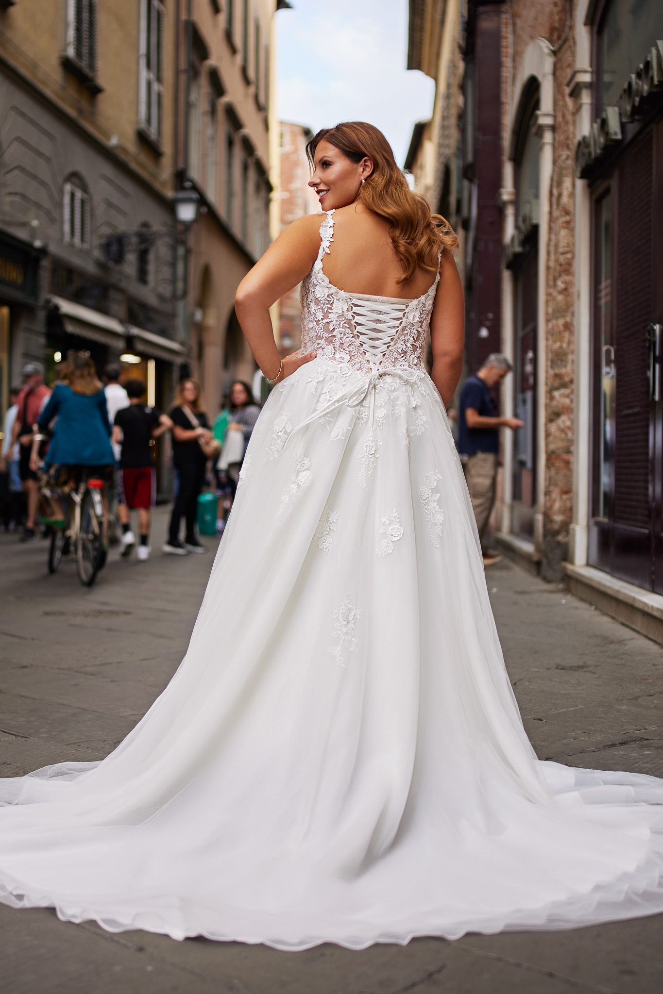 Dieses elegante Plus-Size-Brautkleid im Double-Look ist mit luxuriösen transparente abnehmbaren Ärmeln ausgestattet, um zwischen der Zeremonie und dem Empfang einen anderen Look zu schaffen. Das V-förmige Oberteil ist mit eleganten Spitzenapplikationen und dünnen Trägern verziert. Der Rock besteht aus mehreren Lagen Tüll, Organza und Satin. Alle Materialdetails anzeigen