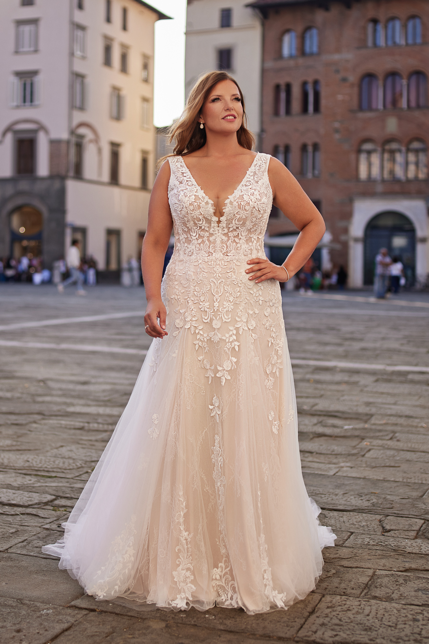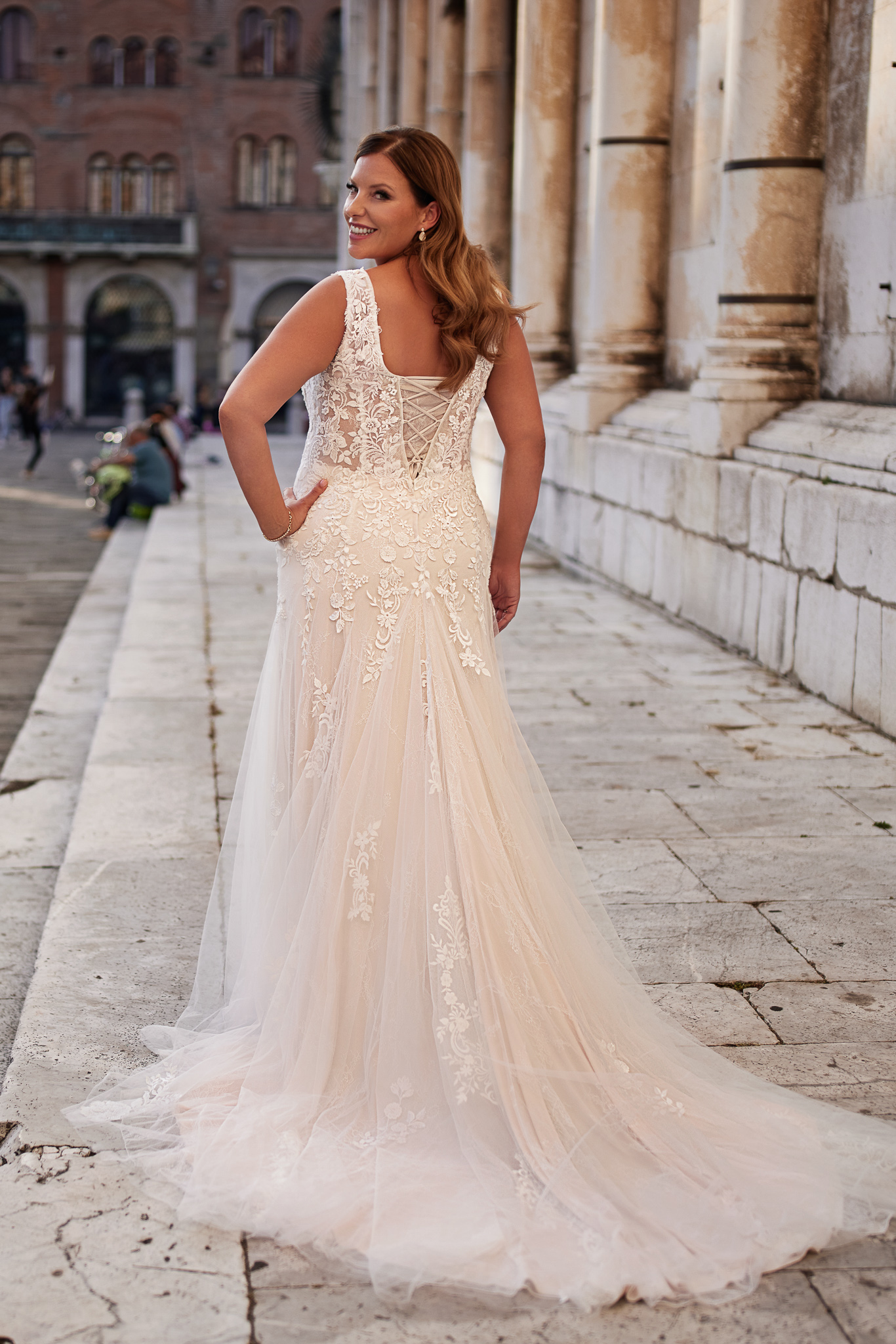 Luxuriös und erlesen wirkt dieses Brautkleid für die Plus Size und Curvy Braut, das durch traumhafte Allover-Spitze und eine Fit & Flare-Silhouette gekennzeichnet ist. In Vorder partie ist es mit einem V-förmigen Ausschnitt ausgeführt und die Rückseite des Kleides ist mit einer zeitlosen Schnürung akzentuiert. Das Mieder ist vollständig mit bestickten Spitzenapplikationen überzogen. Die Schleppe ist mit den gleichen Spitzenakzenten ausgeführt, wodurch die Abschlüsse eine luxuriöse Optik erhalten. Größe ist nichts weiter als eine Zahl. Alle Materialdetails anzeigen