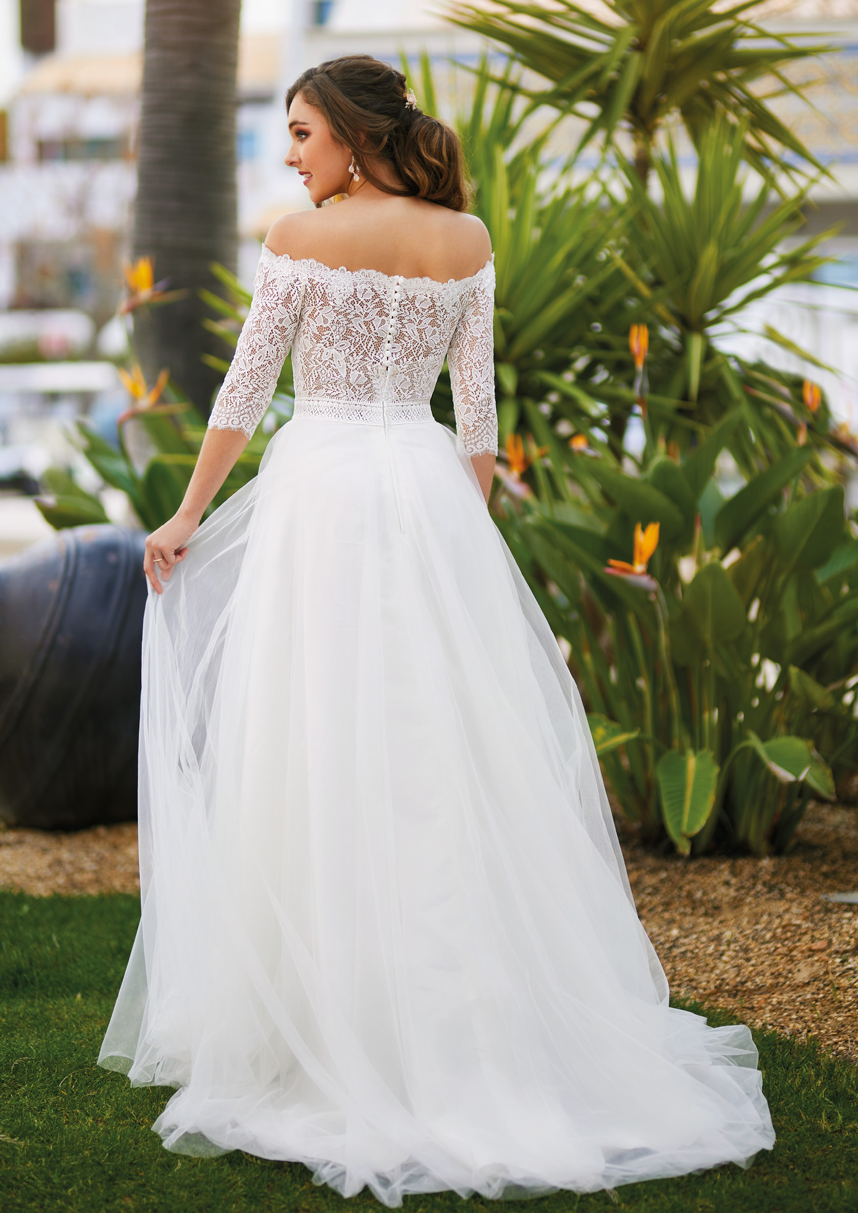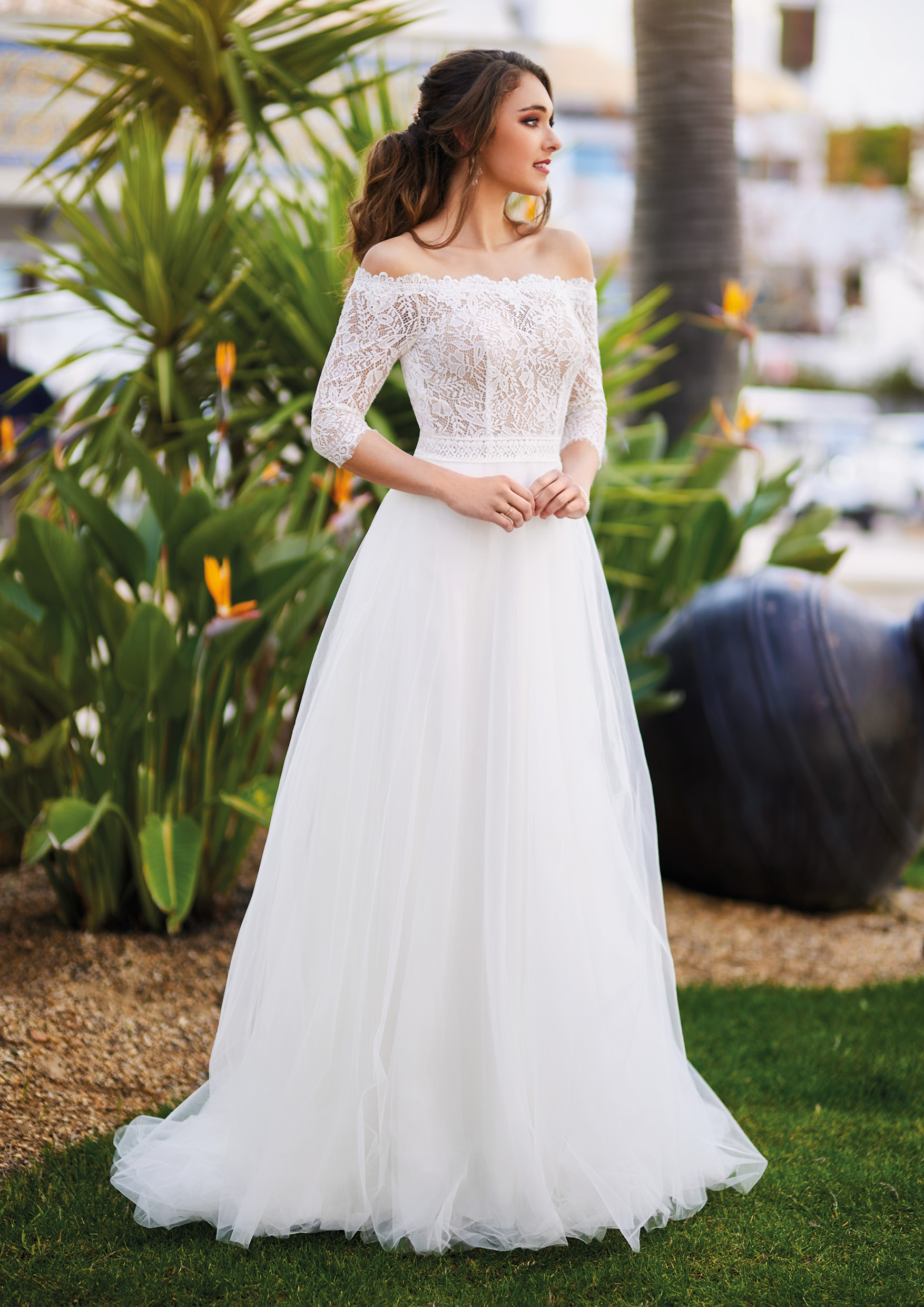 Dieses elegante und romantische elfenbeinfarbene Brautkleid im A-Linien-Stil bezaubert durch ein schulterfreies Dekolleté. Der Spitzenstoff des Miederbereichs geht in die eleganten Dreiviertel-Ärmel über. Das Kleid hat eine voluminöse Schleppe, die aus mehreren Lagen fließenden Tüll besteht, und den perfekten Braut-Look vollkommen abrundet. Auch im Farbton Elfenbein erhältlich.
