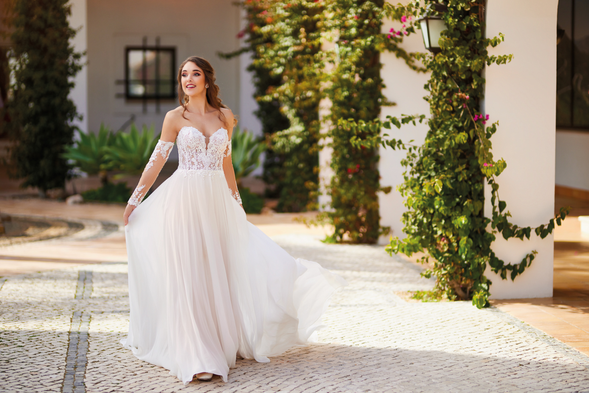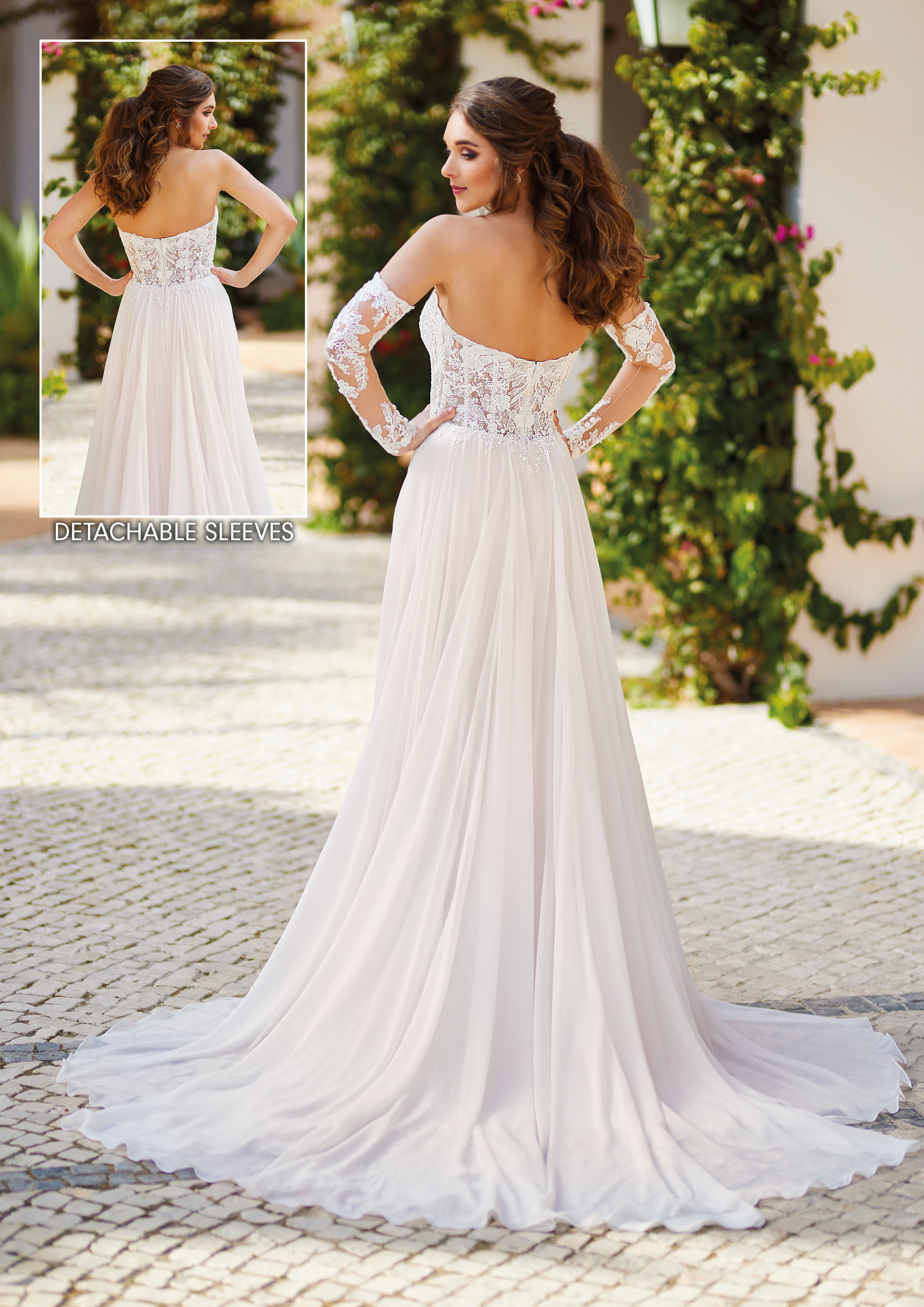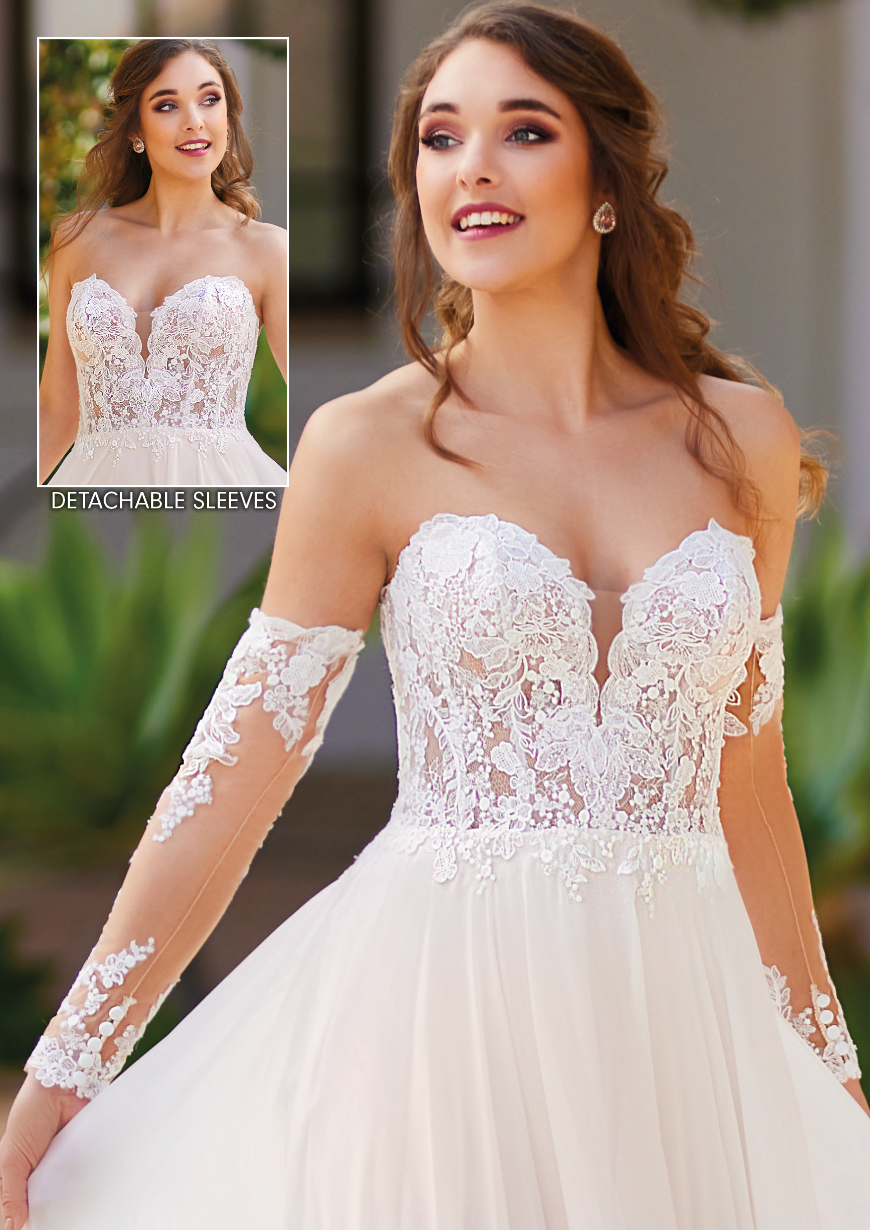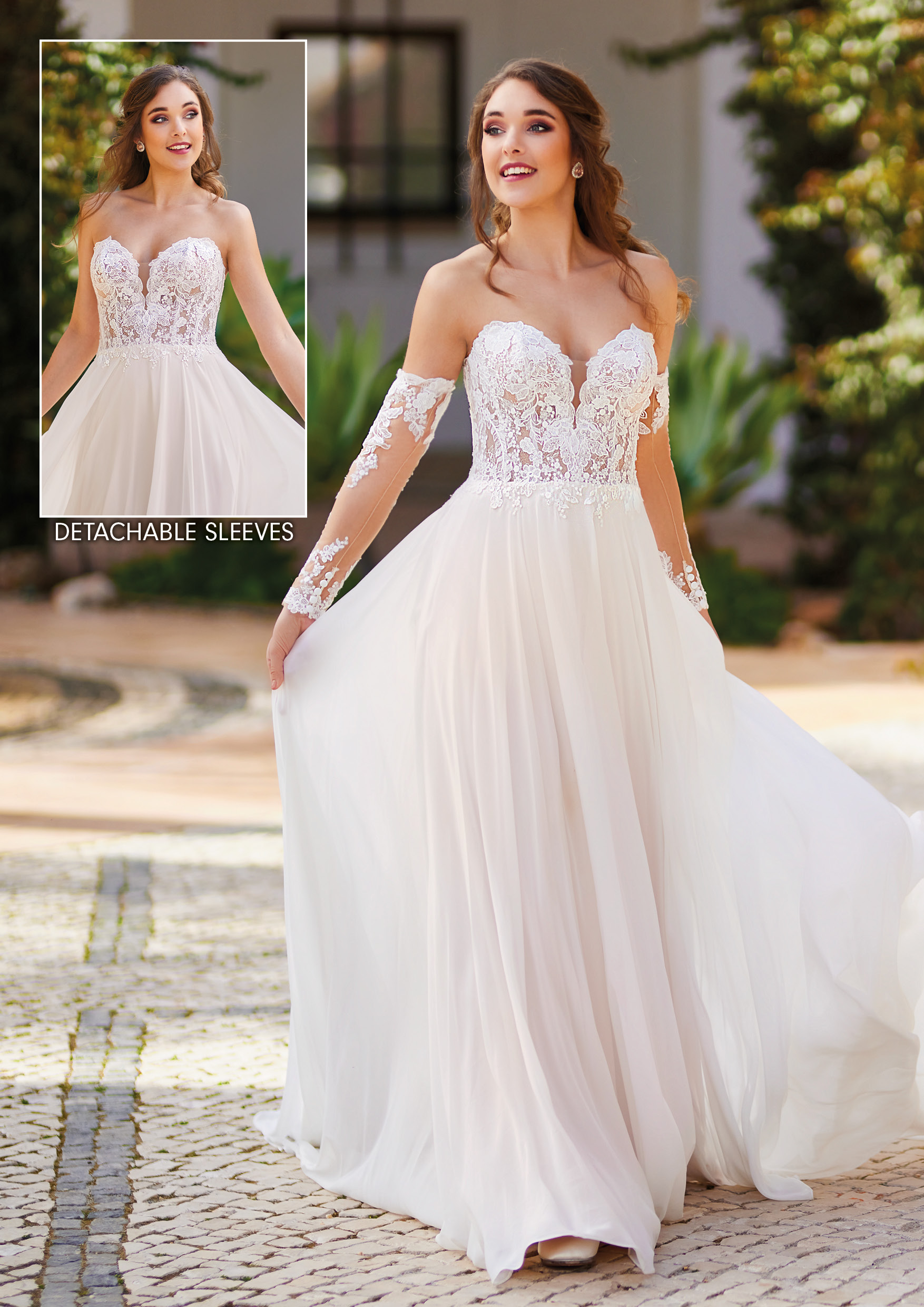 Dieses romantische und einzigartige Brautkleid im A-Linien-Stil und Empire-silhouette hat viele Möglichkeiten. Die Ärmel des Kleides sind abnehmbar, sodass sich zwei fabelhafte Looks kreieren lassen. Das Oberteil mit herzförmigen Ausschnitt und die abnehmbare Ärmel sind mit zauberhaften Spitzendetails ausgeführt. Der Rock besteht aus mehrere Lagen Chiffonstoff, die dem Kleid ein romantisches Flair verleihen. Den hinteren Abschluss des Kleides bildet eine märchenhaft romantische Schleppe, die sanft mit Ihren Bewegungen mitschwingt und den perfekten Braut-Look vollendet. Das Kleid ist im Farbton Champagner abgebildet, es ist zudem in Elfenbein erhältlich.