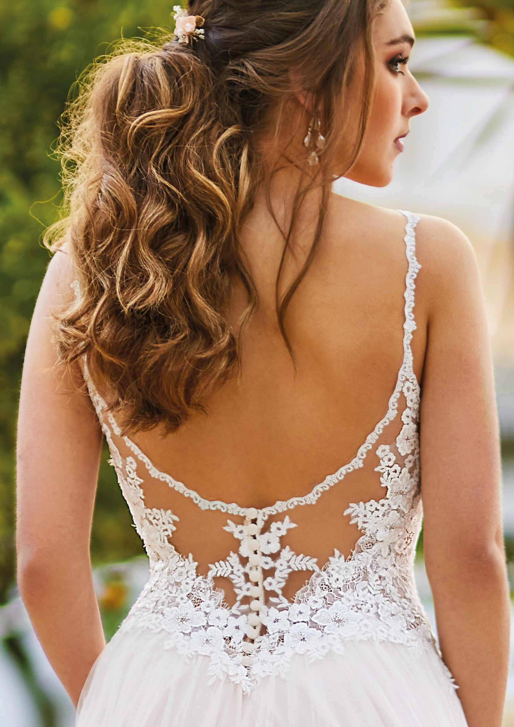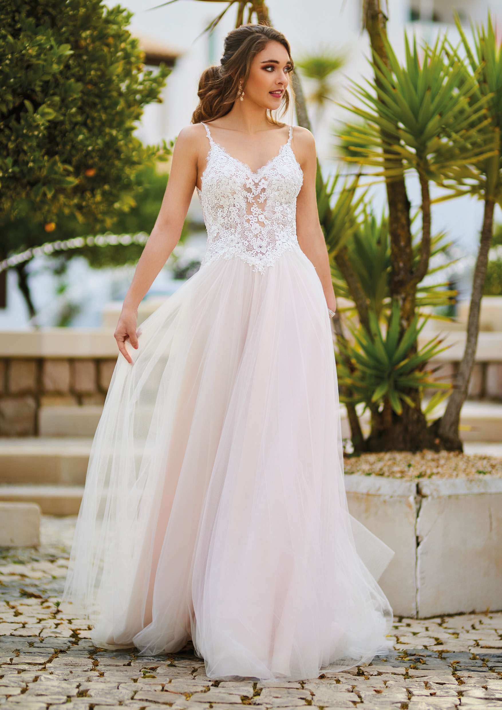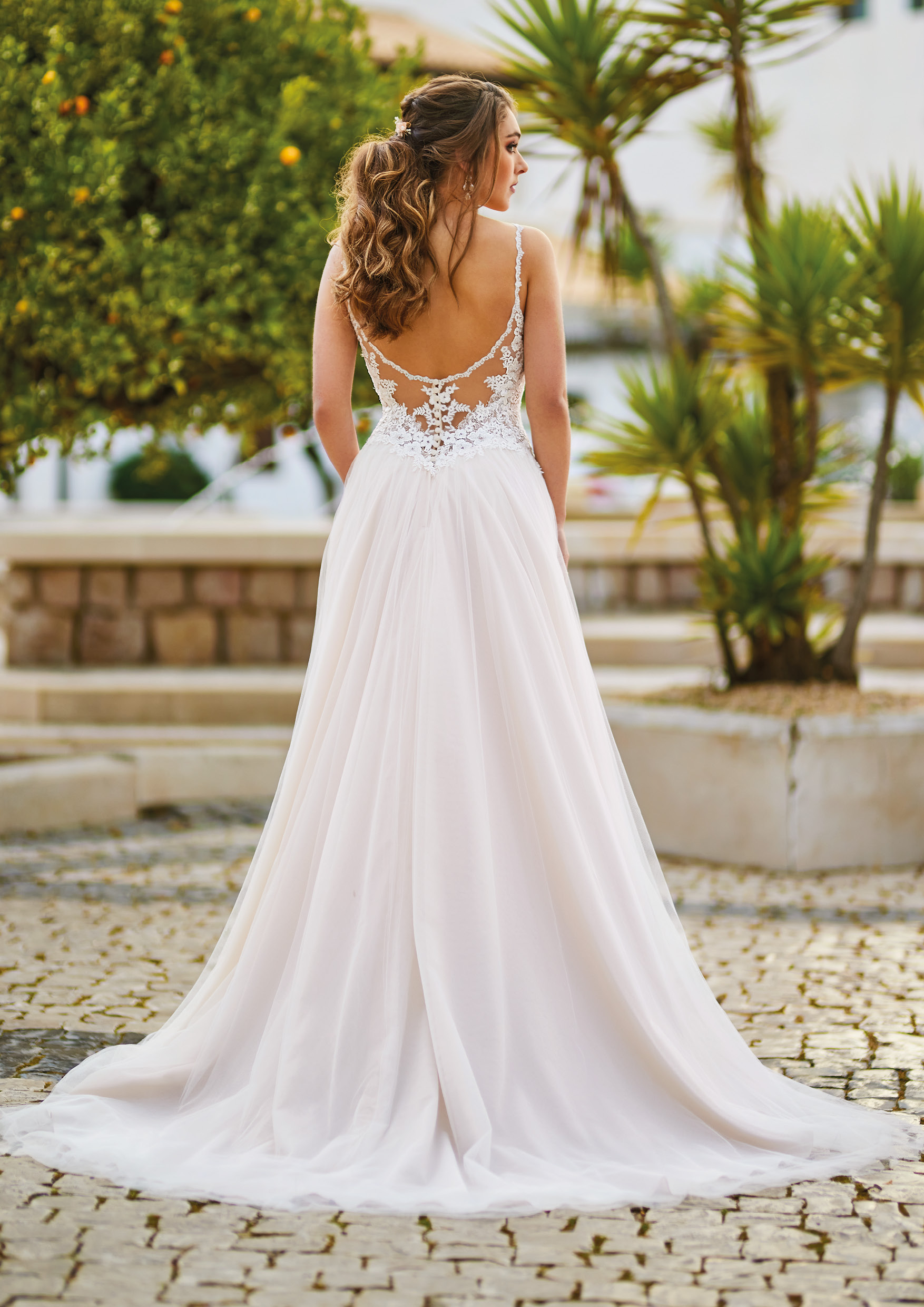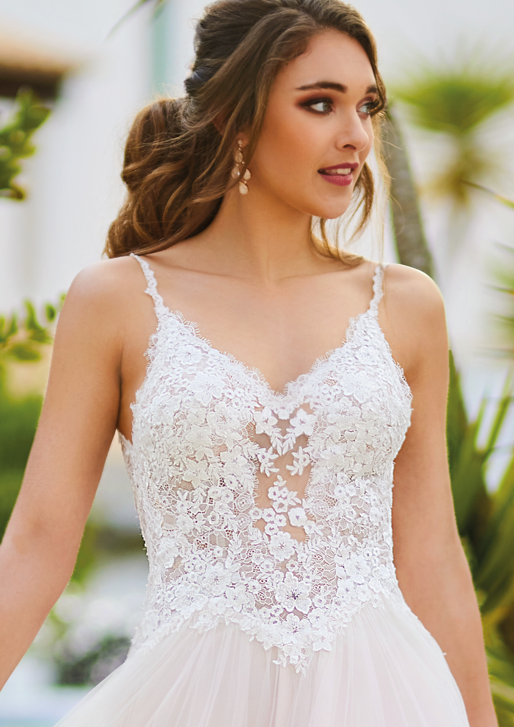 Romantisch und außergewöhnlich apart ist die Ausstrahlung dieses Brautkleides im A-Linien-Stil. Es besticht durch ein in Vorder- wie Rückenpartie V-förmig ausgeschnittenes Mieder mit schmalen Trägern. In einem faszinierenden Bild ziehen sich bestickte Spitzenapplikationen in einem V-form über die Taille hin. Eine zauberhafte, sanft fließende Schleppe aus mehrlagigem Tüll vollendet die Optik des Rockes. Nicht zuletzt eine Lage glitzernden Tülls und Gewebe trägt zu dem ausgesprochen feinen Flair dieses Hochzeitskleides bei. Das Kleid ist im Farbton Champagner abgebildet, es ist zudem in Elfenbein erhältlich. Alle Materialdetails anzeigen