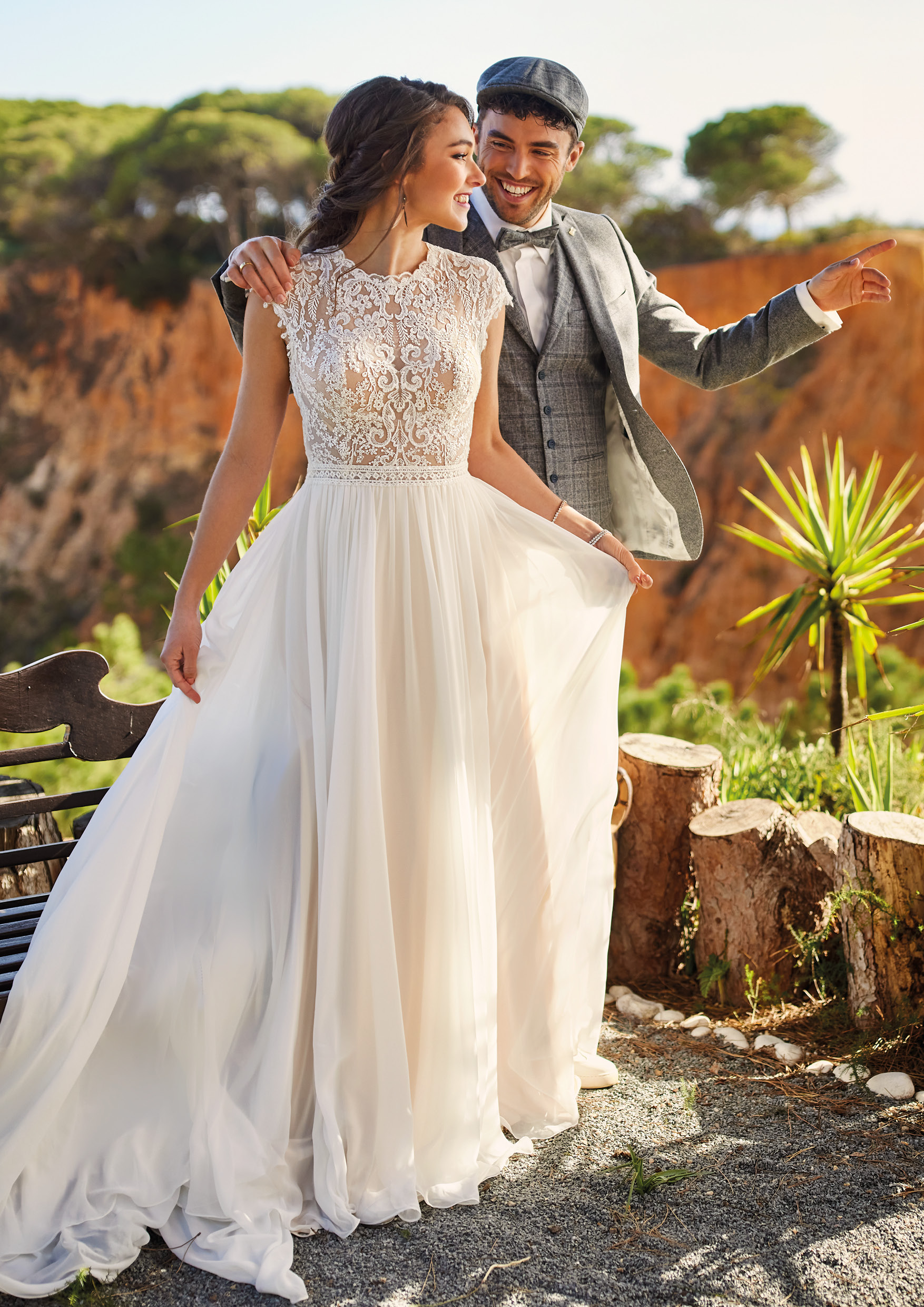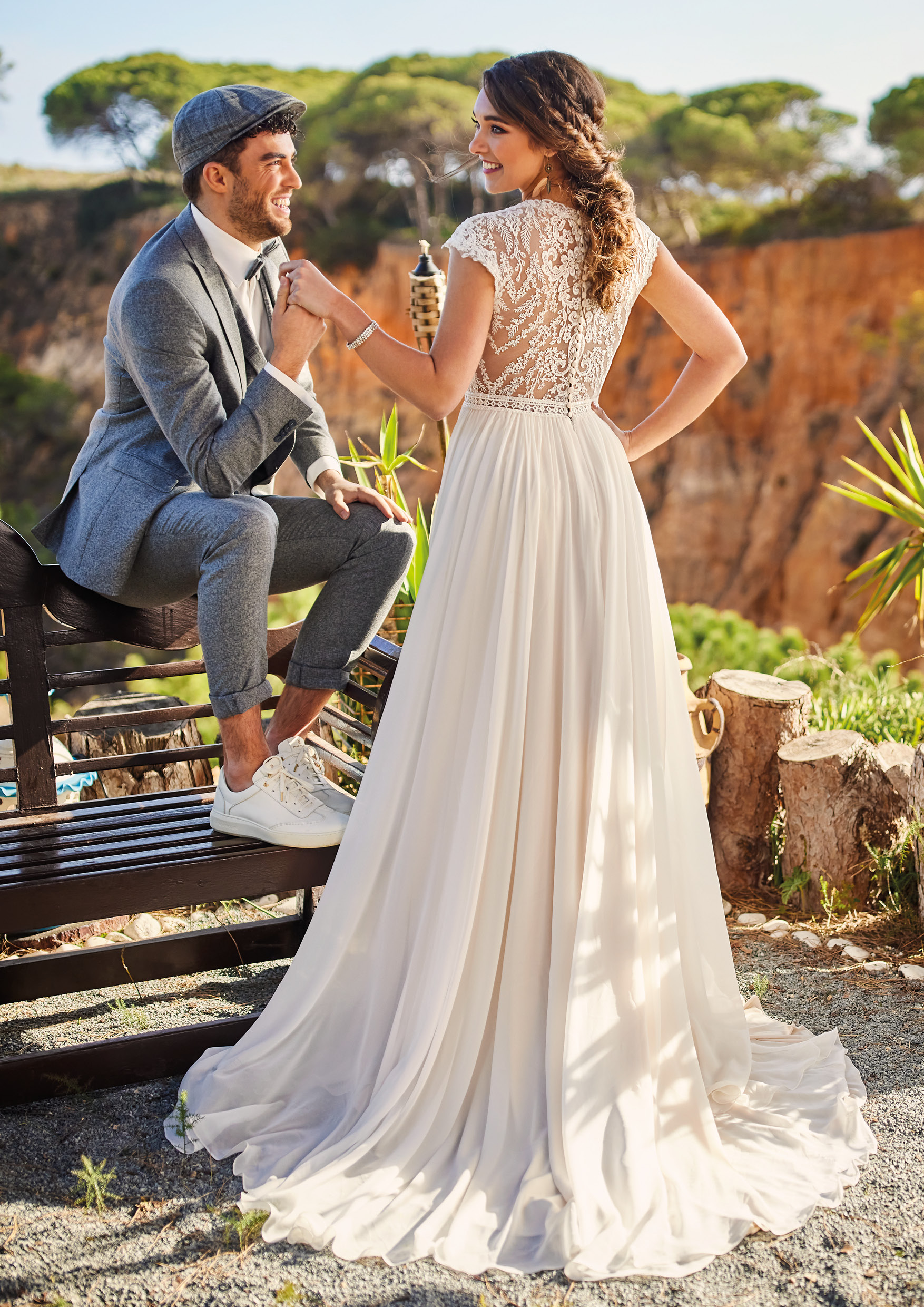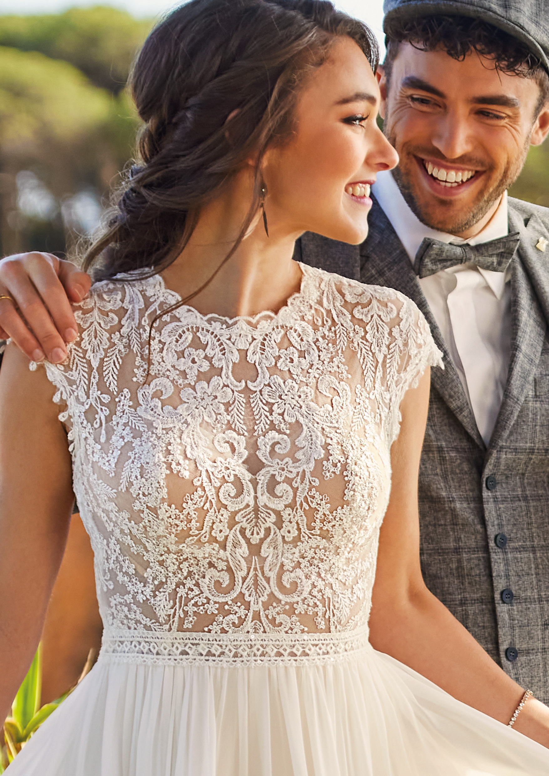 Mehrere Lagen traumhafter Gewebe werden für die Kreation dieses Boho und Vintage inspiriertes champagnerfarbene Brautkleid im A-Linien-Stil und Empire-Silhouette eingesetzt. Dieses Kleid besticht durch eine hohe Front- und Rückenpartie mit traumhaften Spitzenapplikationen überzogen, die in elegante Kappärmel ausläuft. Der Rock besteht aus mehrere Lagen Chiffonstoff, die dem Kleid ein romantisches Flair verleihen. Den hinteren Abschluss des Kleides bildet eine märchenhaft romantische Schleppe, die sanft mit Ihren Bewegungen mitschwingt und den perfekten Braut-Look vollendet. Auch im Farbton Elfenbein erhältlich. Alle Materialdetails anzeigen