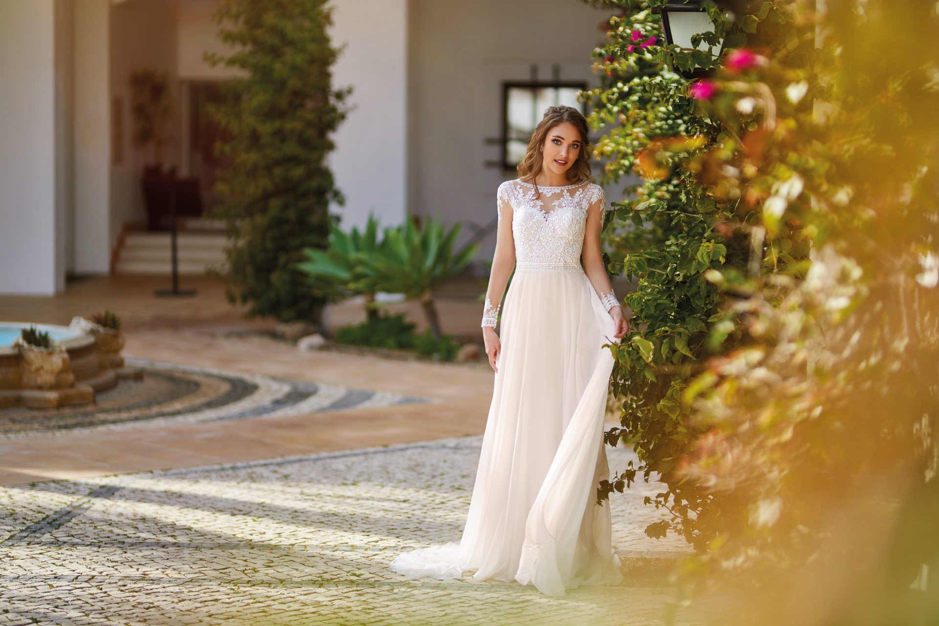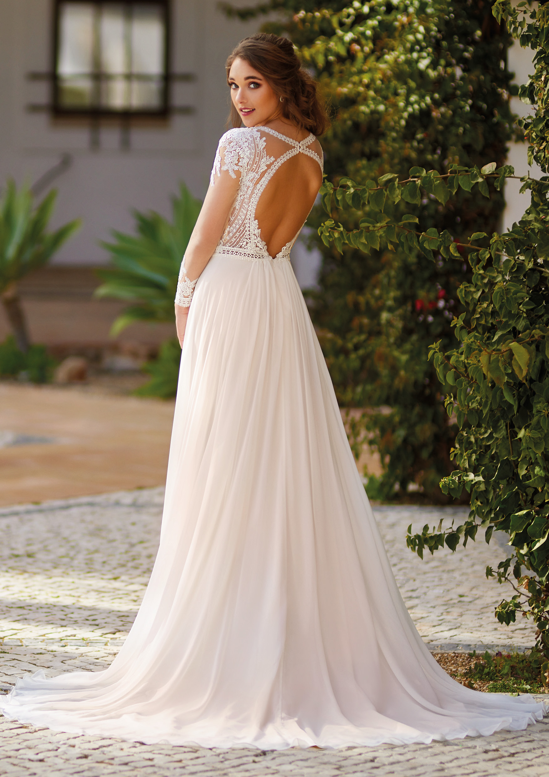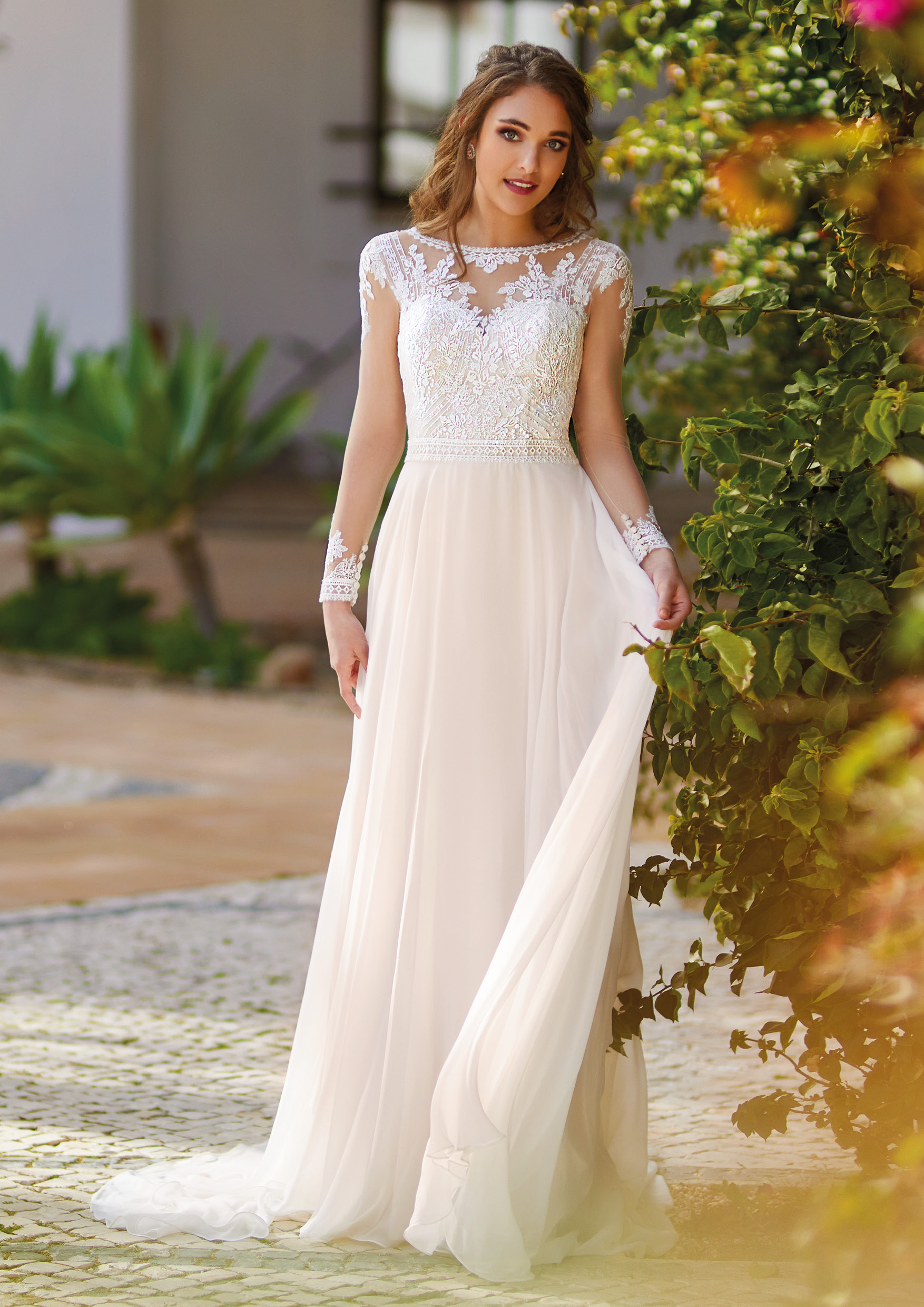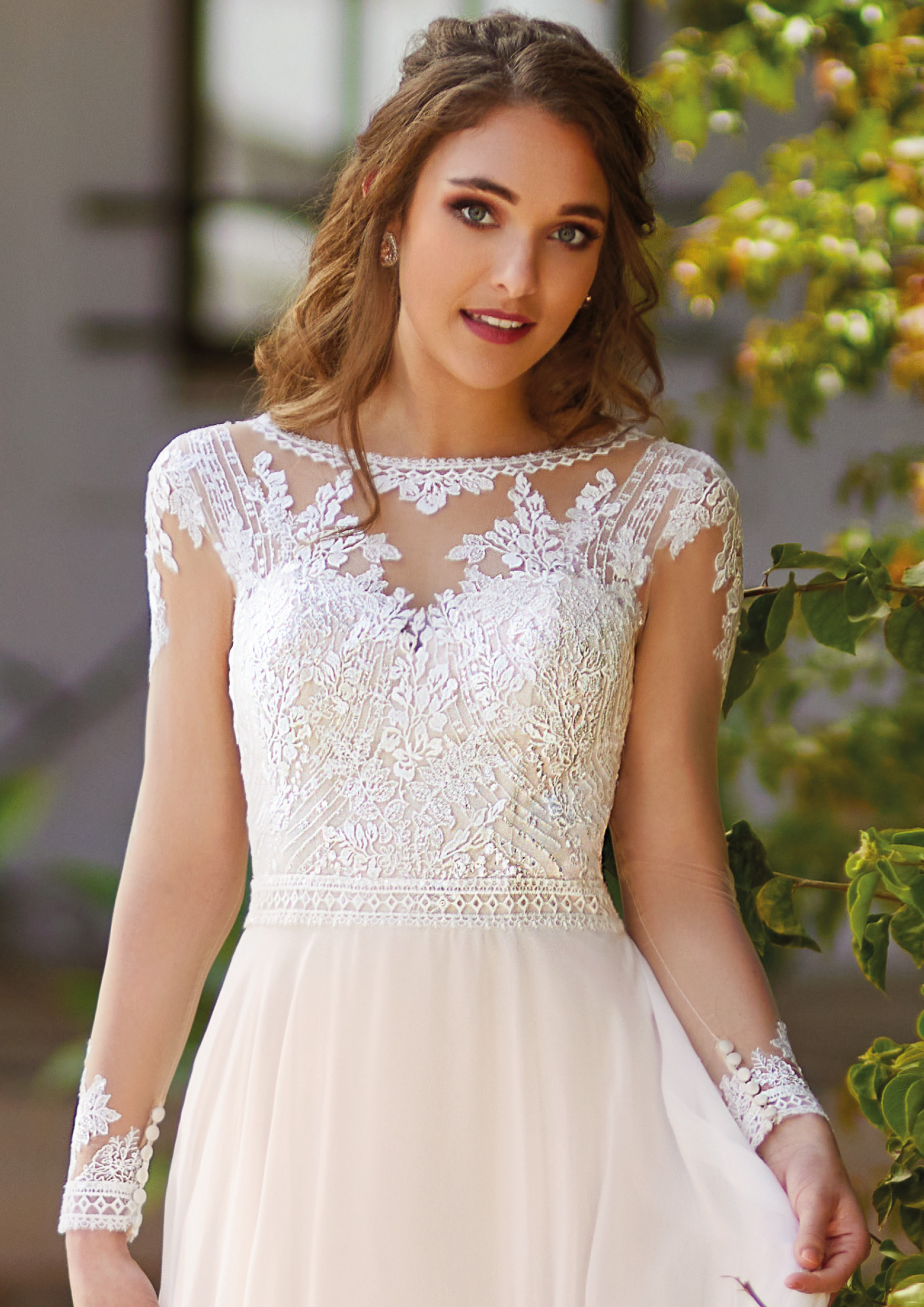 Dieses romantische champagnerfarbene Brautkleid in A-Linien-Stil und Empire-Silhouette beeindruckt durch einen hoch angesetzten Halsabschluss in Kombination mit einem Mieder-Ausschnitt im Sweetheart-Stil. Sowohl die hochgeschlossene Vorderpartie als auch der Rücken in Schlüsselloch-Optik sind mit durchsichtigem Spitzenstoff gearbeitet. Die Ärmel des Kleides sind lang und ebenfalls aus Spitze, und die Schleppe besteht aus mehreren Lagen zarter Chiffon, die einen weich fließenden Effekt erzeugen. Auch in Elfenbein ist dieses Modell verfügbar.