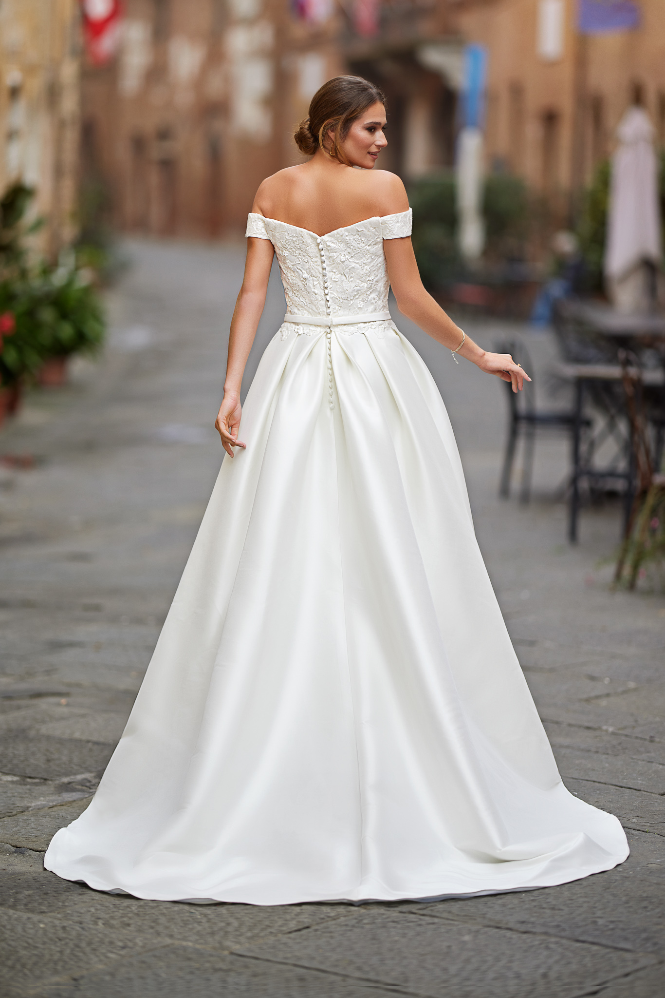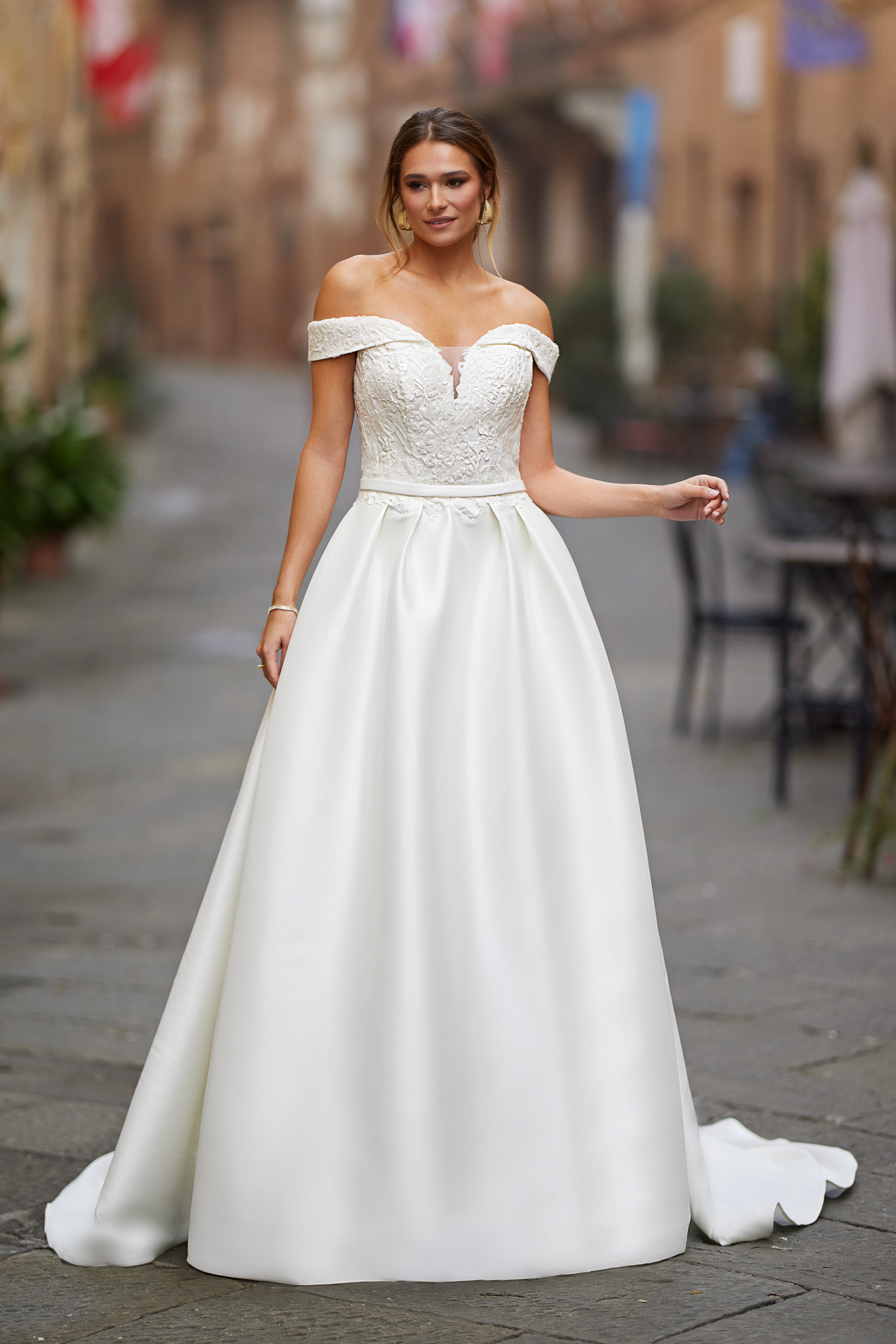 Ein atemberaubendes und königliches Brautkleid im A-Linie/Ballkleid Stil mit schulterfreien Ärmeln, sowie am abnehmbarer Taillenriemen. Das Mieder ist gefertigt aus feinster, zarter Spitze auf Mikado Stoff. Der Rock besteht aus luxuriösem Mikado über Satin für eine perfekte Passform und verfügt über verdeckte Seitentaschen. Alle Materialdetails anzeigen