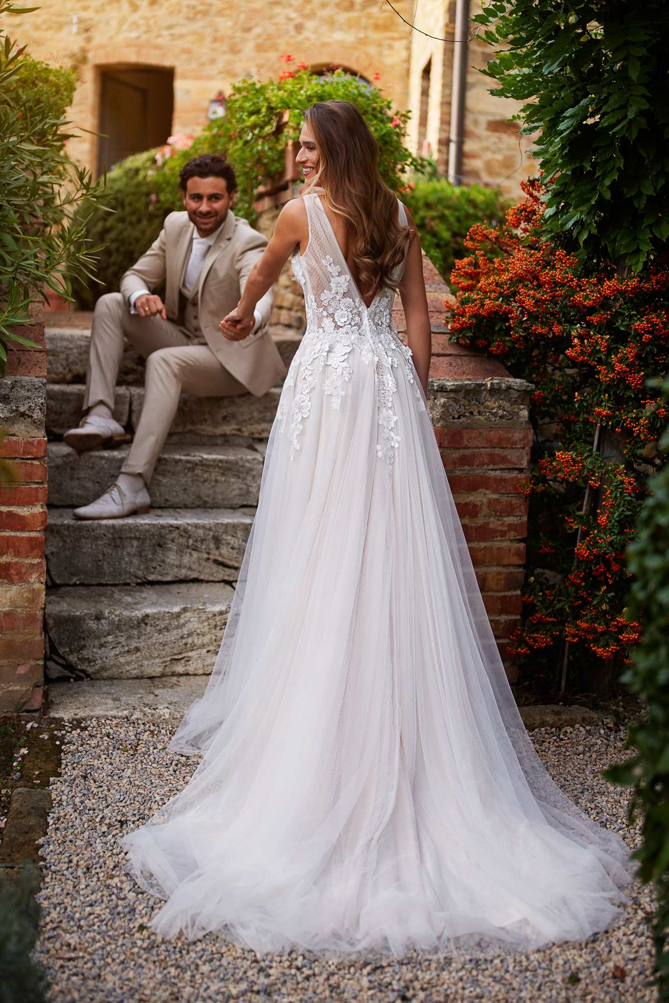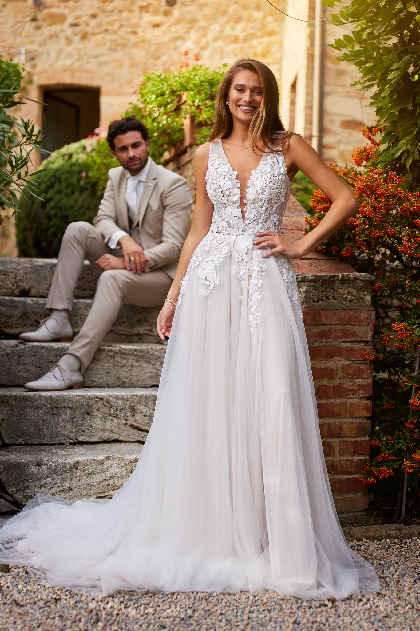 Dieses besonders eleganten und zeitlosen Brautkleid im A-Linien-Stil ist durch floralen Spitzenapplikationen auf einem einen tiefen V-Ausschnitt aus Schichten Glitzertüll und plissiertem Tüll geprägt. Der Rock hat einen Schlitz und besteht aus mehreren Lagen sanft fließendem Tüll und glitzerndem Tüll. In diesem Kleid ist Ihnen ein grandioser Auftritt gewiss! Alle Materialdetails anzeigen