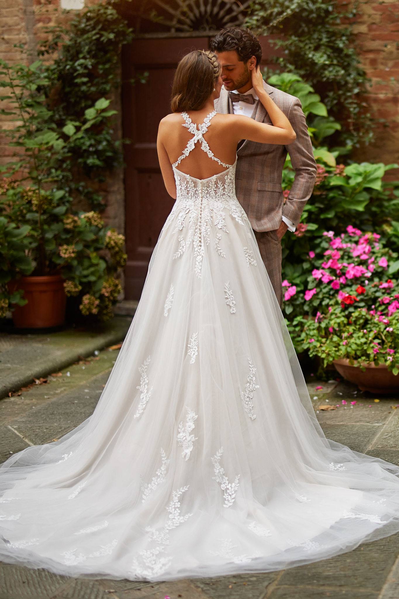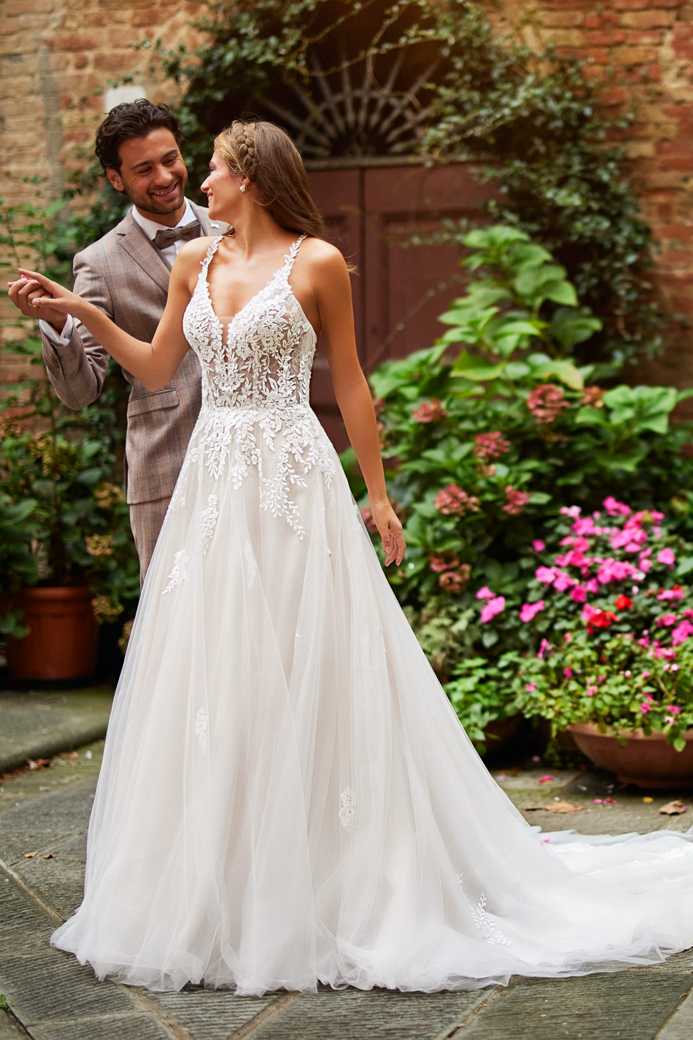 Romantisch und elegant ist dieses klassische Brautkleid im Stil A-Linie. Es besticht durch ein spektakulär tief V-förmig ausgeschnittenes Mieder mit zarten, zierlichen Trägern. Ein elegantes Kreuzmuster sorgt für einen dramatischen Akzent am Rücken. Eine zauberhafte, weich fließende Schleppe aus mehreren Lagen Tüll rundet den Look des Kleides wunderschön ab. Alle Materialdetails anzeigen