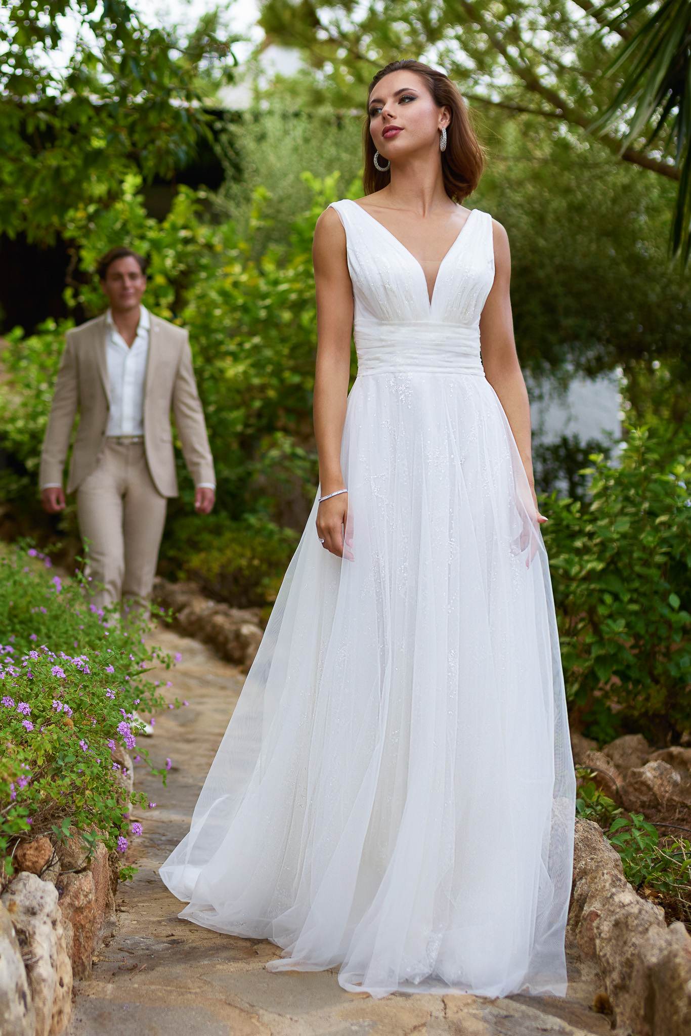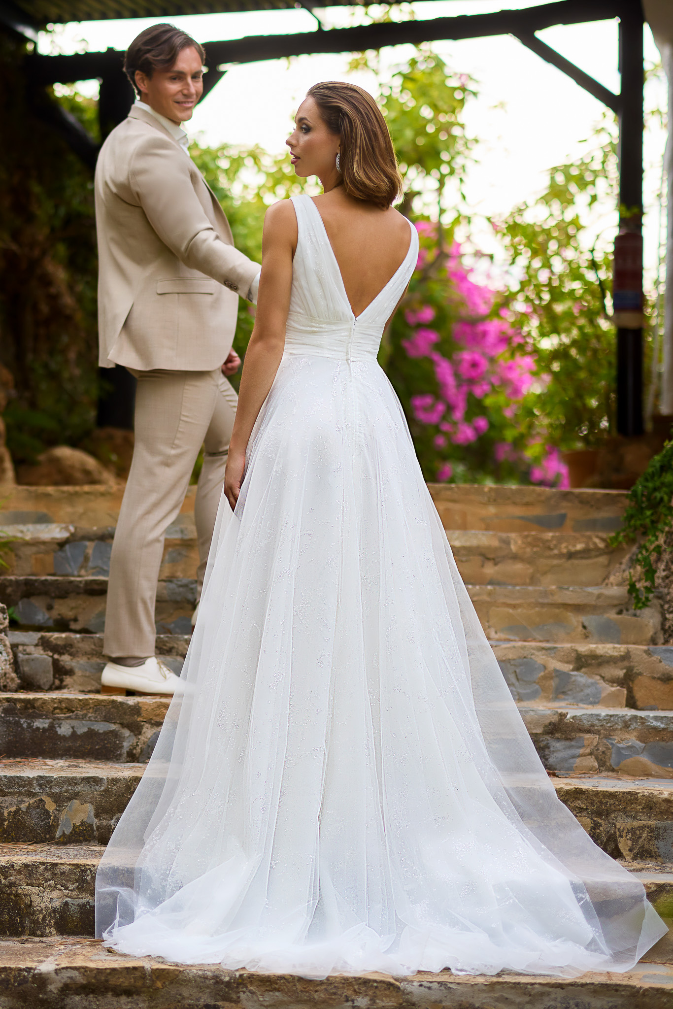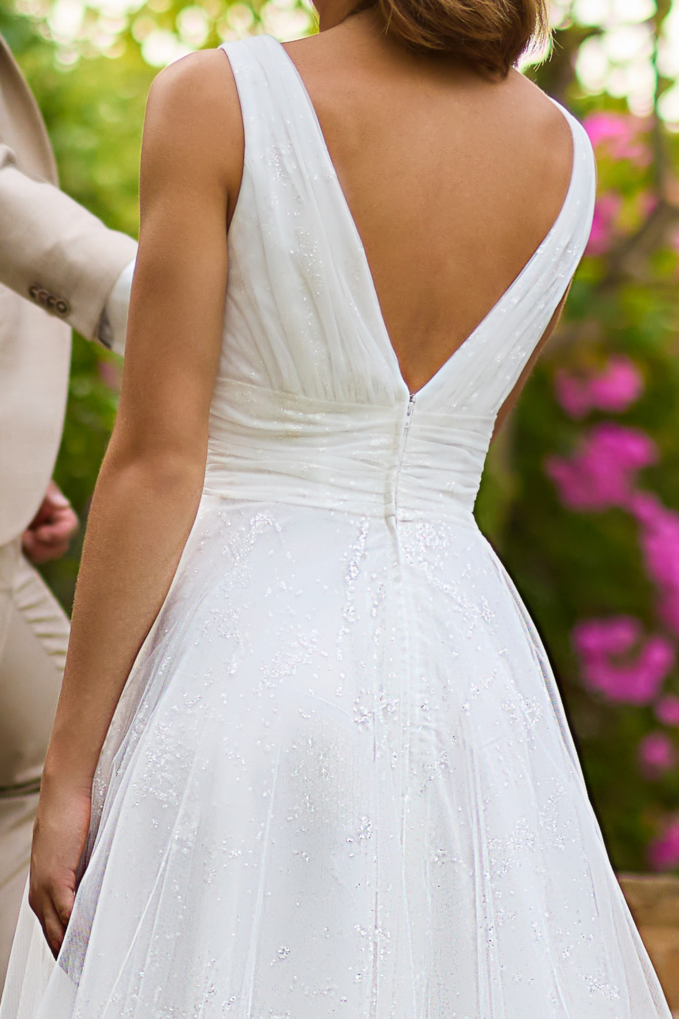 Ein glamouröses A-Linien-Brautkleid, vollständig aus Glitzertüll gefertigt. Das Oberteil verfügt über einen tiefen V-Ausschnitt und ist mit mehreren Stofflagen gestaltet, die die feminine Silhouette wunderschön betonen. Der Rock, bestehend aus mehreren Lagen (Glitzer-)Tüll, erzeugt einen voluminösen Effekt und macht dieses Kleid zu einem echten Hingucker. Alle Materialdetails anzeigen