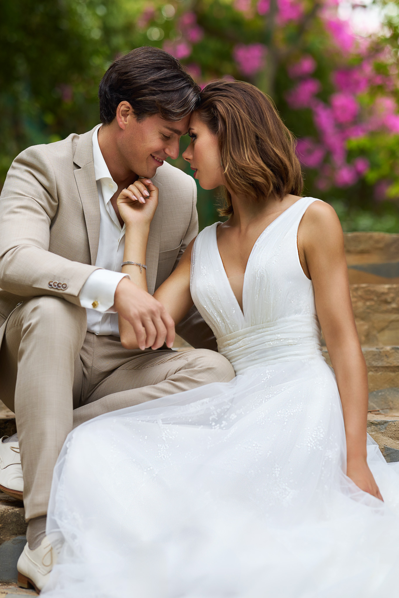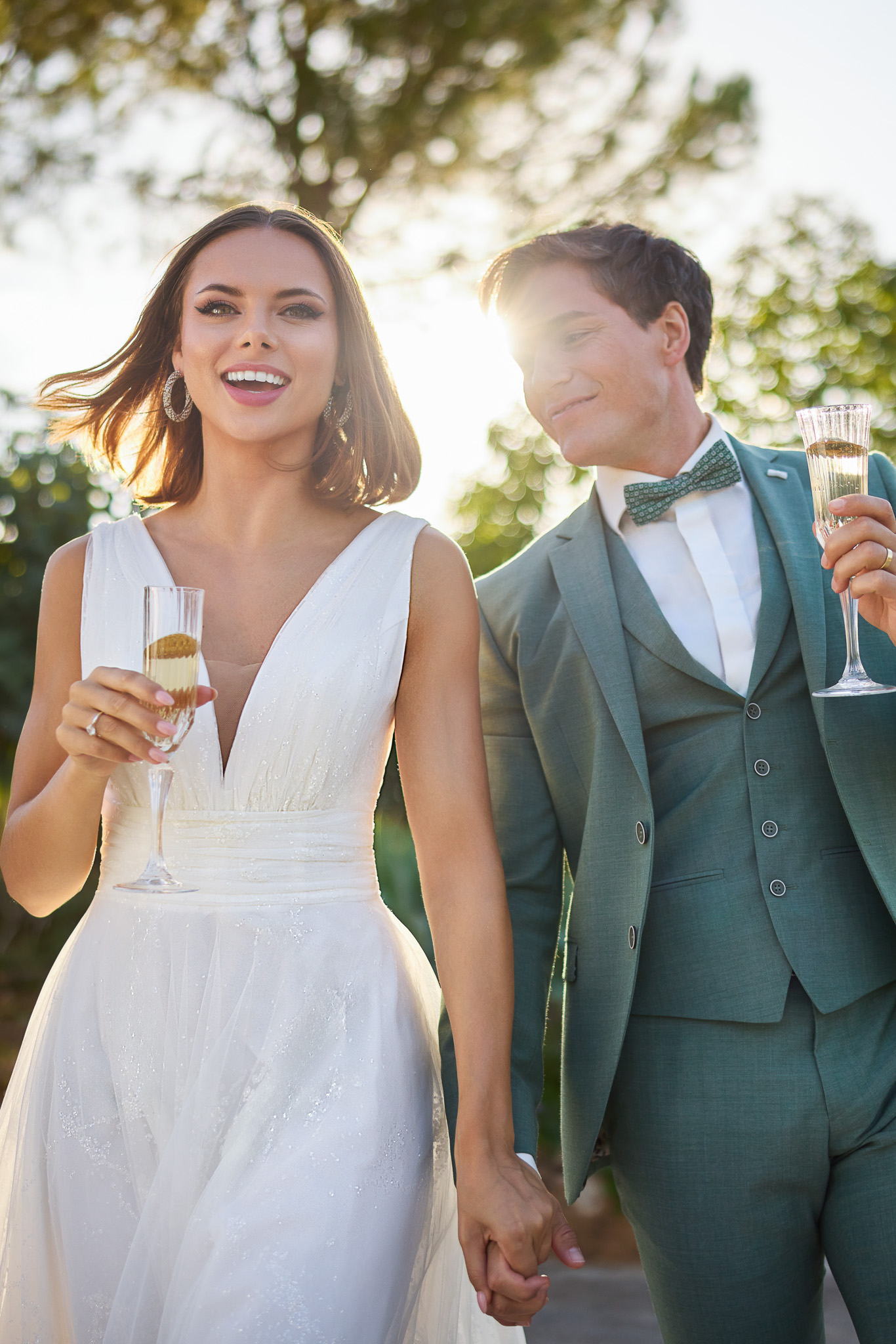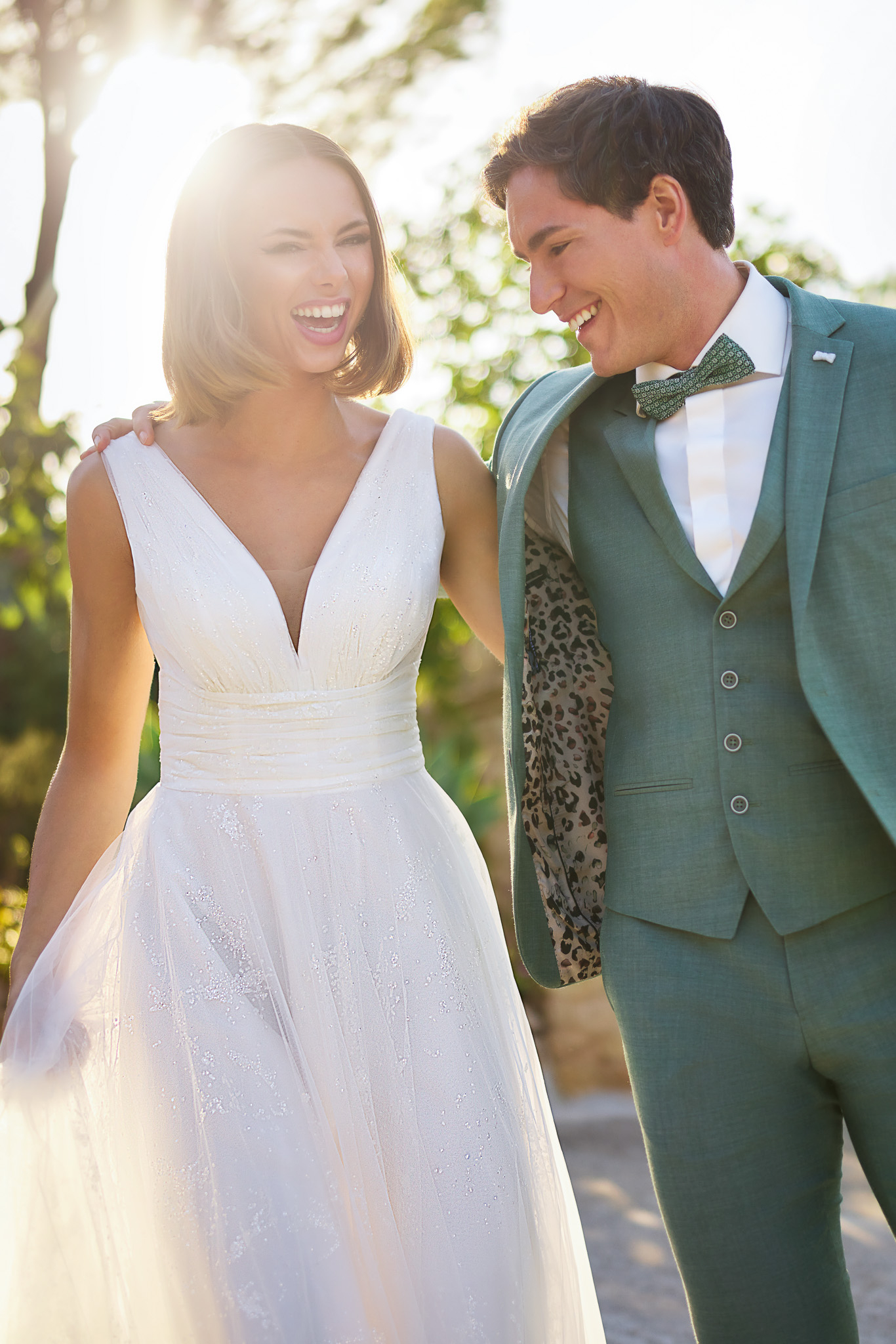 Ein glamouröses A-Linien-Brautkleid, vollständig aus Glitzertüll gefertigt. Das Oberteil verfügt über einen tiefen V-Ausschnitt und ist mit mehreren Stofflagen gestaltet, die die feminine Silhouette wunderschön betonen. Der Rock, bestehend aus mehreren Lagen (Glitzer-)Tüll, erzeugt einen voluminösen Effekt und macht dieses Kleid zu einem echten Hingucker. Alle Materialdetails anzeigen