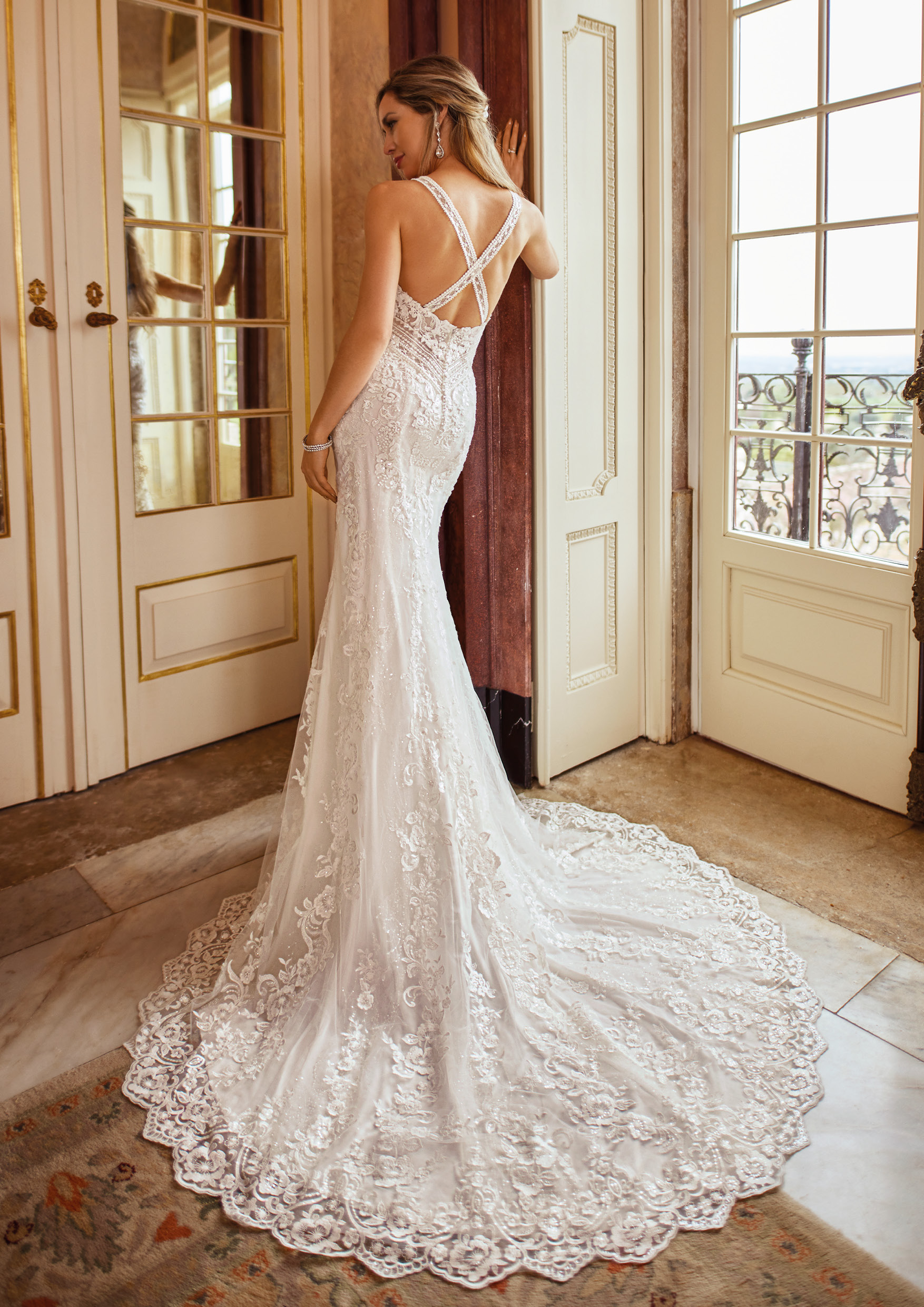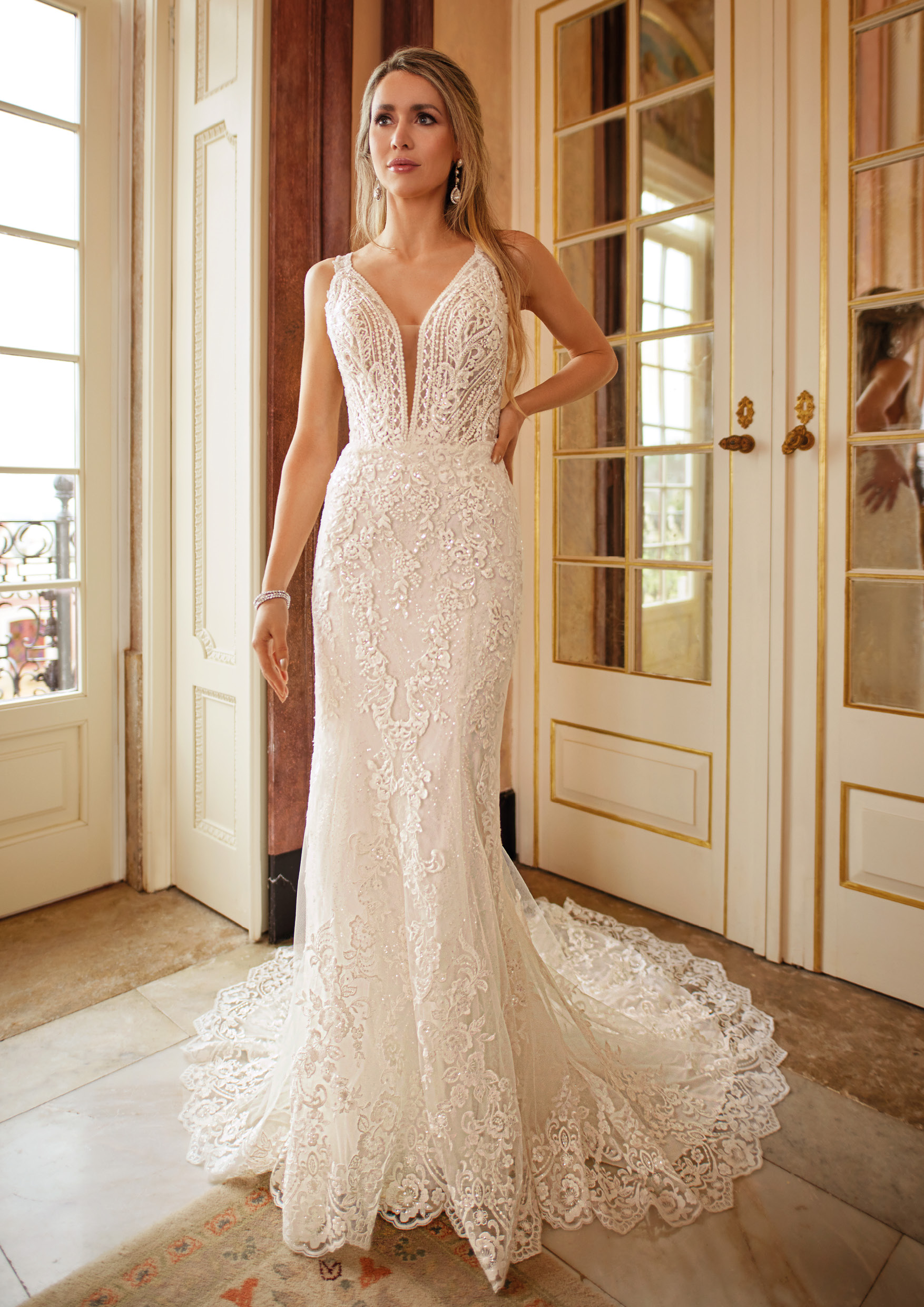 Der Stil dieses luxuriösen und glamourösen elfenbeinfarbenen Brautkleides im Fit & Flare-Stil ist durch zauberhafte Allover-Spitze geprägt. Die Vorderpartie des Kleides ist mit einem luxuriösen V-Ausschnit designt unter dem ein zarter, transparenter Einsatz über das Dekolleté verläuft. Die Rückenpartie ist mit einem zauberhaften Cross-Strap-Design ausgeführt, und darüber hinaus sind auch der Rock und die Schleppe mit traumhaften Spitzenakzenten überzogen. Dieses körpernah geschnittene Modell akzentuiert die bildschönen Konturen Ihres Körpers. Alle Materialdetails anzeigen