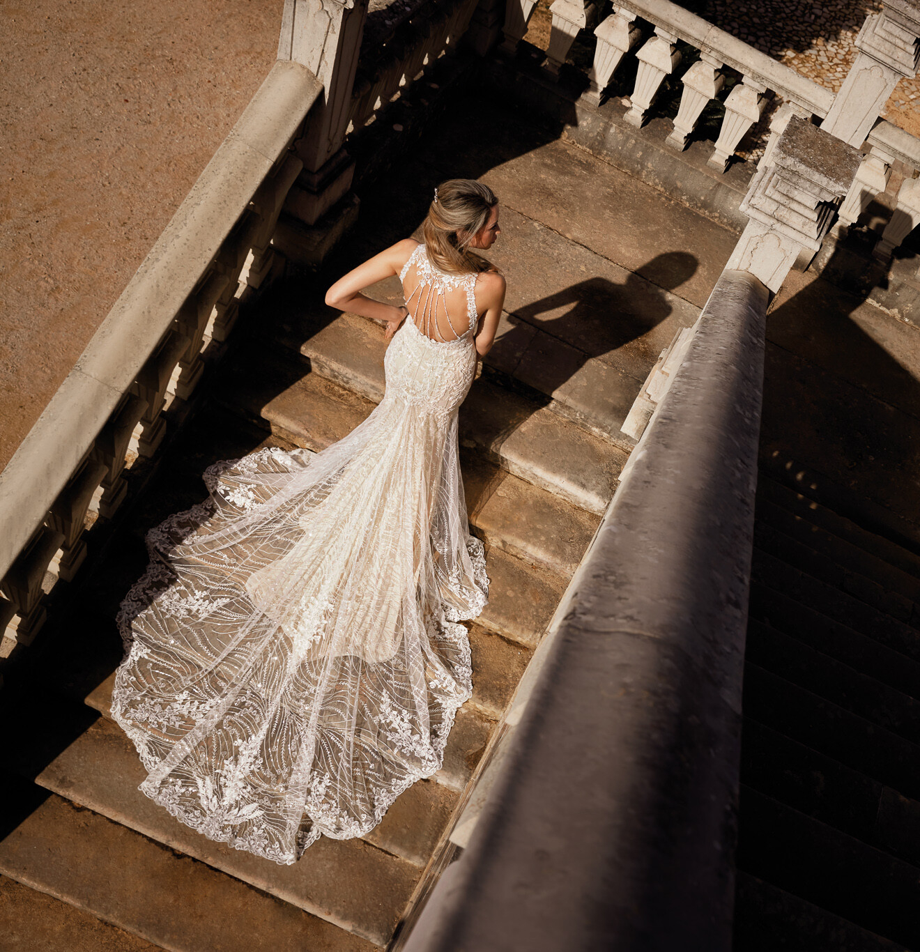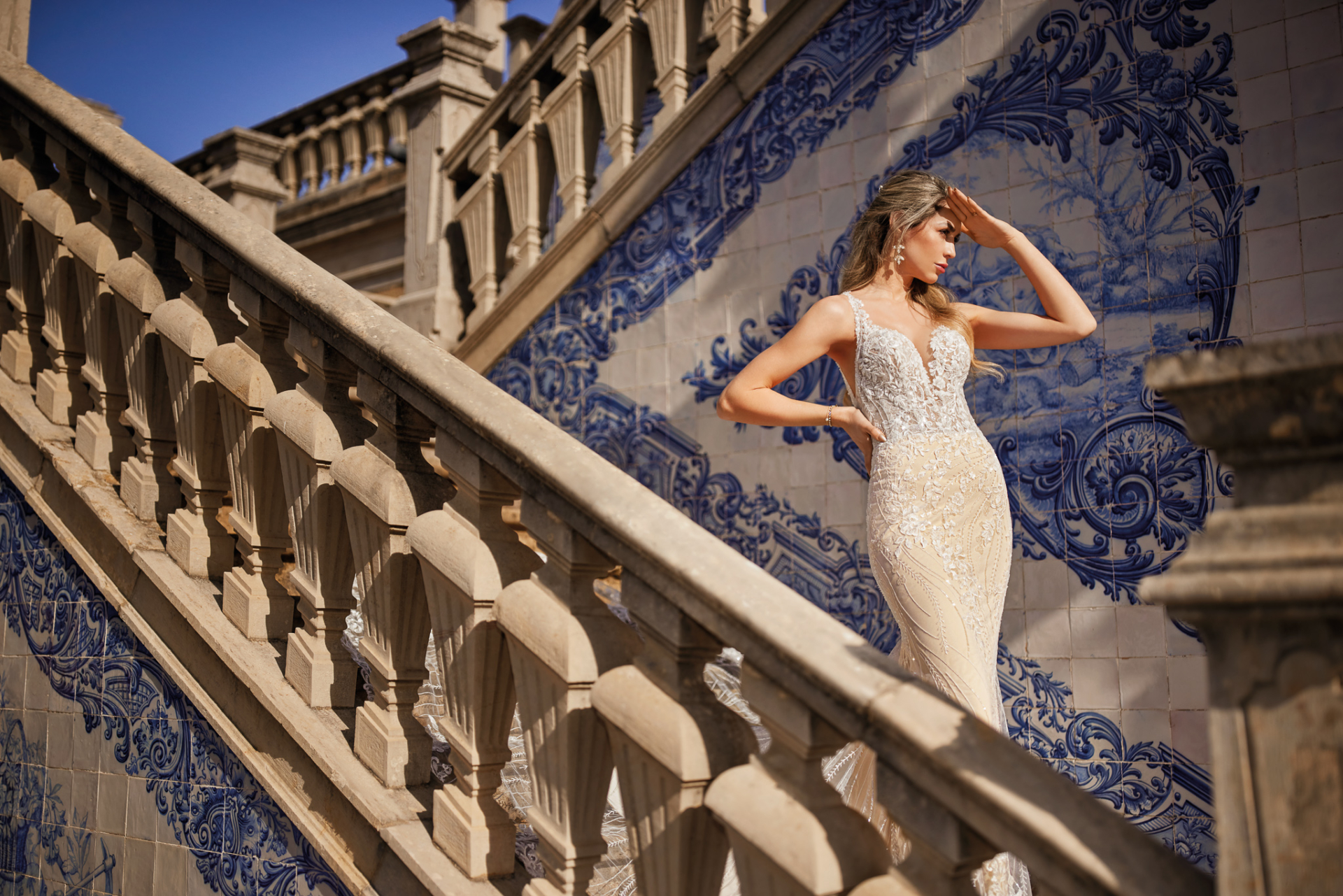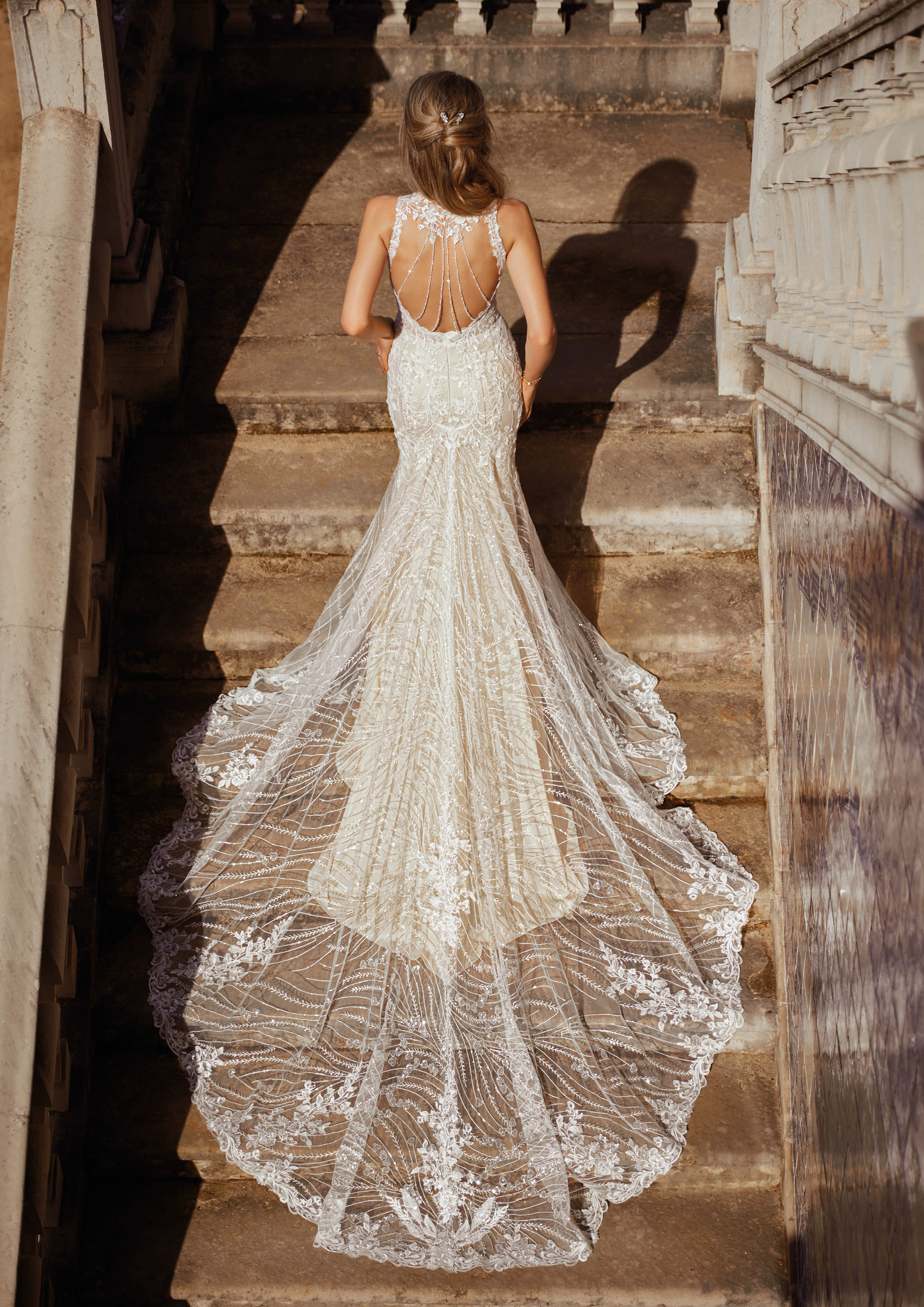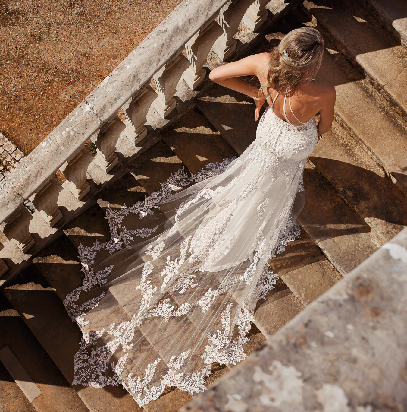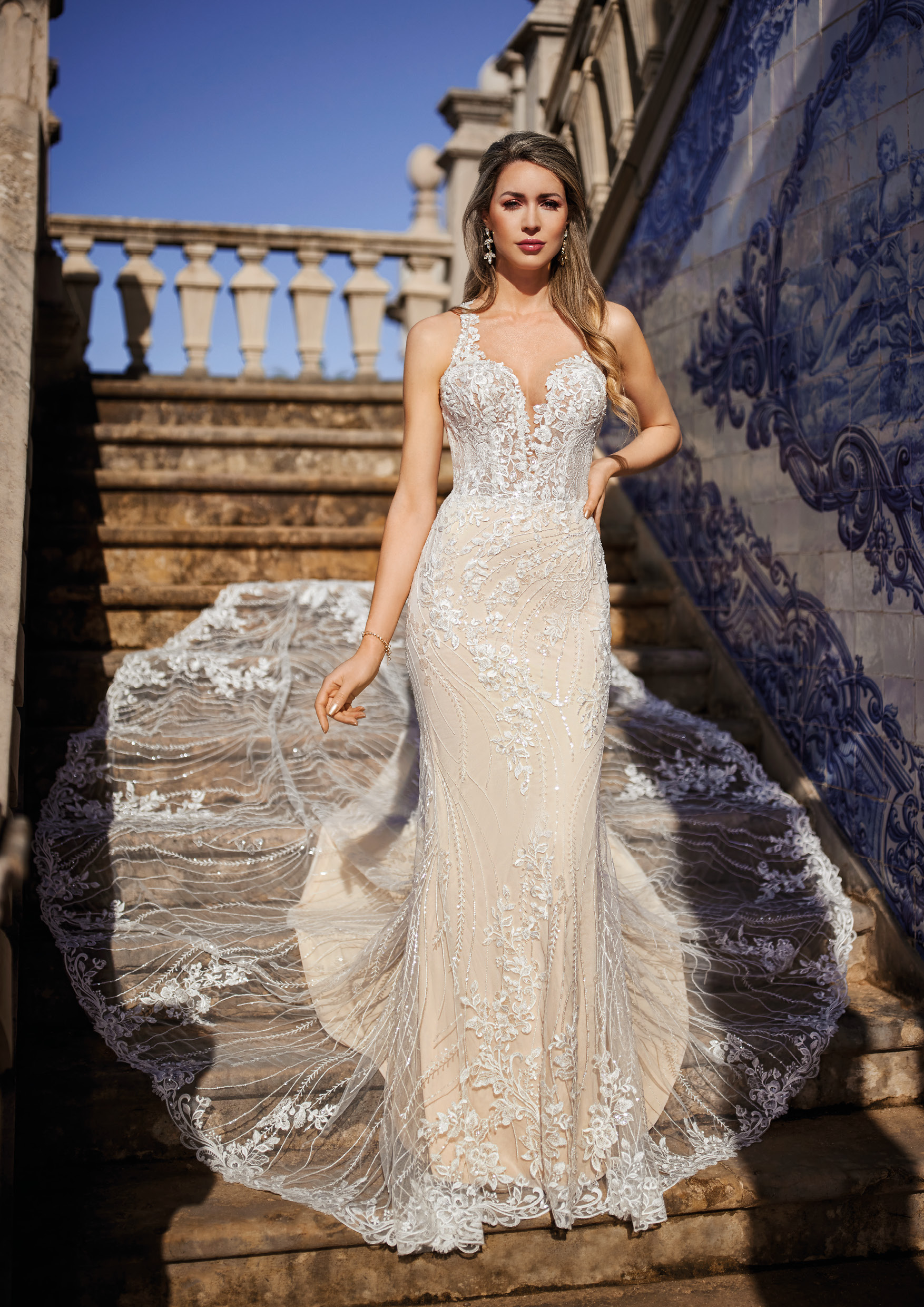 Prachtvoll und ausdrucksstark … das Brautkleid für den spektakulären Auftritt. Dieses champagnerfarbene Modell im Fit & Flare-Stil verzaubert durch traumhafte Spitzenapplikationen und ein tief V-förmig ausgeschnittenes Mieder. Filigran bestickte durchsichtige Spitze bildet eine faszinierende Dekolleté-Linie und setzt sich in dem überaus aparten Rückendetail fort. Bezaubernde zarten Perlchen bilden einen bildschönen Rücken-Akzent, und an der langen Schleppe rundet mehrlagige Spitze dieses Brautkleid wunderschön ab. In diesem Kleid ist Ihnen ein grandioser Auftritt gewiss! Auch im Farbton Elfenbein erhältlich. Alle Materialdetails anzeigen