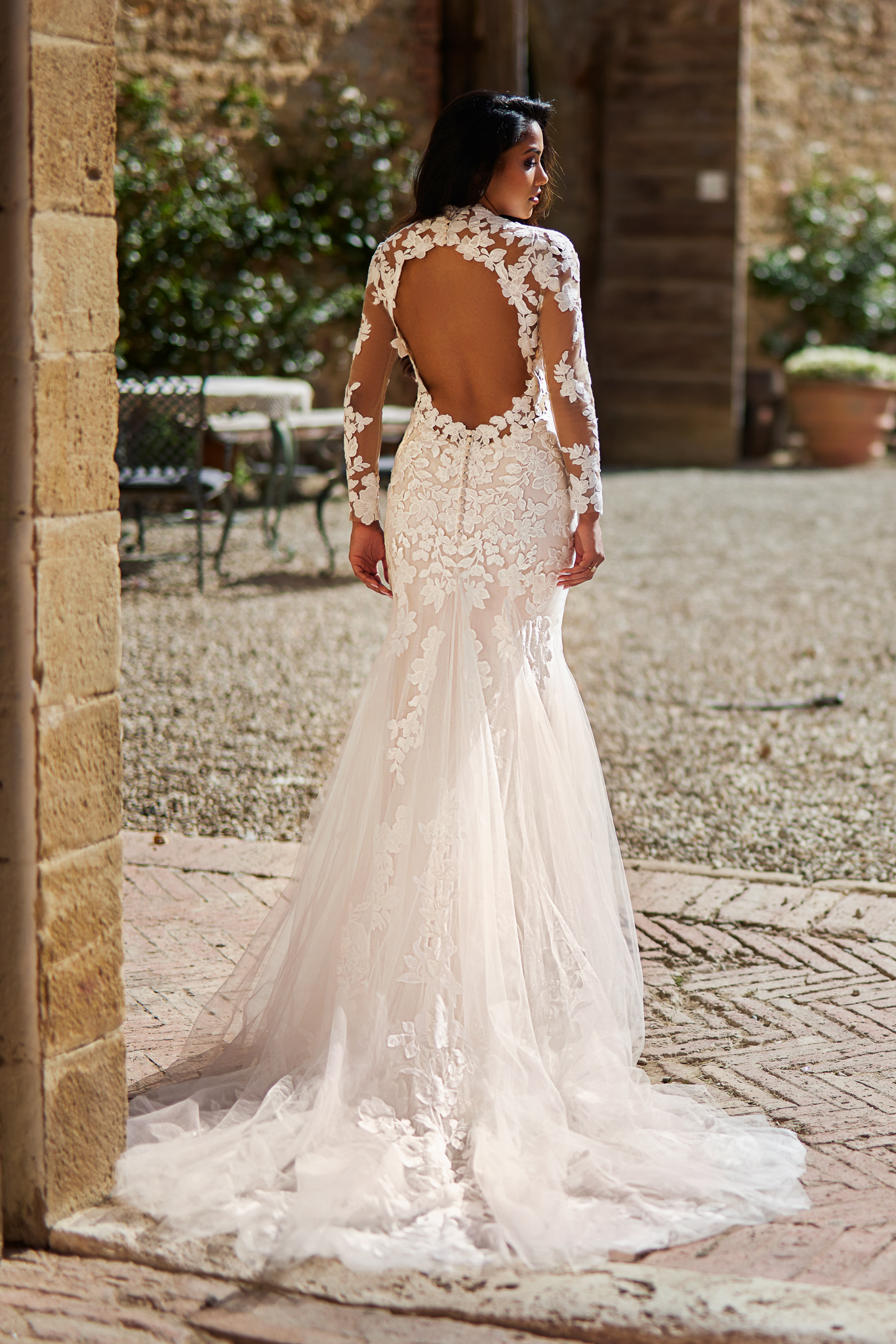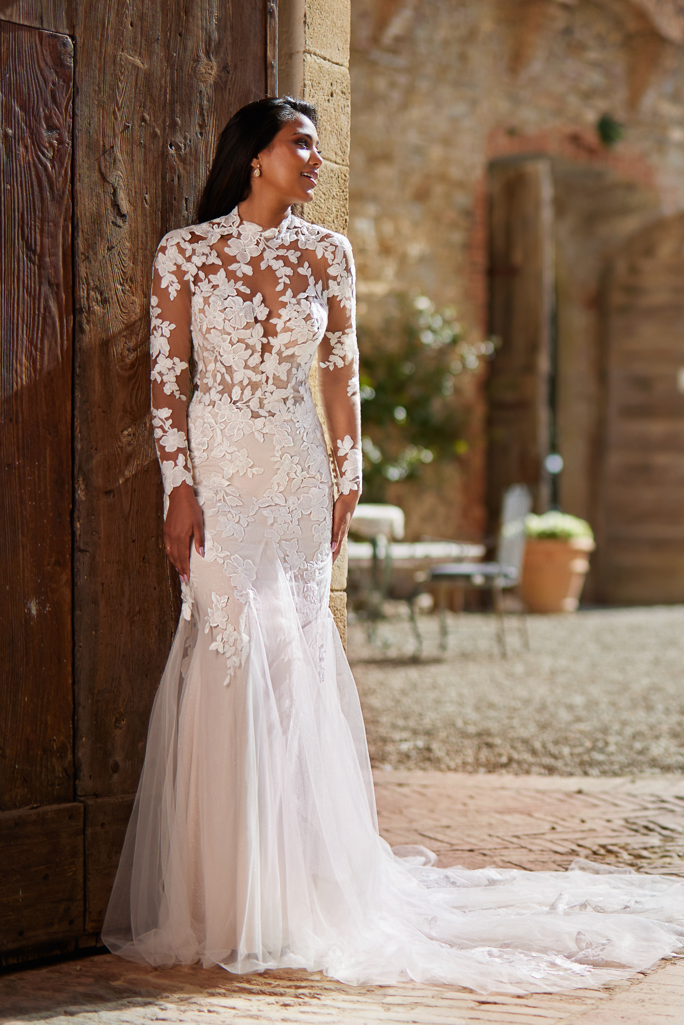 Dieses besonders eleganten und zeitlosen Brautkleid Fit & Flare-Stil ist durch lange Ärmel und einen hoch angesetzten Halsabschluss aus durchsichtigem Spitze auf einem Sweetheart-Ausschnitt geprägt. Der Rücken hat ein schönes Schlüsselloch-detail. Der Rock läuft in eine prachtvolle, mehrlagige Schleppe mit Rüschenabschlüssen aus, die zudem mit bezaubernder, eleganter Spitze verziert ist. Alle Materialdetails anzeigen
