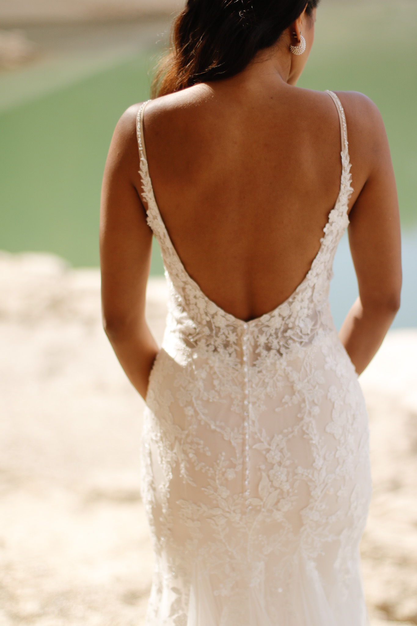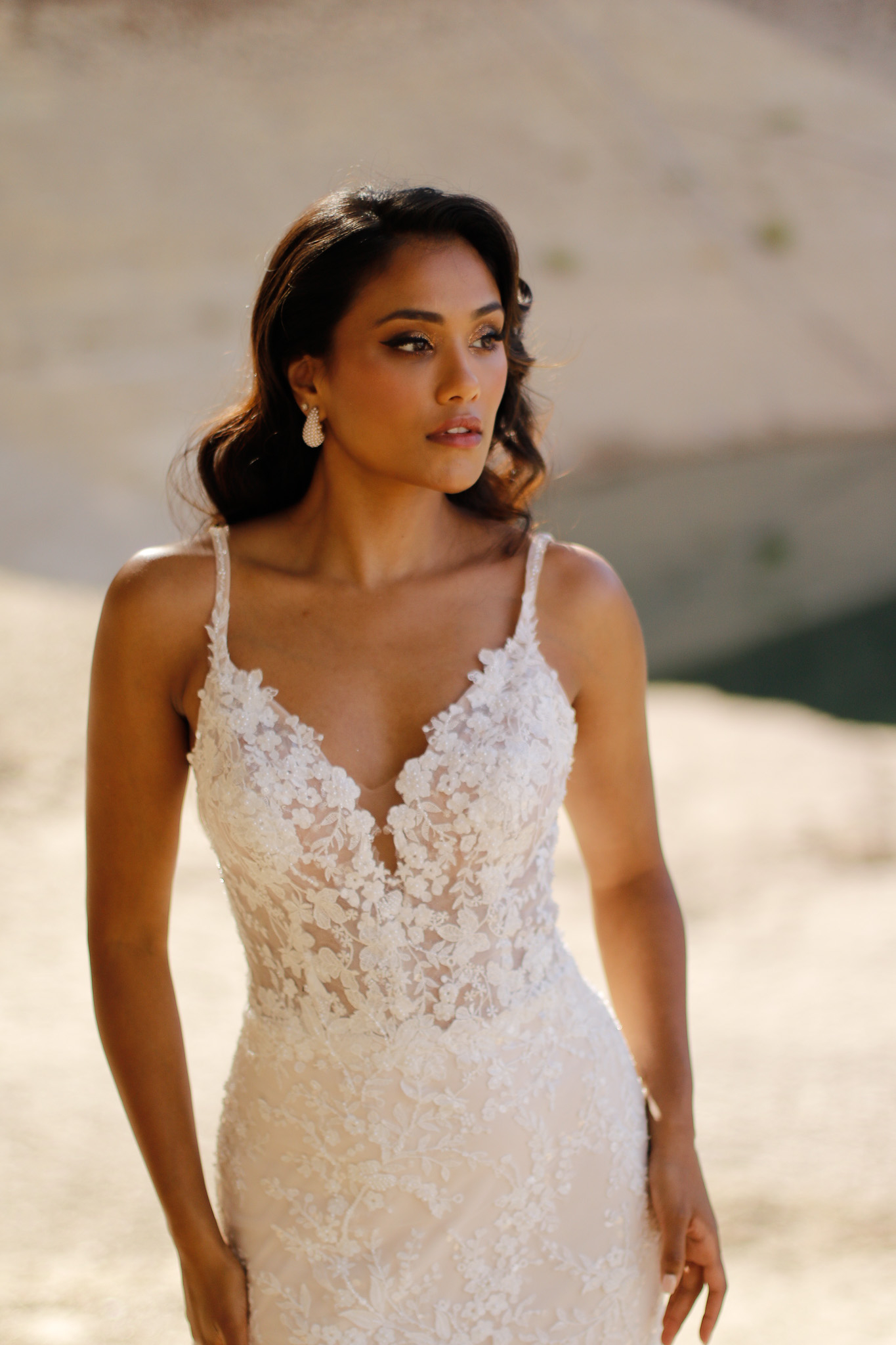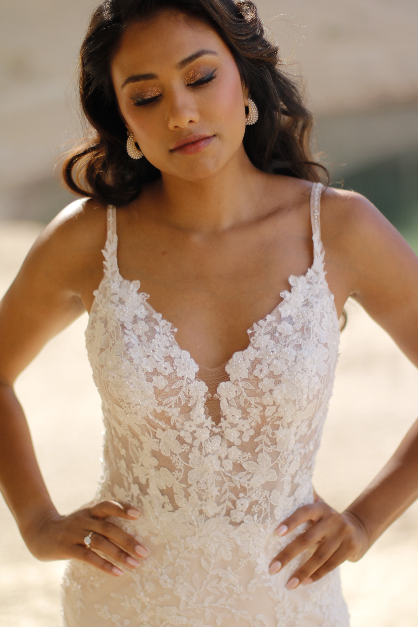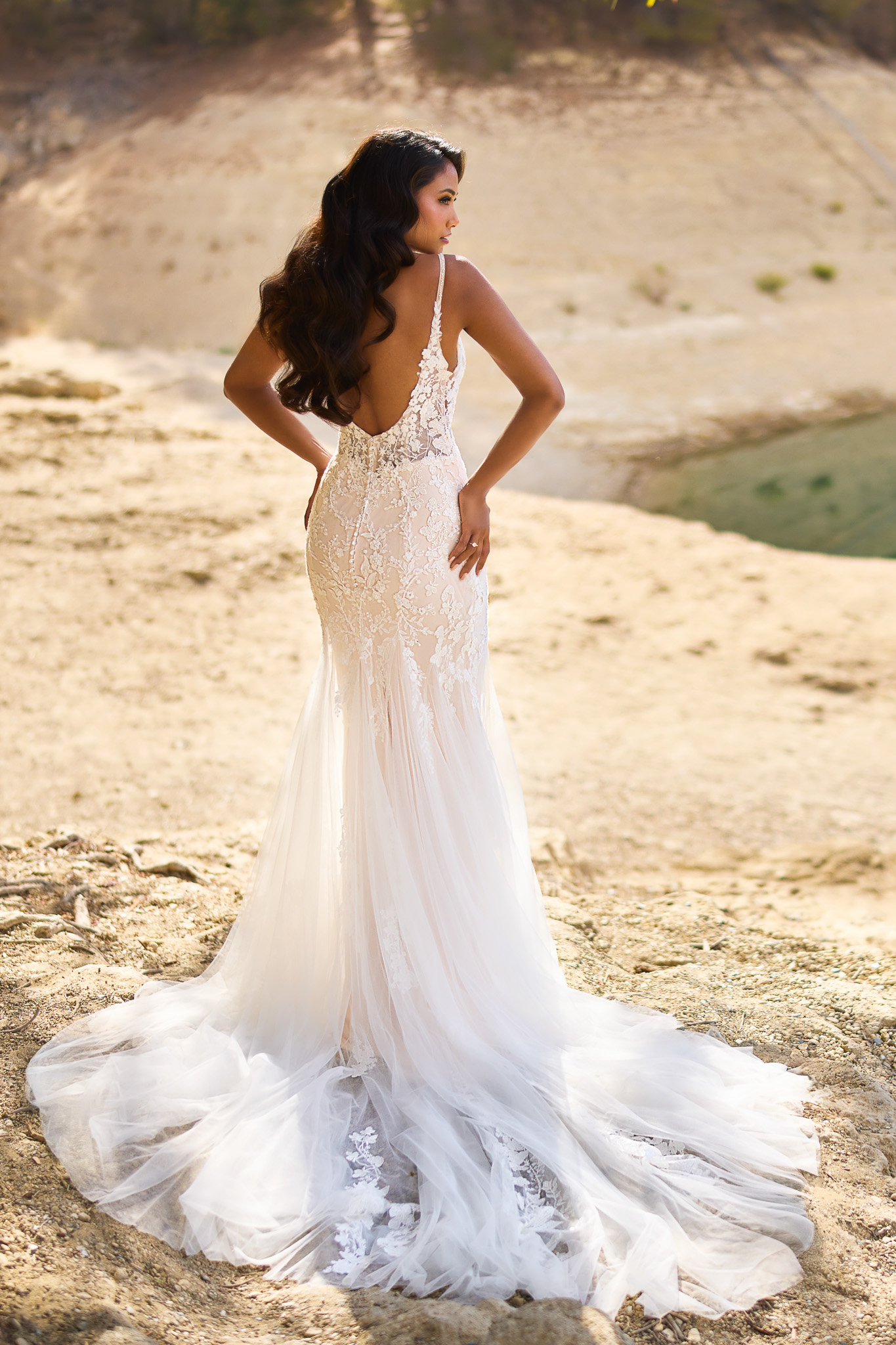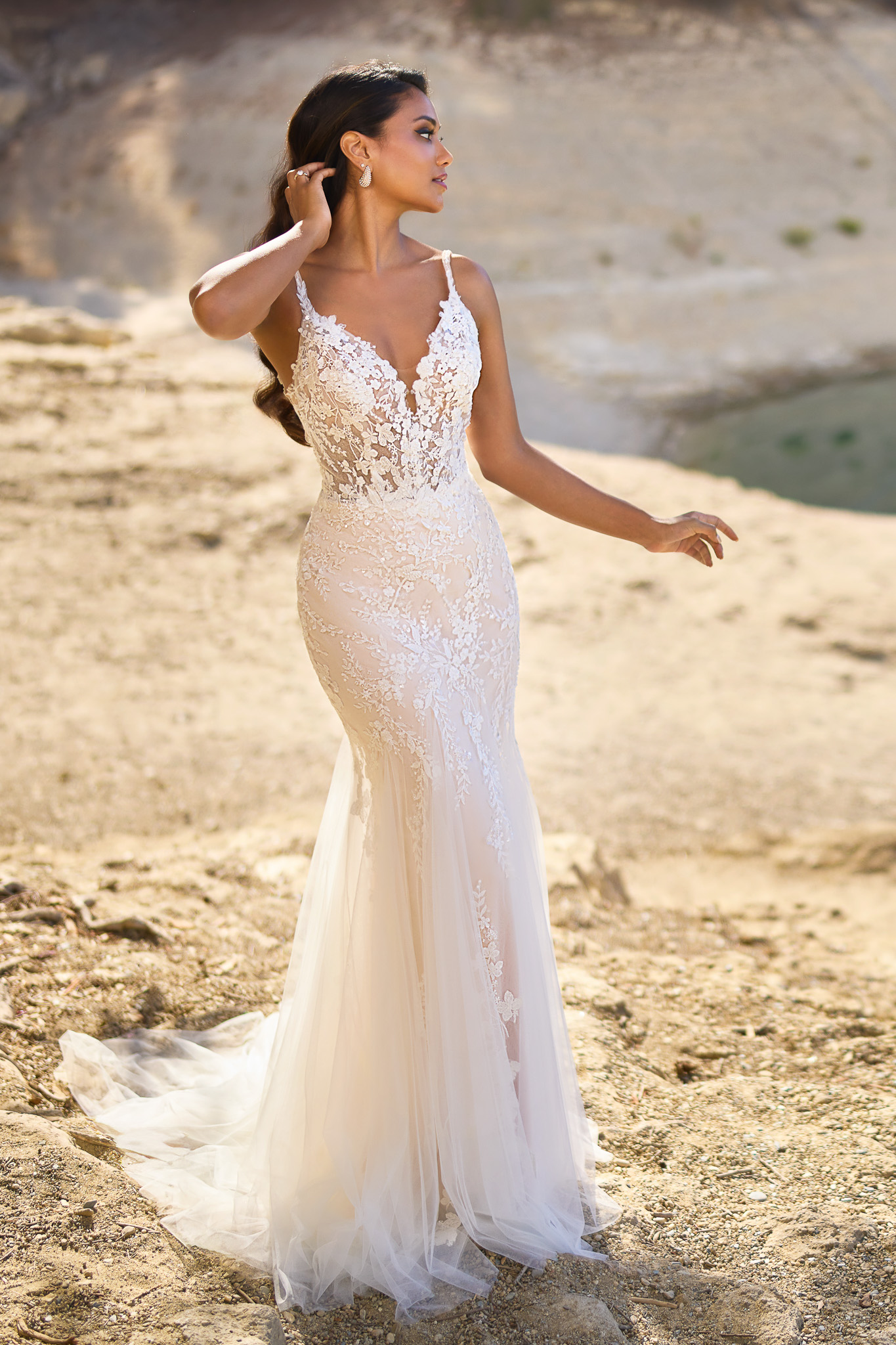 Dieses luxuriöse und elegante Brautkleid im Meerjungfrauenschnitt verfügt über einen wunderschönen V-Ausschnitt, dünne Träger und einen tiefen Rücken. Das Kleid ist mit zarten floralen Spitzenapplikationen verziert. Die Schleppe besteht aus mehreren Lagen Tüll und ist am Ende mit besonderen Spitzenakzenten versehen. Dieser figurbetonte Stil wird Ihre Figur wunderschön betonen. Alle Materialdetails anzeigen