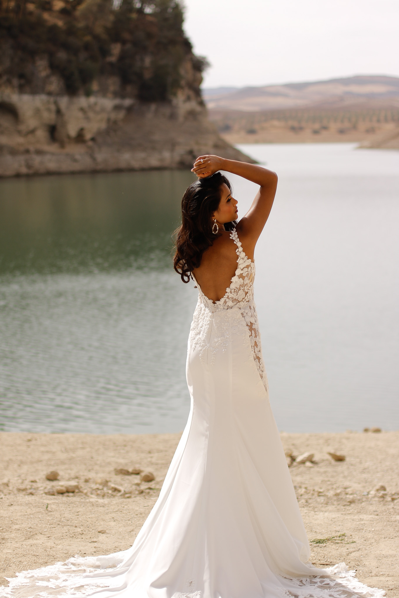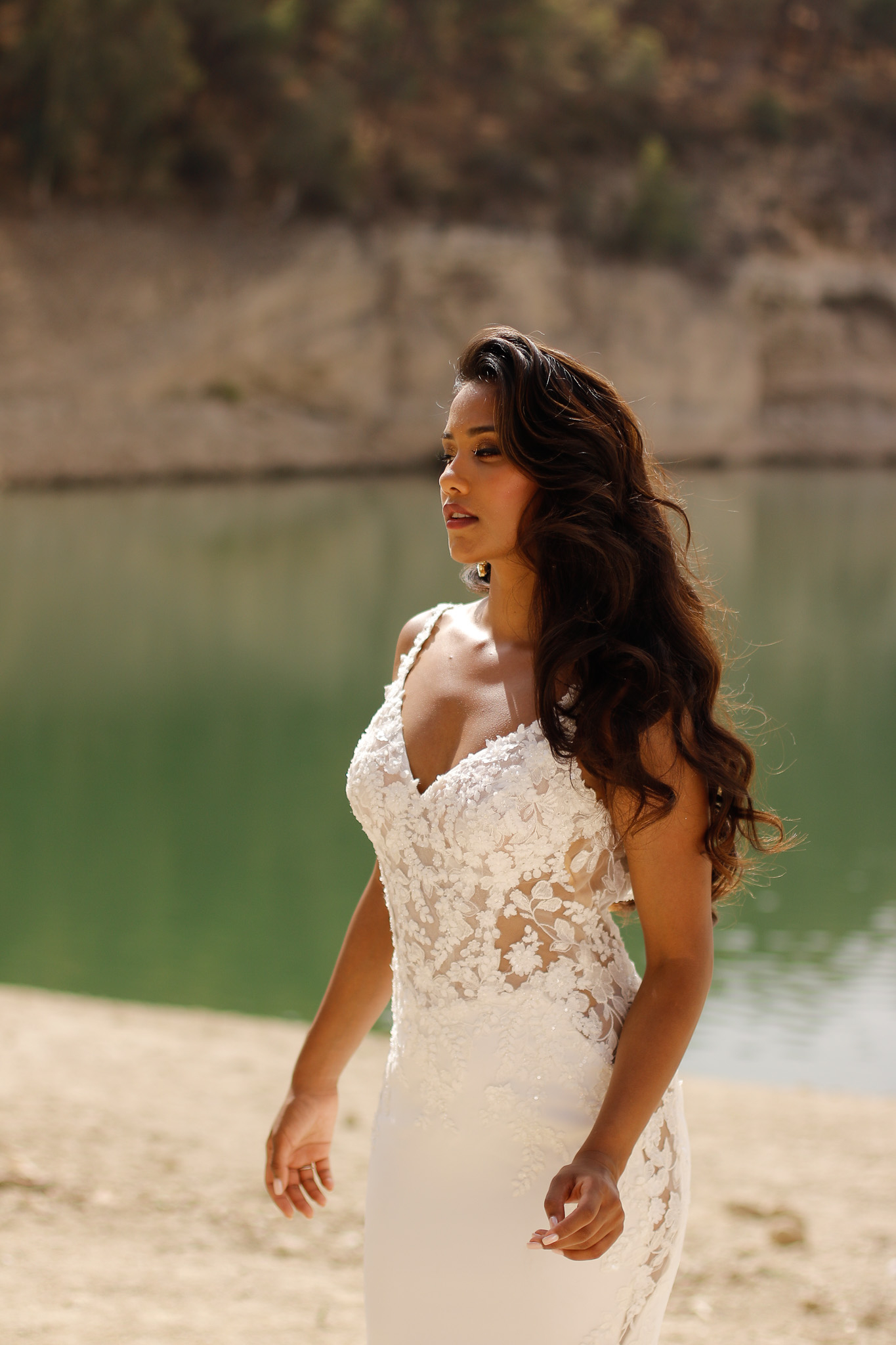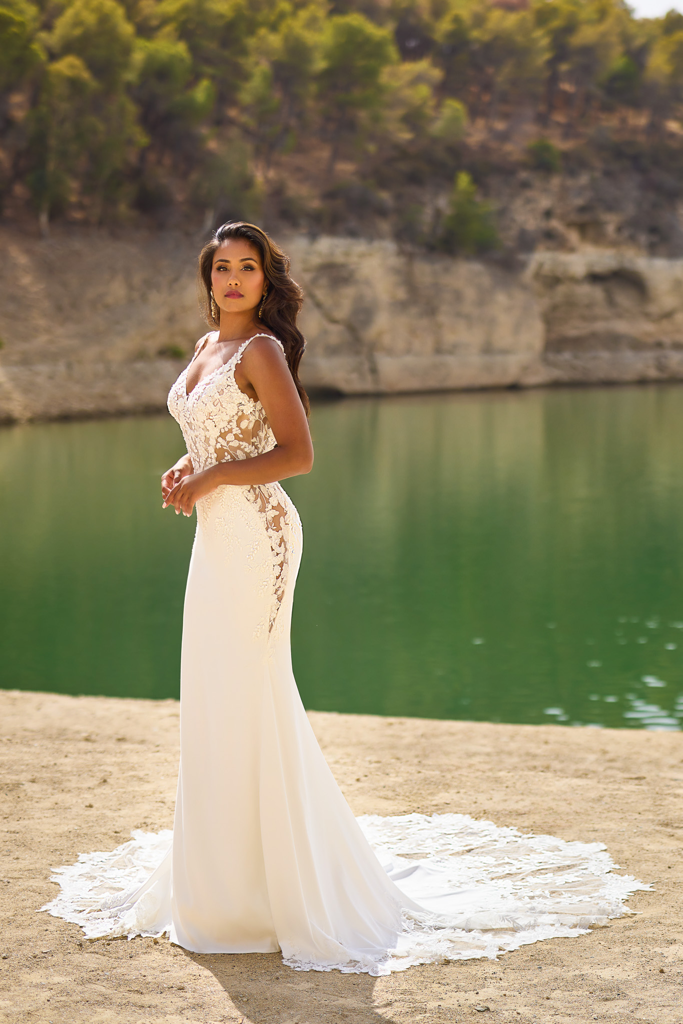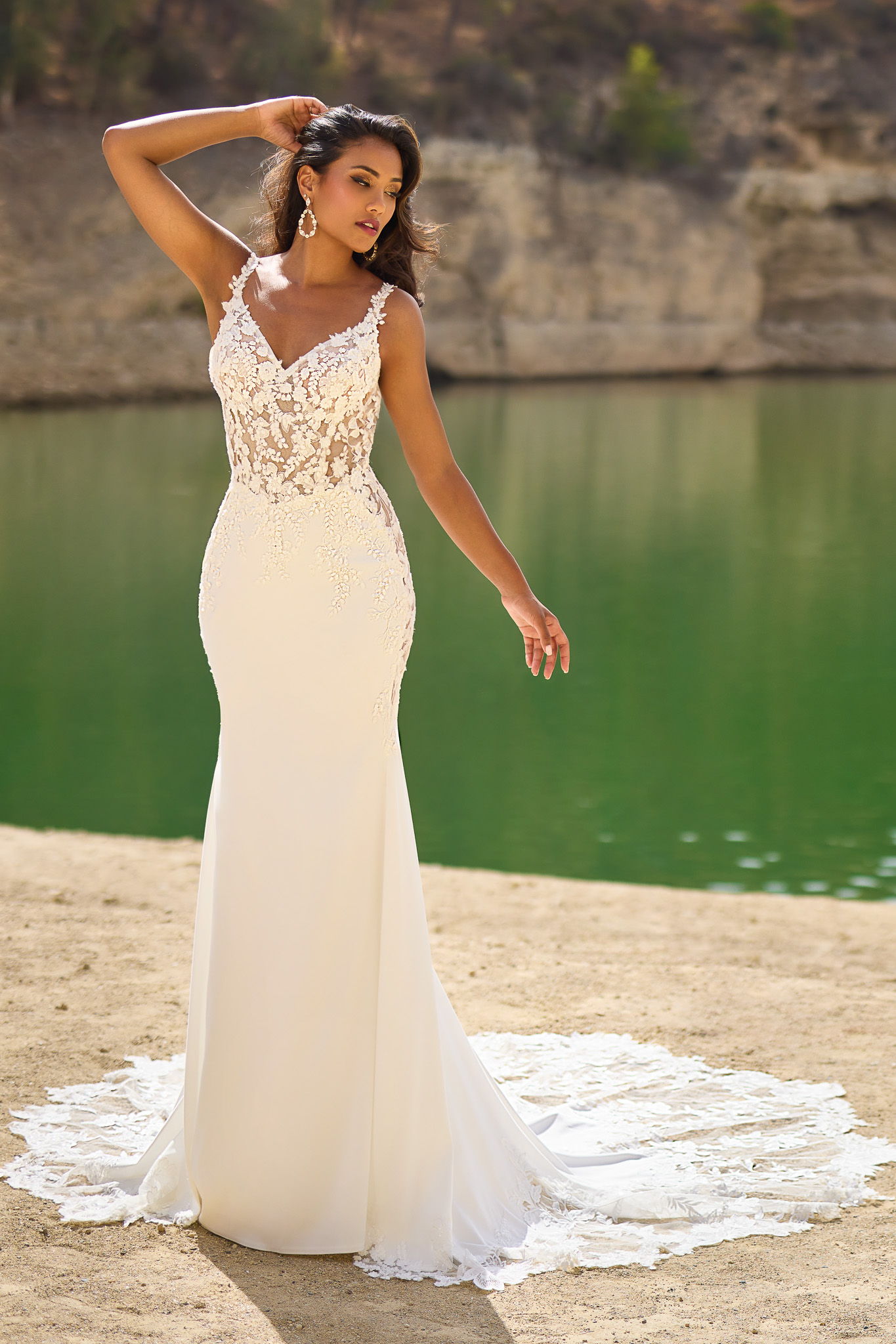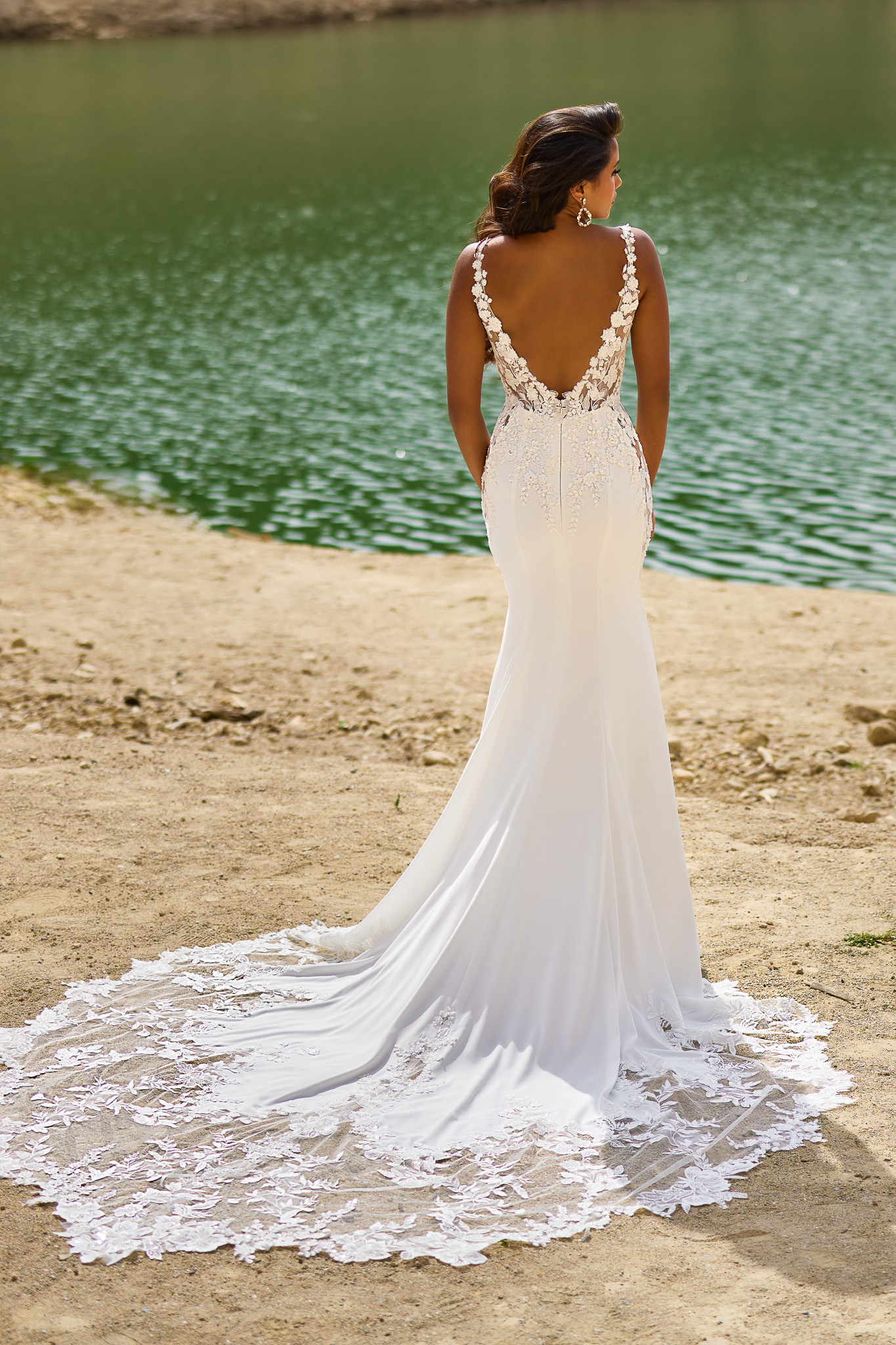 Dieses luxuriöse und dramatische Fit & Flare Brautkleid verfügt über einen atemberaubenden tiefen V-Ausschnitt an einem Oberteil, das mit eleganten Spitzenapplikationen verziert ist und die sanft über die Taille verlaufen. Der Rock ist aus Crêpe gefertigt, und die Schleppe zeigt ein wunderschönes Spitzendesign. Die transparenten Seiteneinsätze vervollständigen diesen außergewöhnlichen Look. Alle Materialdetails anzeigen