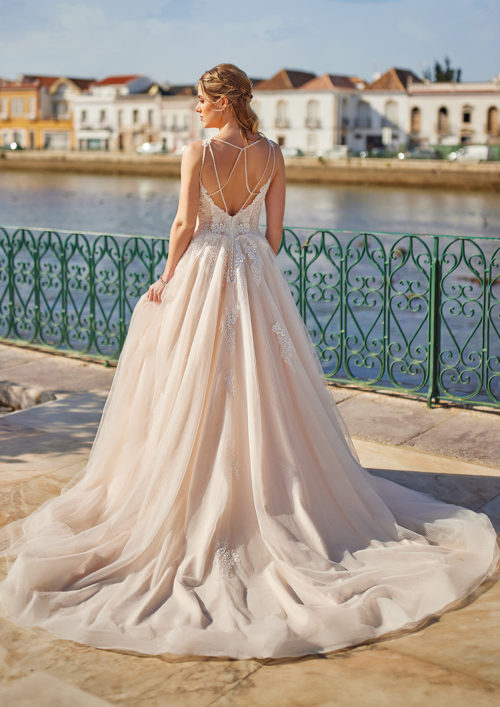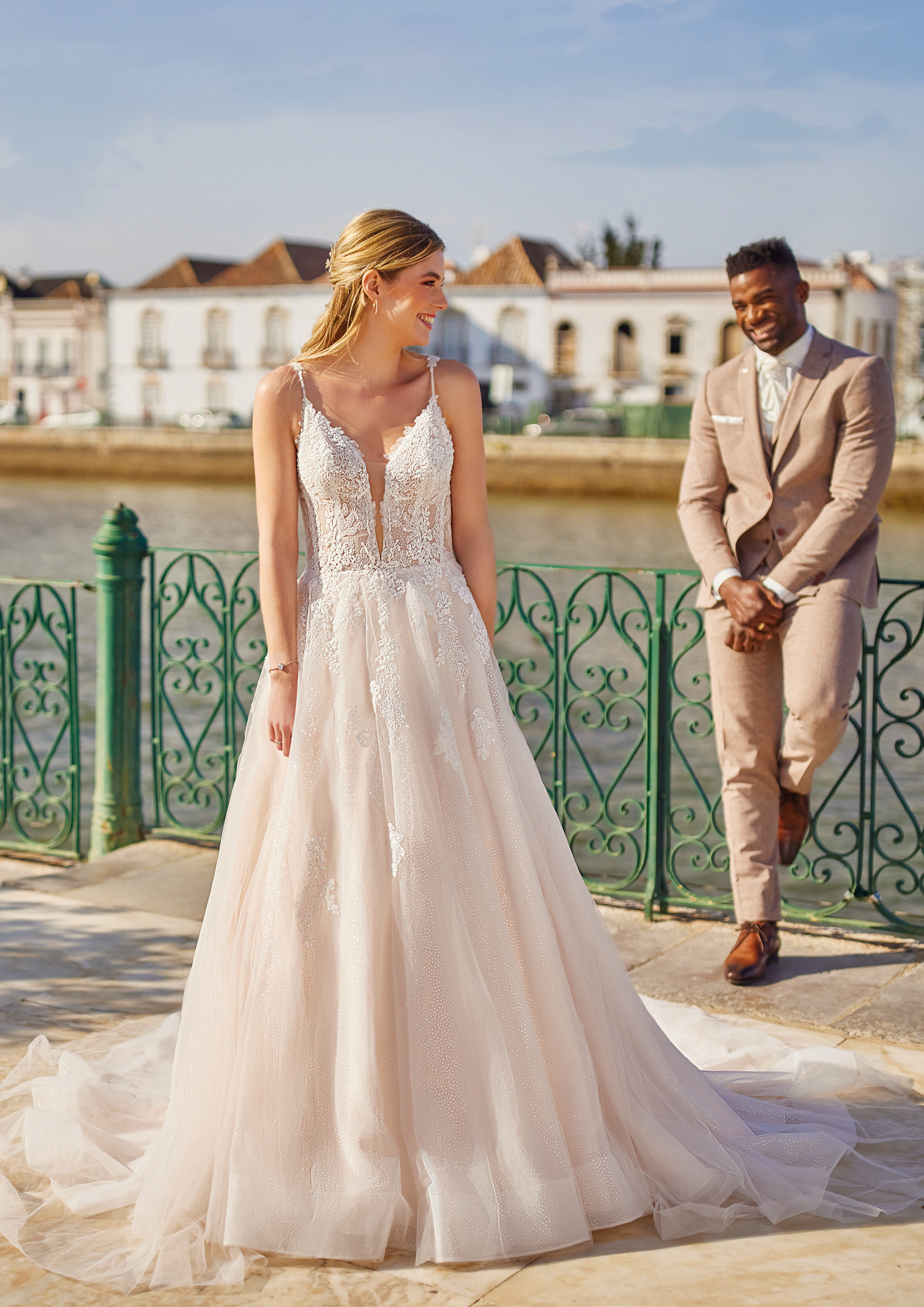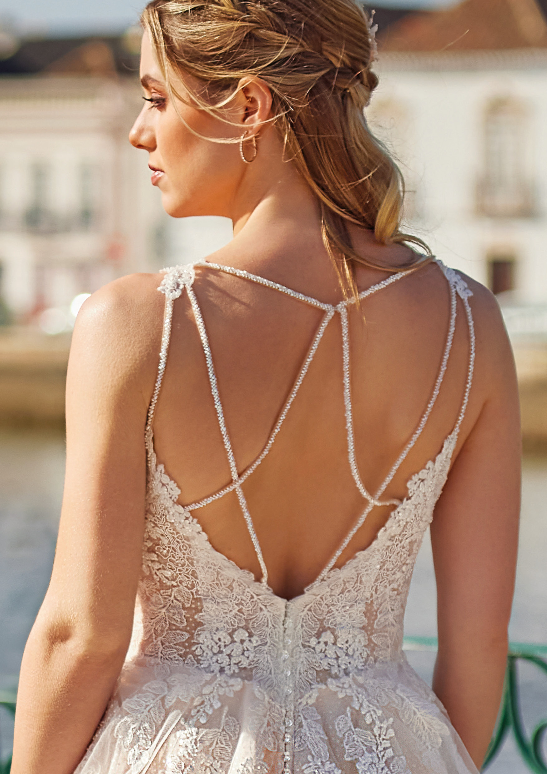 Romantisch und elegant ist dieses klassische champagnerfarbene Brautkleid im Stil A-Linie/Ballkleid. Es besticht durch ein spektakulär tief V-förmig ausgeschnittenes Mieder mit zarten, zierlichen Trägern, auf denen Strassdetails funkeln. Diese Trägern setzen sich fort in ein besonderes und wunderschönes Rückendetail. In einem filigranen Bild sind bestickte Spitzenapplikationen über den Rock verteilt. Eine zauberhafte, weich fließende Schleppe aus mehreren Lagen Tüll und Glitzer-Tüll rundet den Look des Kleides wunderschön ab. Auch im Farbton Elfenbein erhältlich. Alle Materialdetails anzeigen