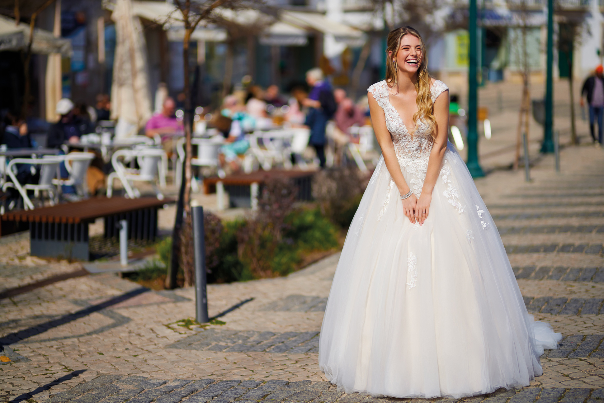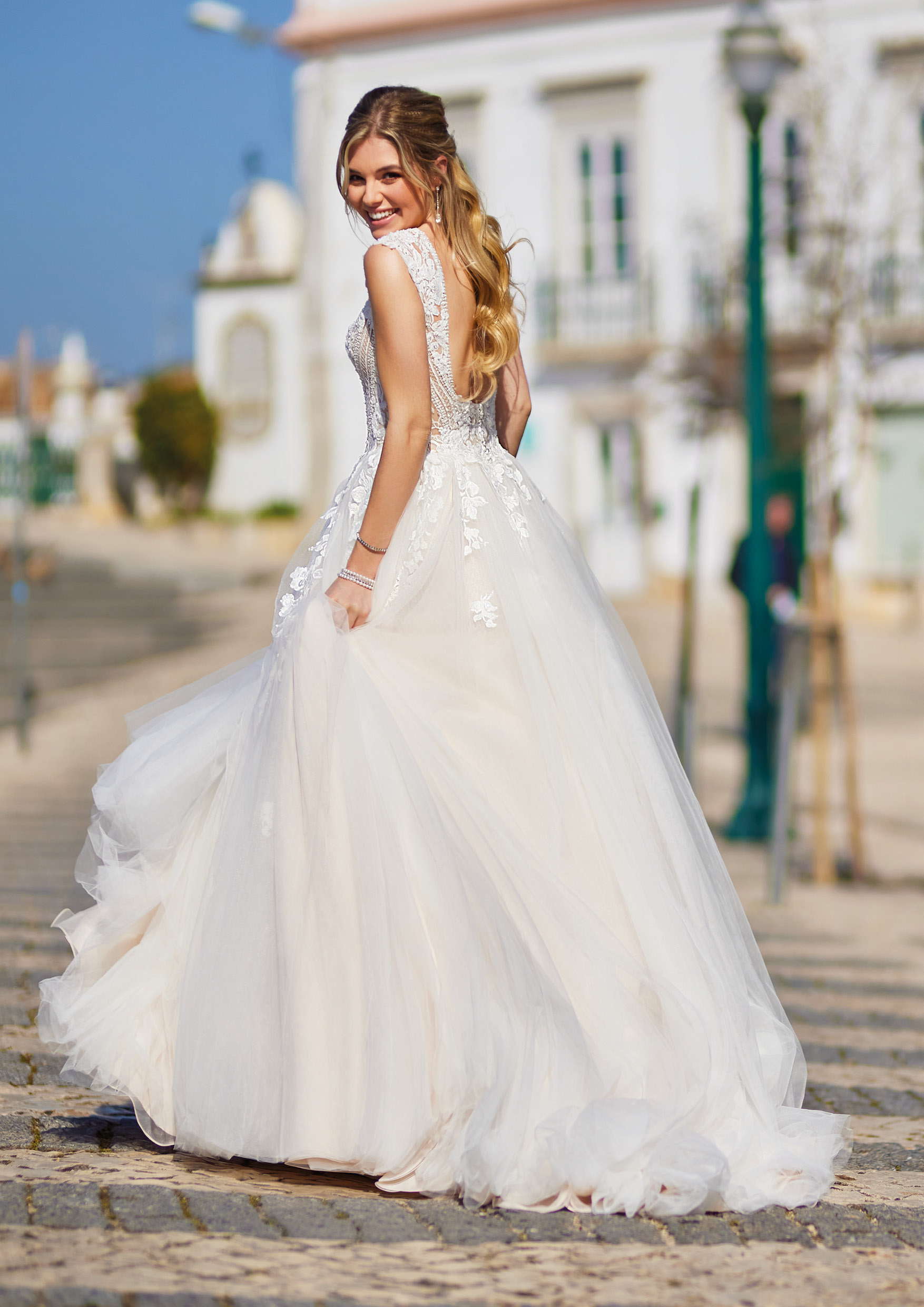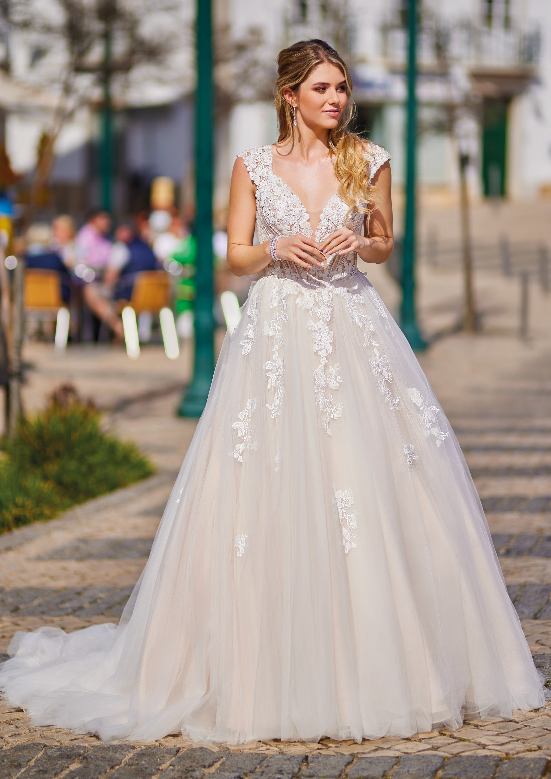 Romantisch und wunderschön ist die Ausstrahlung dieses klassischen champagnerfarbenen Brautkleides im Stil A-Linie. Es besticht durch ein tief in V-Form ausgeschnittenes Mieder mit filigranen Kappärmeln aus bestickter Spitze, die im Rücken in einen bezaubernden V-Ausschnitt übergehen. Die filigrane Spitze verläuft über die Taille hinweg abwärts. Mehrere Lagen weich fließenden Tüllgewebes kreieren den bauschigen Look des Rockes und der Schleppe, die das Bild vollkommen abrundet. Auch im Farbton Elfenbein erhältlich. Alle Materialdetails anzeigen