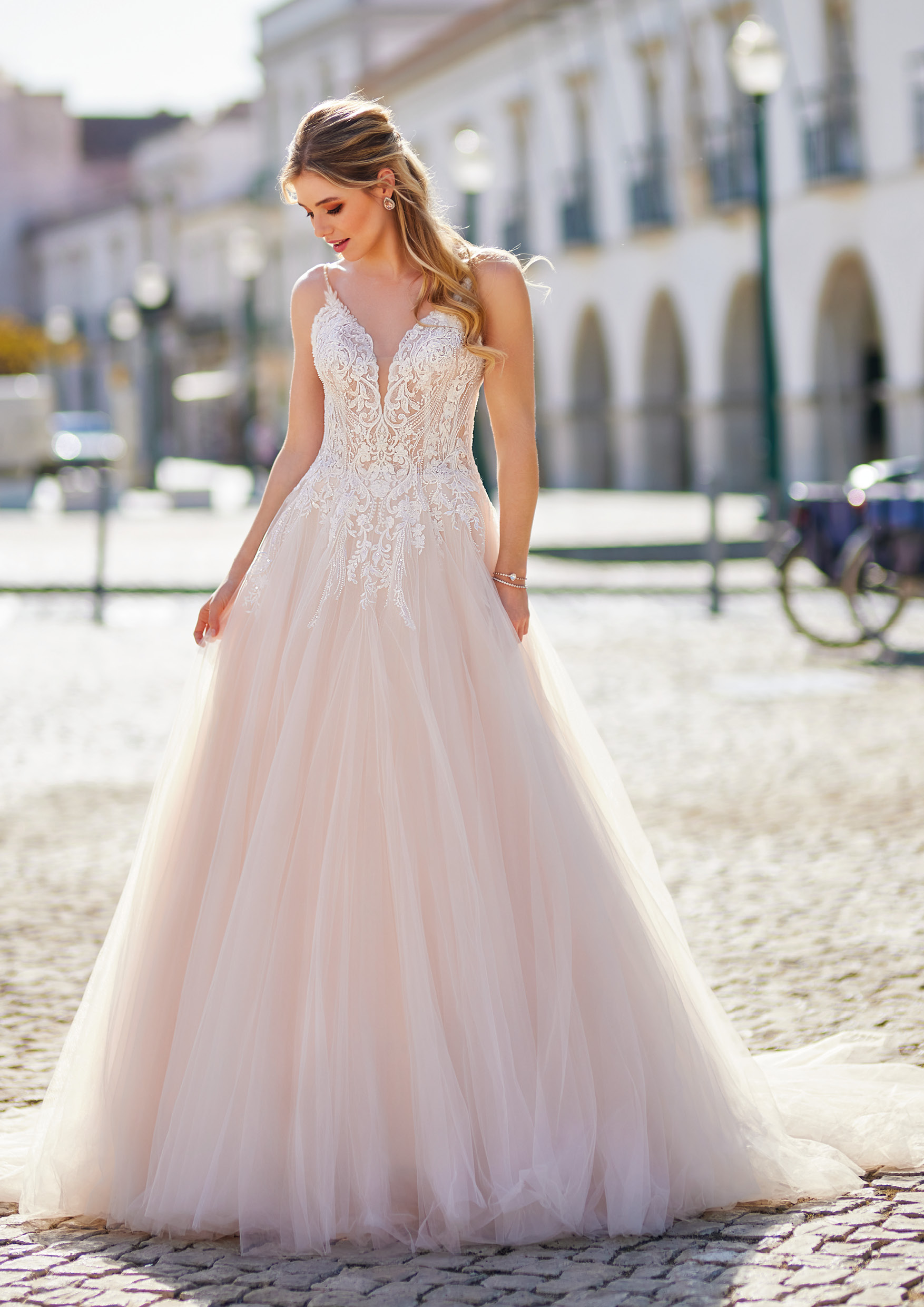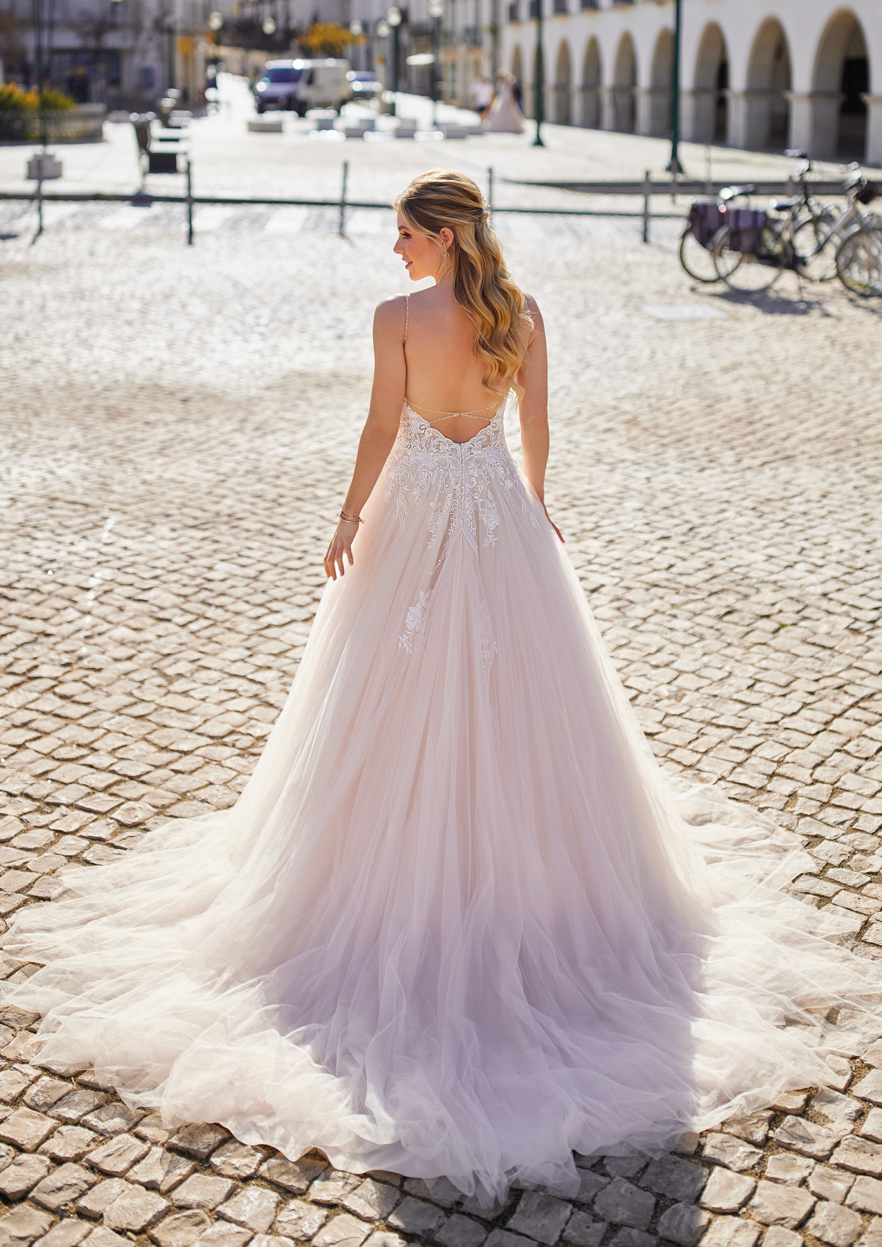 Romantisch und elegant ist dieses klassische champagnerfarbene Brautkleid im Stil A-Linie/Ballkleid. Es besticht durch ein spektakulär tief V-förmig ausgeschnittenes Mieder mit zarten, zierlichen Trägern, auf denen Strassdetails funkeln. Diese Trägern setzen sich fort in ein besonderes und wunderschönes Rückendetail. In einem filigranen Bild sind bestickte Spitzenapplikationen über den Rock verteilt. Eine zauberhafte, weich fließende Schleppe aus mehreren Lagen Tüll rundet den Look des Kleides wunderschön ab. Auch im Farbton Elfenbein erhältlich.  Alle Materialdetails anzeigen