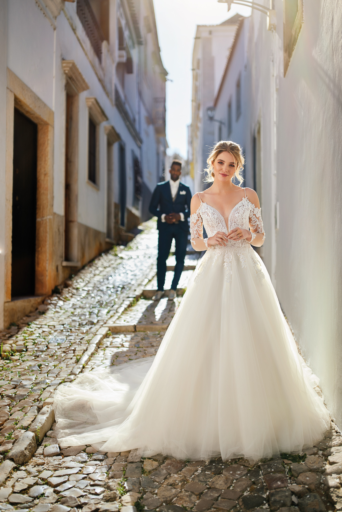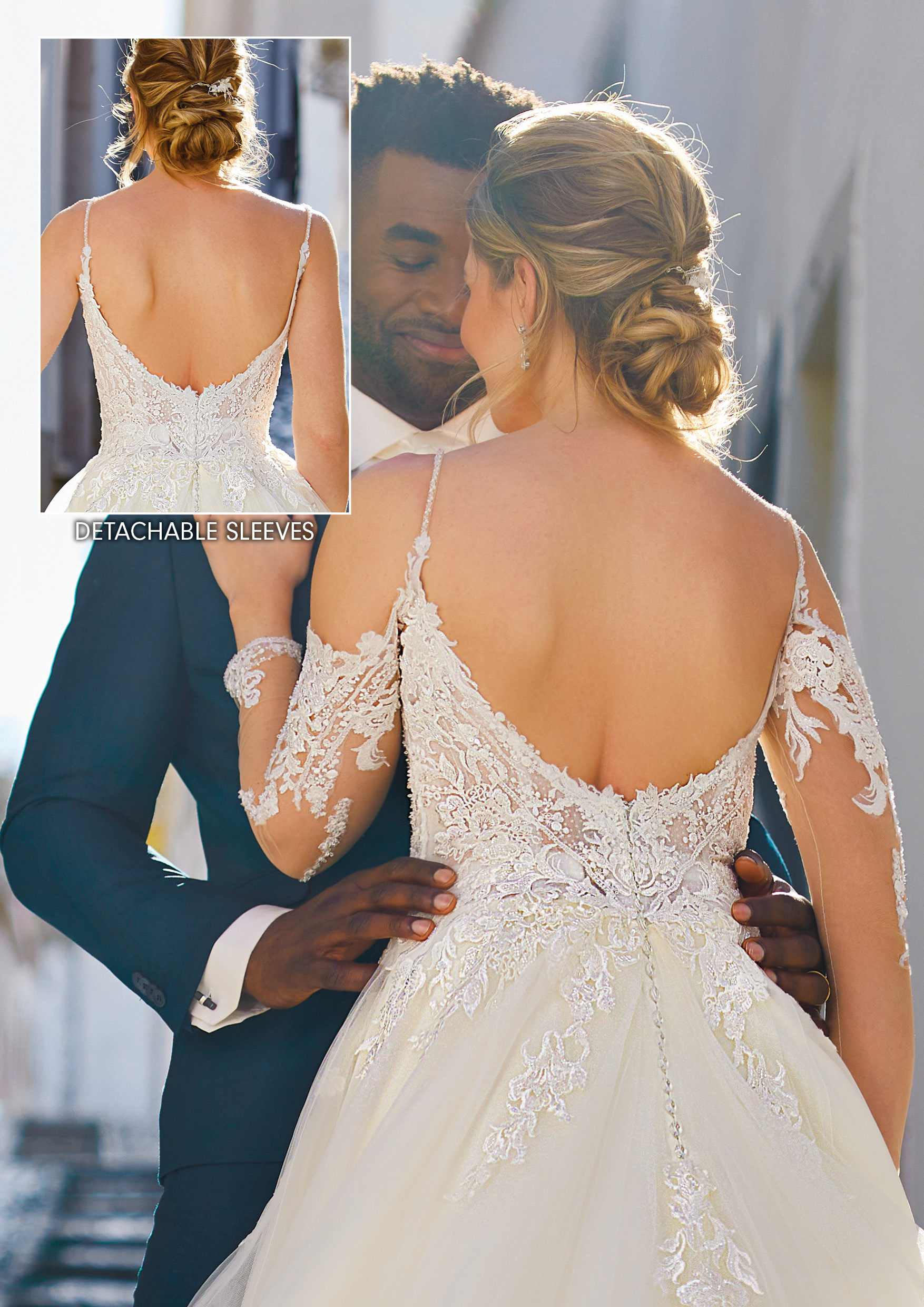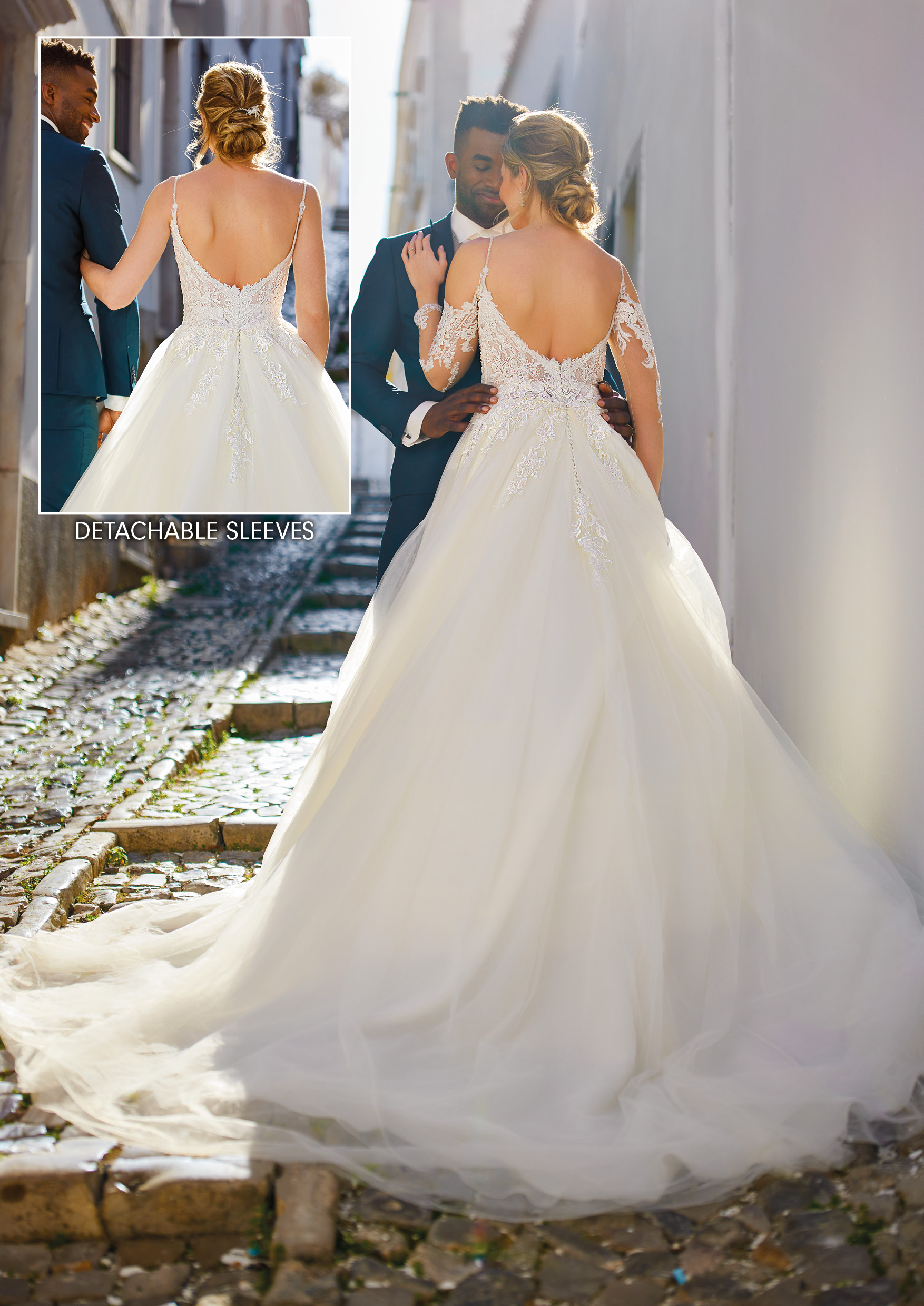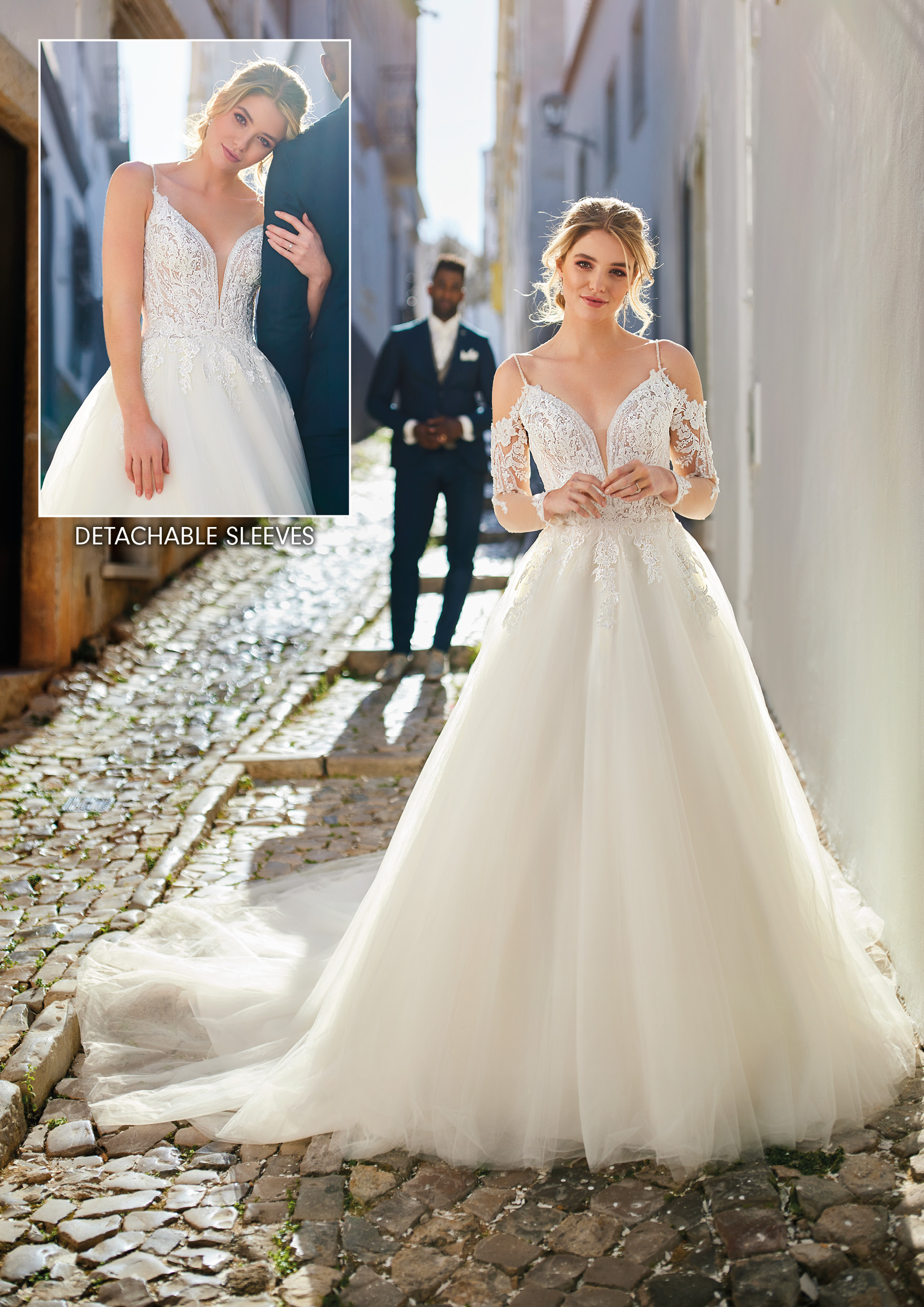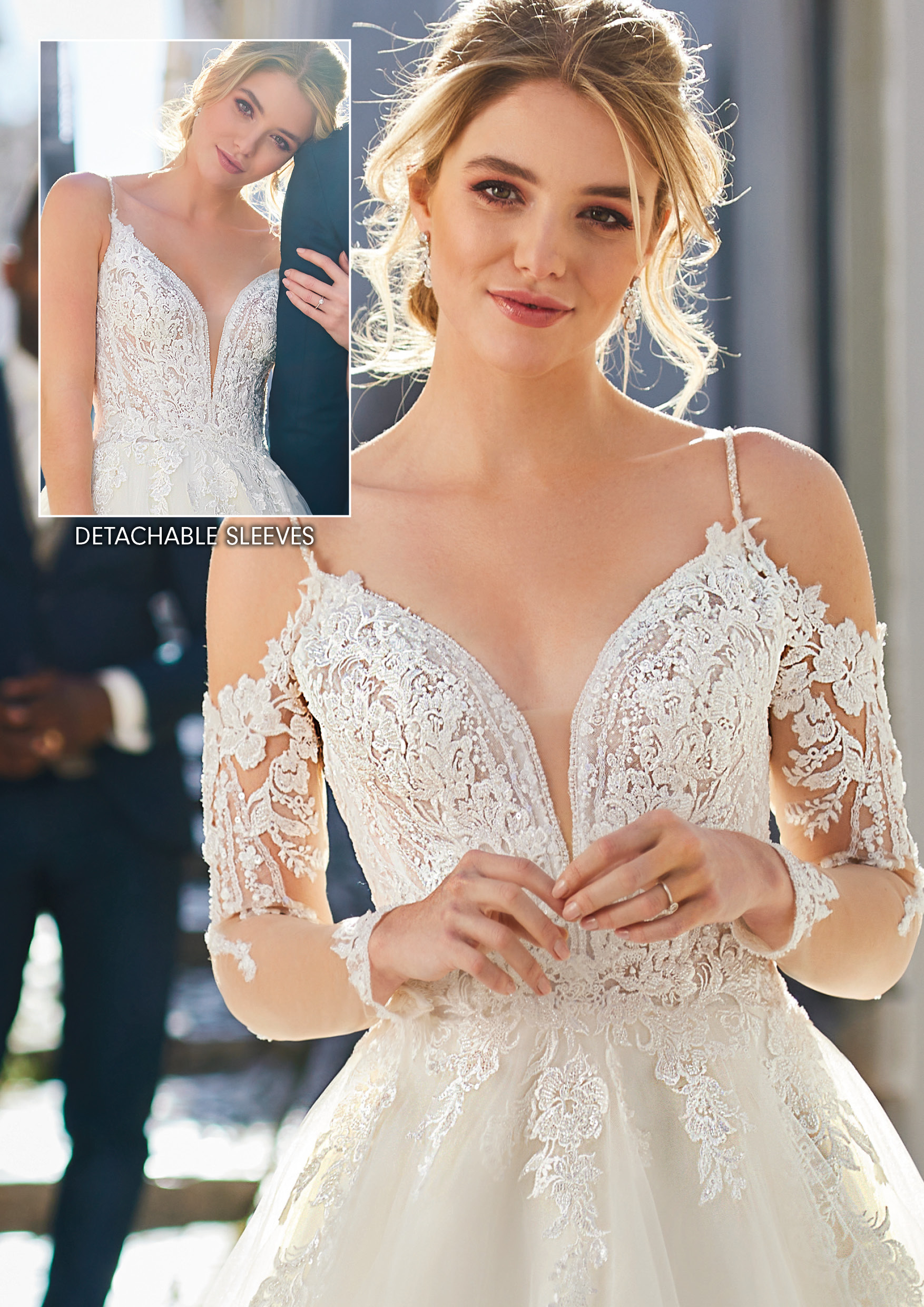 Romantisch, elegant und einzigartig ist dieses klassische Brautkleid im Stil A-Linie/Ballkleid. Es besticht durch ein zauberhaftes, abnehmbare langen Ärmel, das Flexibilität und eine Veränderung des Looks ermöglicht. Ohne die langen Ärmel wird die Wirkung durch ein einzigartiges, feminines Mieder mit einem tiefen V-förmige Ausschnitt bestimmt, das durch schmale, strassbesetzte Träger gehalten wird. Mit die langen Ärmel zaubern Sie einen romantischen und eher klassischen Look. Der Halsausschnitt und die langen Ärmel sind mit traumhafter bestickter Spitze überzogen, die einen außergewöhnlichen Effekt kreiert. Fühlen Sie sich wie eine Prinzessin und überraschen Sie Ihre Gäste mit zwei völlig unterschiedlichen Looks – beispielsweise einem Look für die Trauung und eine andere Optik für den Empfang und die Party danach! Alle Materialdetails anzeigen