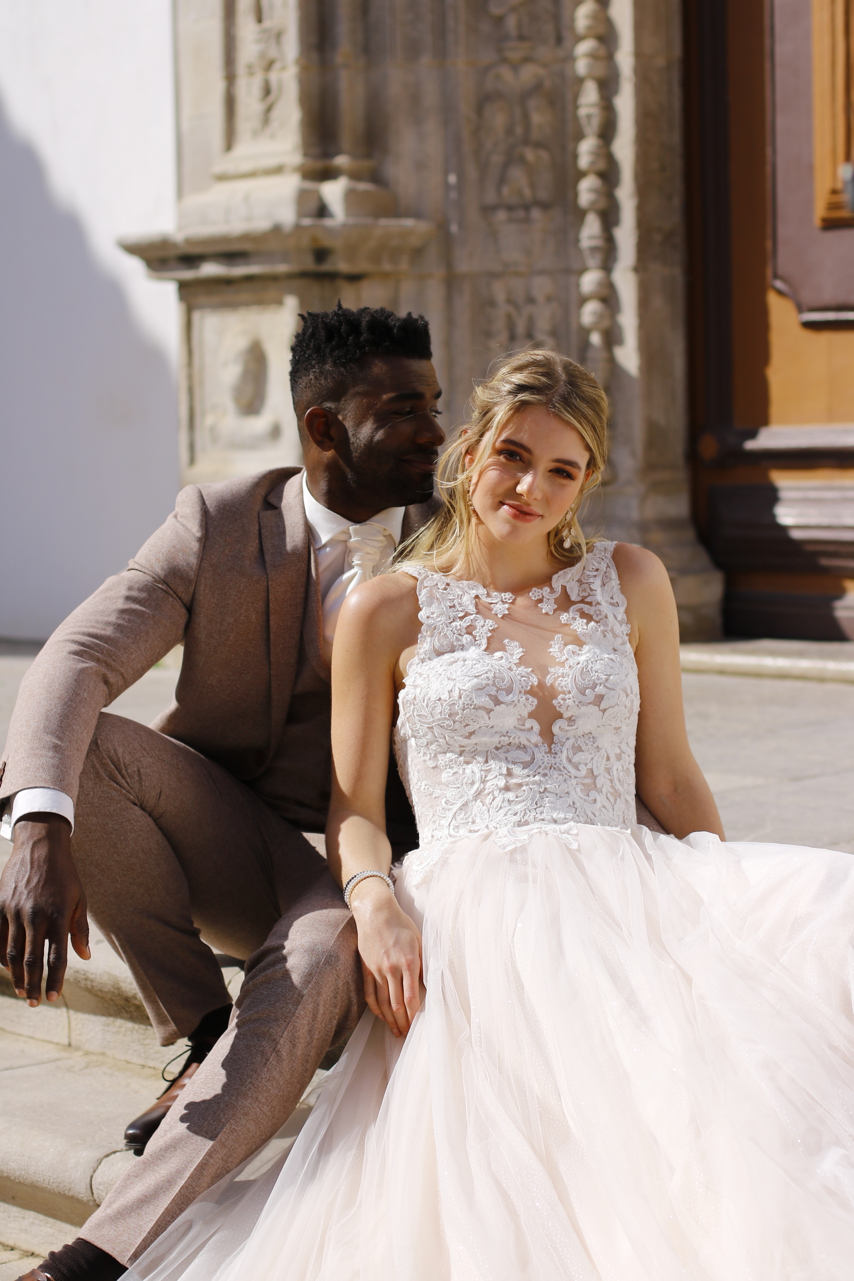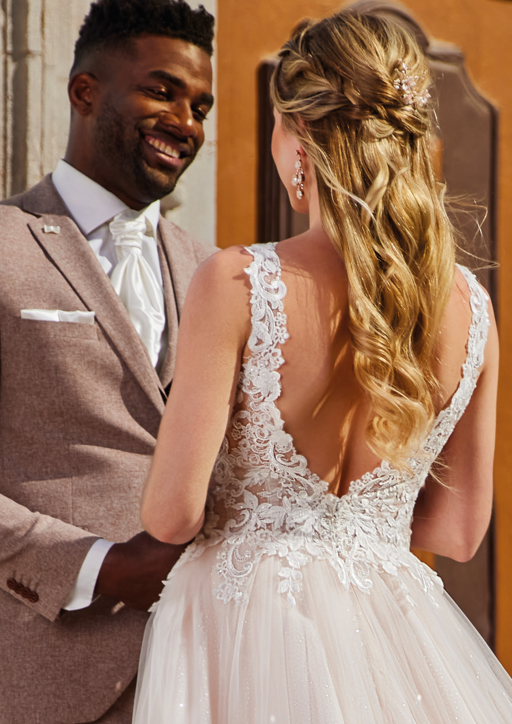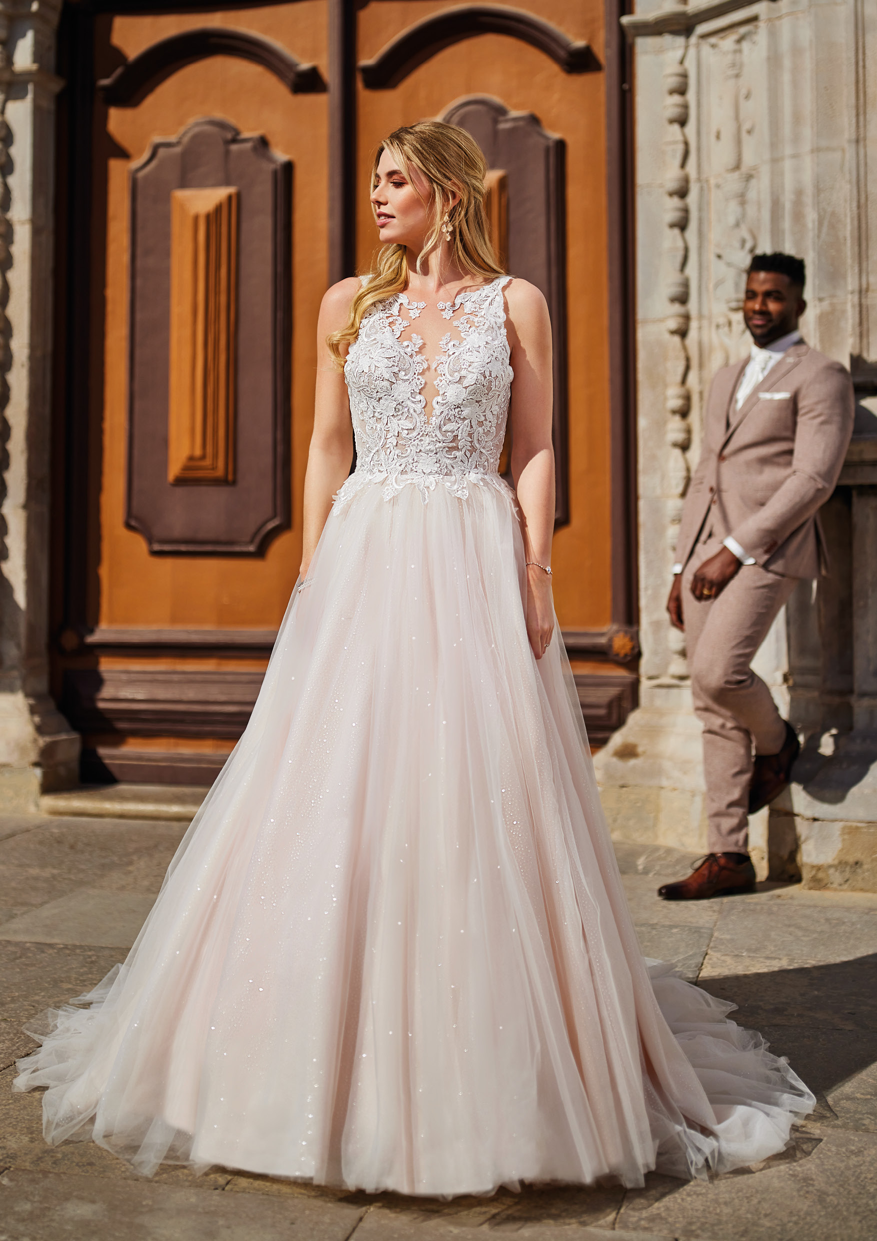 Faszinierend und romantisch ist das Flair dieses champagnerfarbenen Brautkleides im Prinzessinnen- oder auch A-Linien-/Ballkleid-Stil. Mit mehreren Fülle schaffenden Lagen von weichem (Glitzer) Tüllgewebe für den Rock und die fabelhafte Schleppe wirkt es einfach prachtvoll. Das Mieder ist im hoch ausgeschnittenen vorderen Bereich mit faszinierenden Spitzenapplikationen gestaltet, die sich auch auf den transparenten Stoffelementen fortsetzen und in der Rückenpartie einem V-förmigen Ausschnitt bilden. Auch im Farbton Elfenbein erhältlich Alle Materialdetails anzeigen