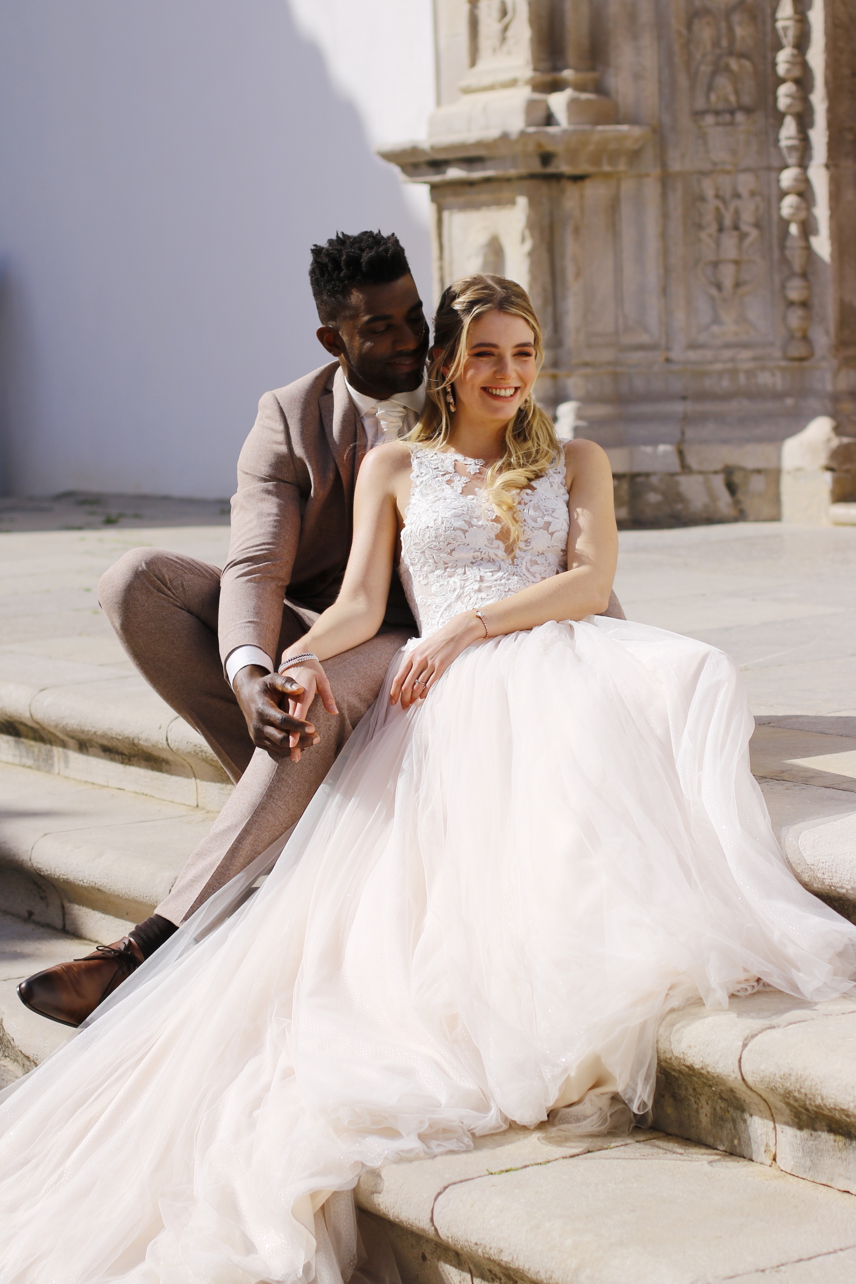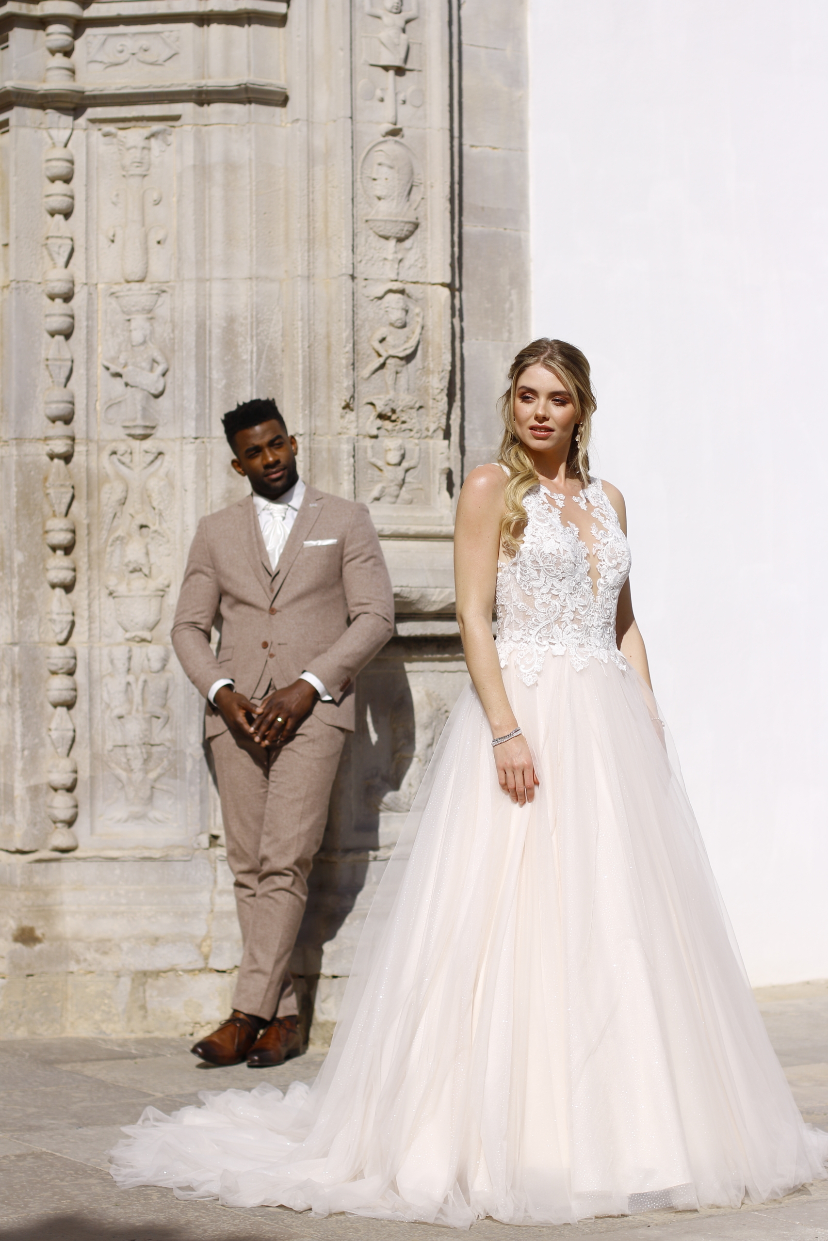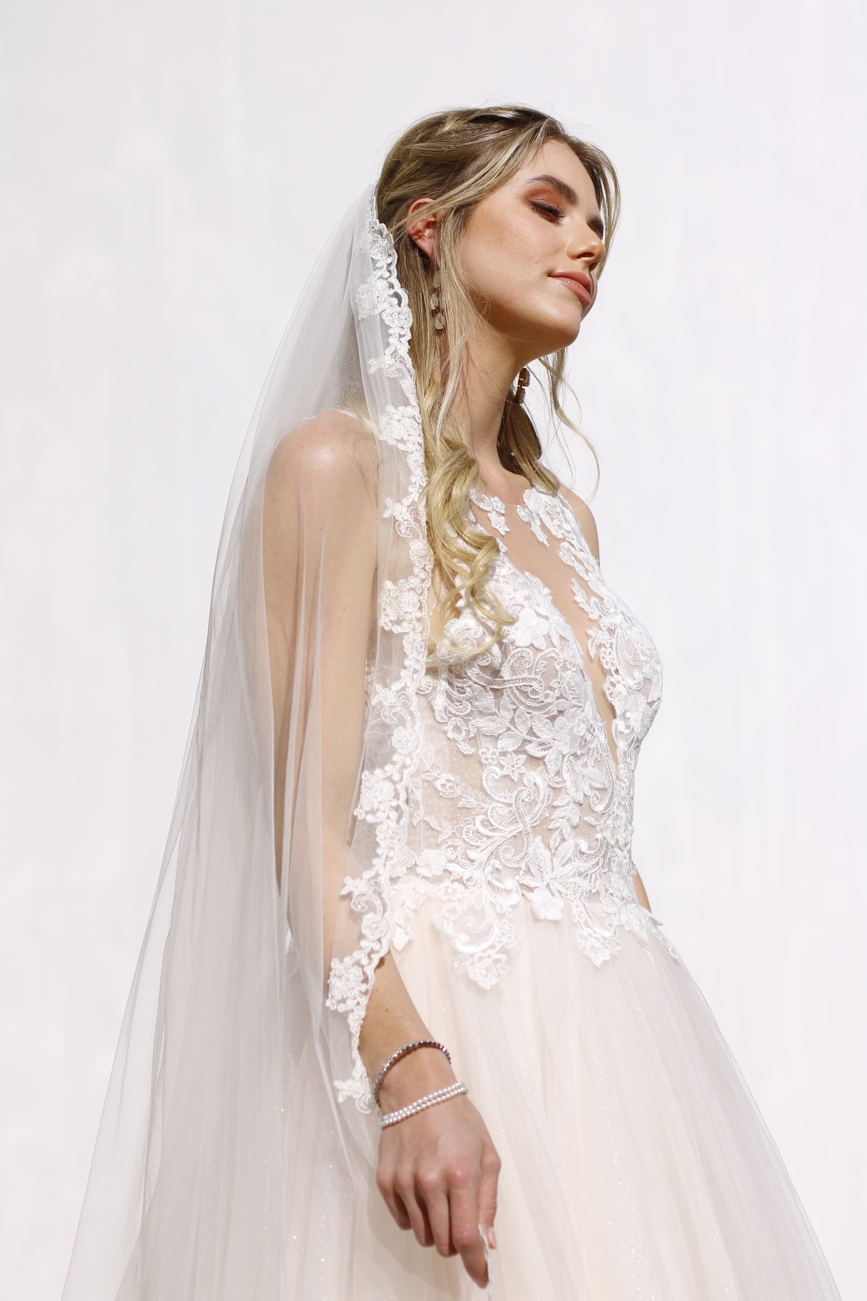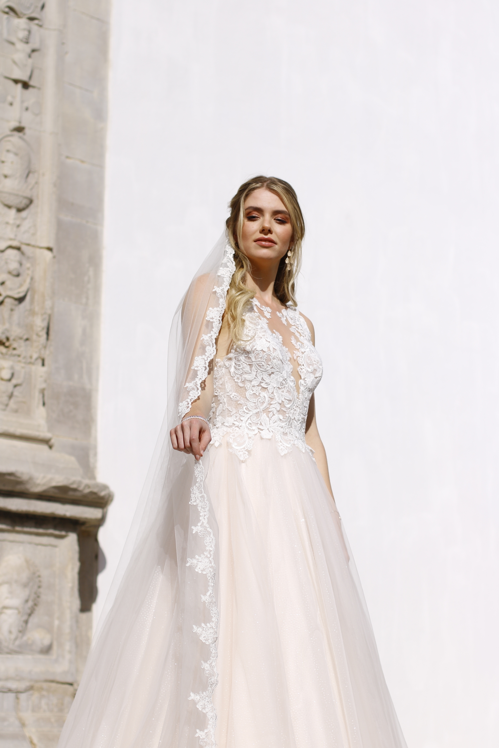 Faszinierend und romantisch ist das Flair dieses champagnerfarbenen Brautkleides im Prinzessinnen- oder auch A-Linien-/Ballkleid-Stil. Mit mehreren Fülle schaffenden Lagen von weichem (Glitzer) Tüllgewebe für den Rock und die fabelhafte Schleppe wirkt es einfach prachtvoll. Das Mieder ist im hoch ausgeschnittenen vorderen Bereich mit faszinierenden Spitzenapplikationen gestaltet, die sich auch auf den transparenten Stoffelementen fortsetzen und in der Rückenpartie einem V-förmigen Ausschnitt bilden. Auch im Farbton Elfenbein erhältlich Alle Materialdetails anzeigen