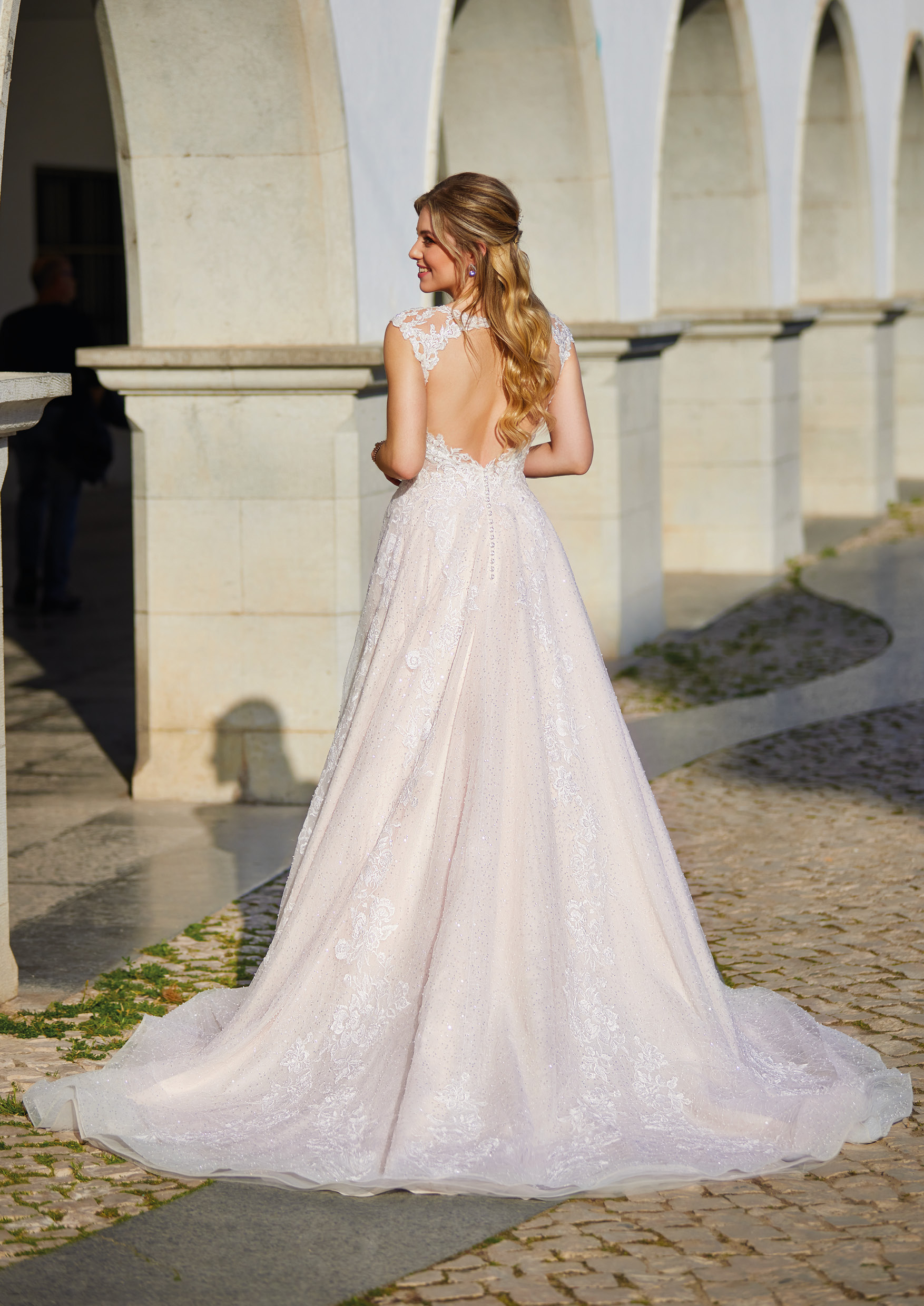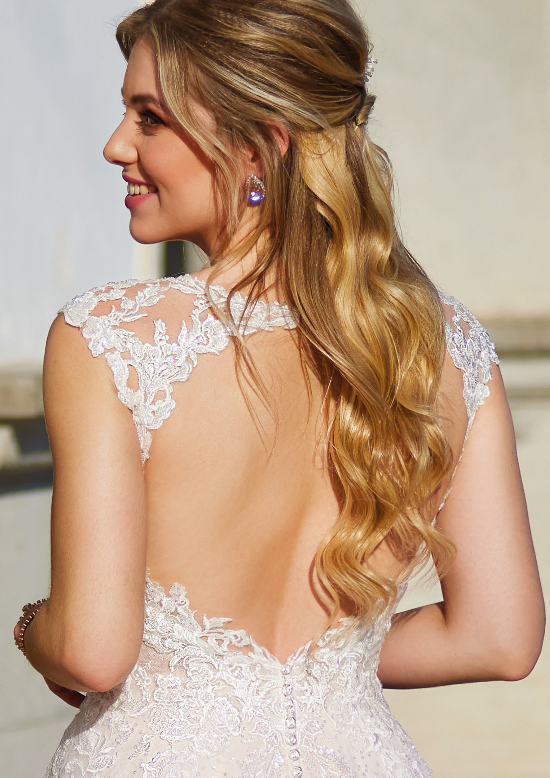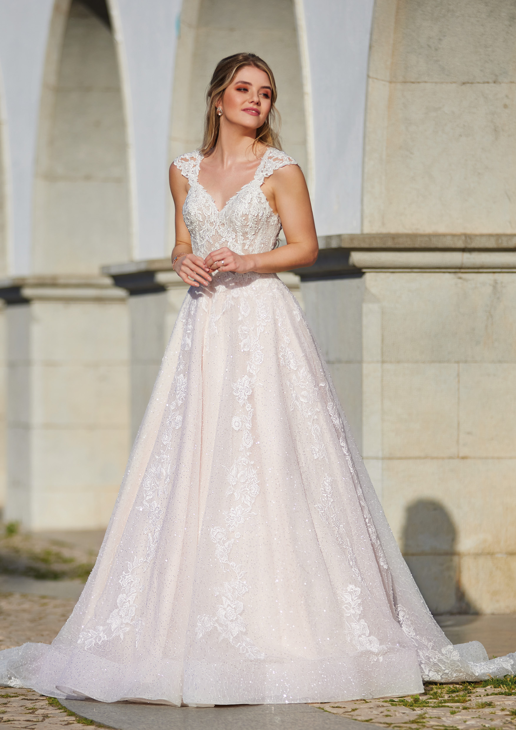 Romantisch und wunderschön ist das Flair dieses champagnerfarbenen, klassischen Brautkleides im Stil-Linie/Ballkleid. Es besticht durch ein prinzessinnenhaft V-förmig ausgeschnittenes Mieder mit filigranen Kappärmeln aus bestickter Spitze, die im Rücken in einen bezaubernden Schlüsselloch-Akzent übergehen. Die zarte Spitze verläuft über Taille und Hüften abwärts. Mehrere Lagen weich (Glitzer) Tüll kreieren den bauschigen Look des Rockes und der Schleppe, die das Bild vollkommen abrundet. Auch im Farbton Elfenbein erhältlich Alle Materialdetails anzeigen