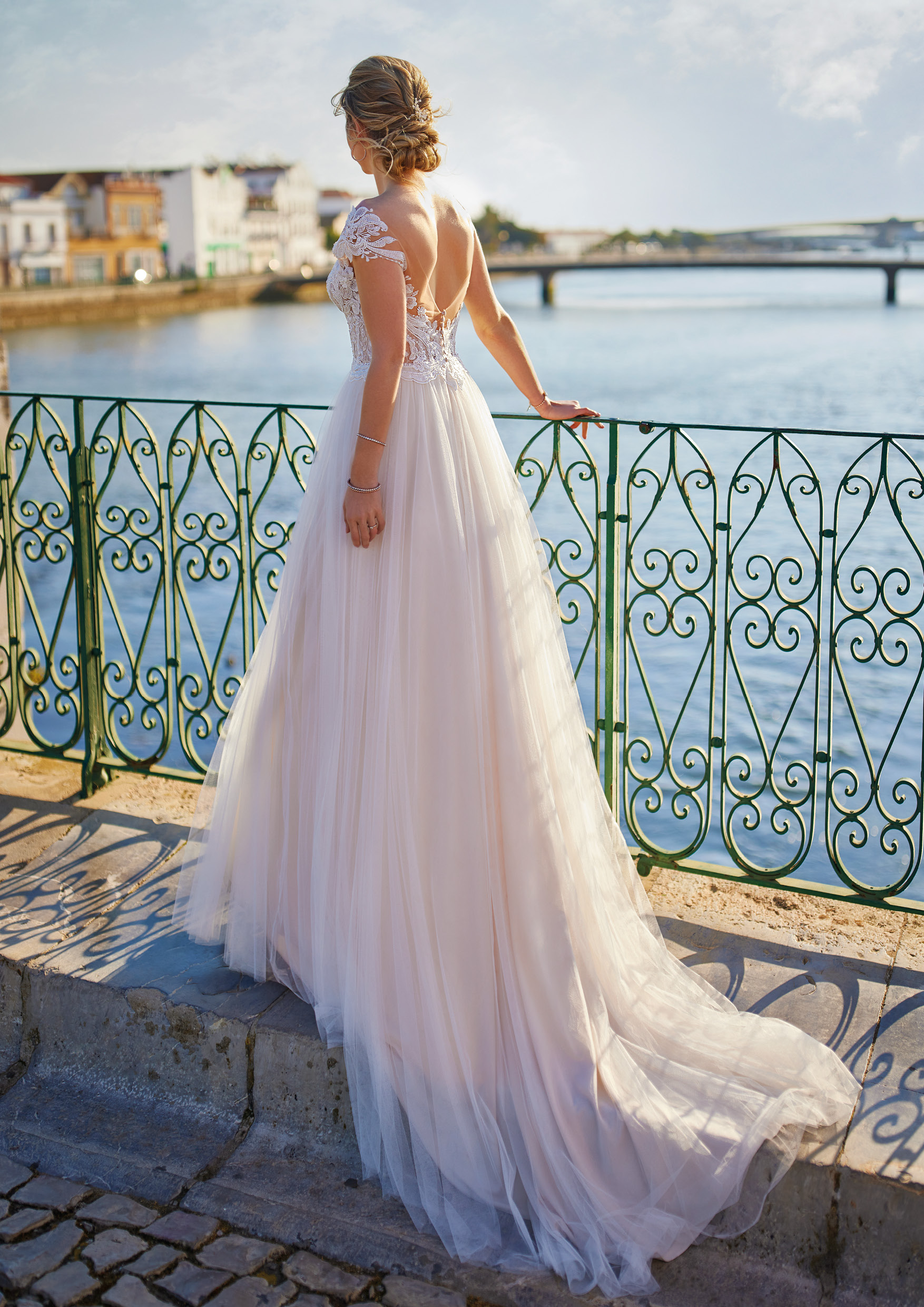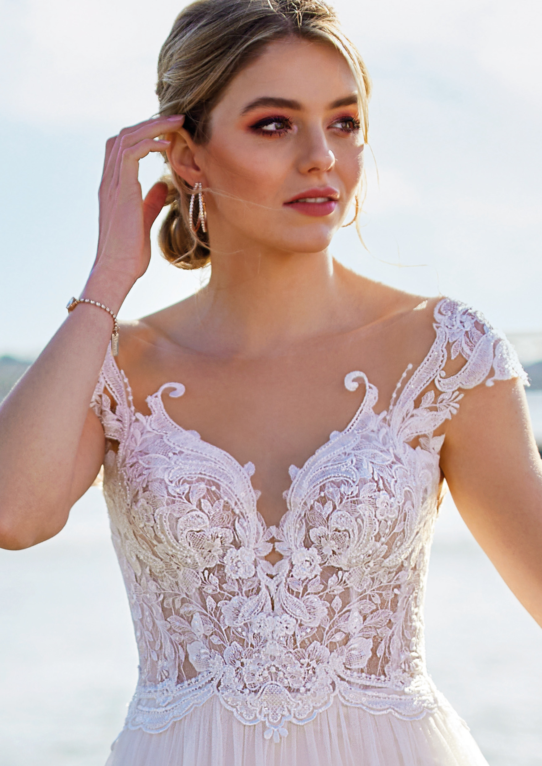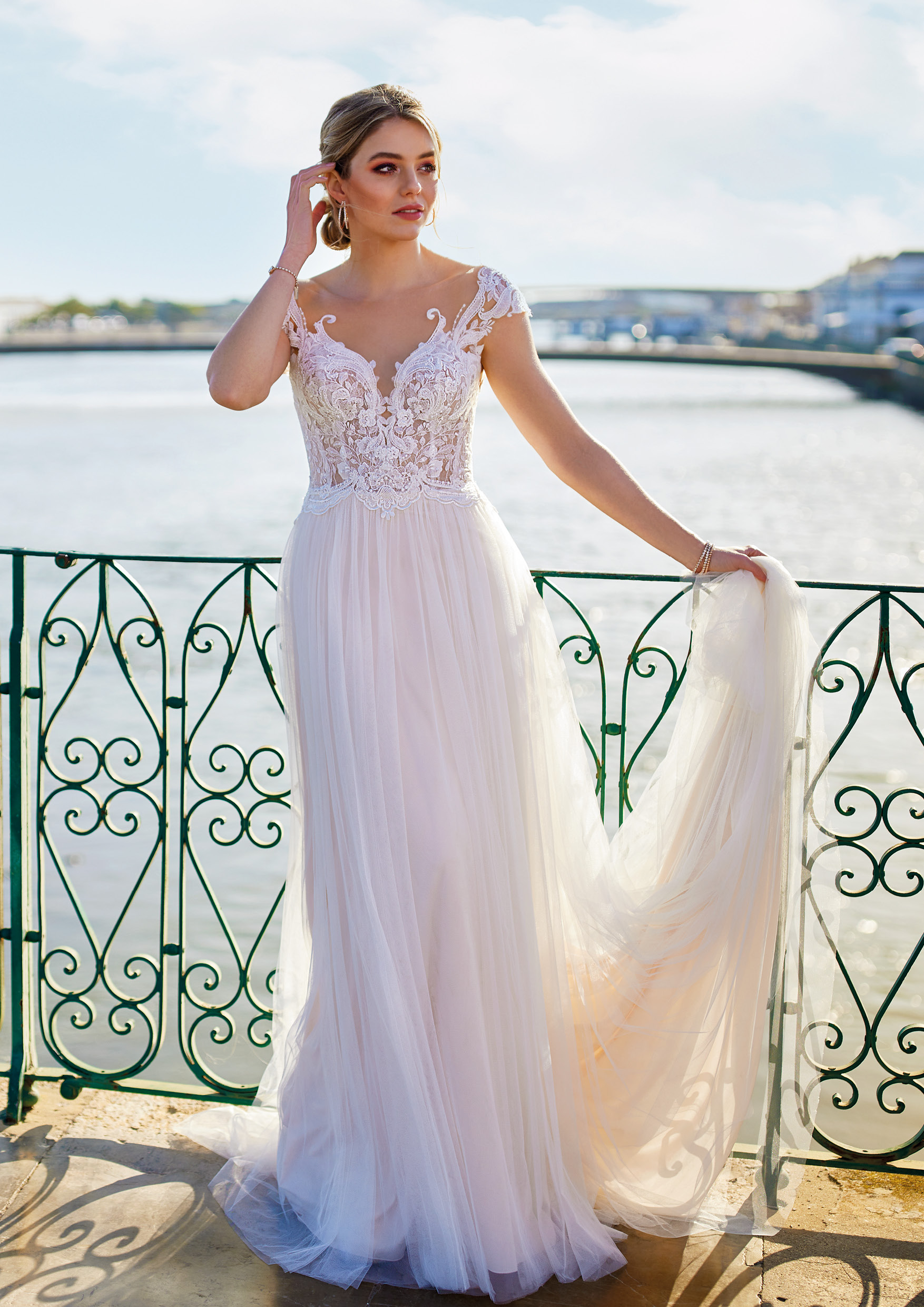 Romantisch und wunderschön ist das Flair dieses champagnerfarbenen, klassischen Brautkleides im Stil-Linie/Ballkleid. Es besticht durch ein prinzessinnenhaft herzförmig ausgeschnittenes Mieder mit filigranen, die Schultern beinahe frei lassenden Kappärmeln aus bestickter Spitze, die im Rücken mit zauberhafter Spitze auf transparentem Stoff ausgeführt ist. Mehrere Lagen weich fließenden Stoffes kreieren den eleganten Look des Rockes und der Schleppe, die das Bild vollkommen abrundet. Auch im Farbton Elfenbein erhältlich. Alle Materialdetails anzeigen