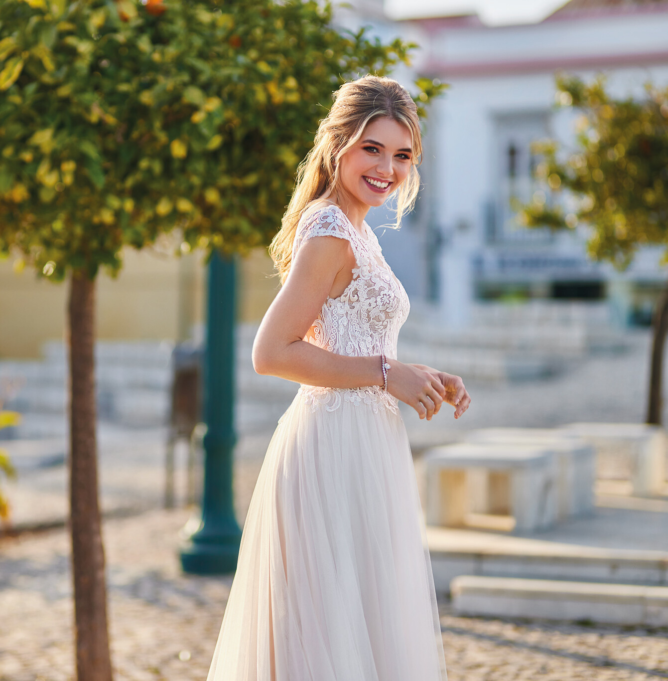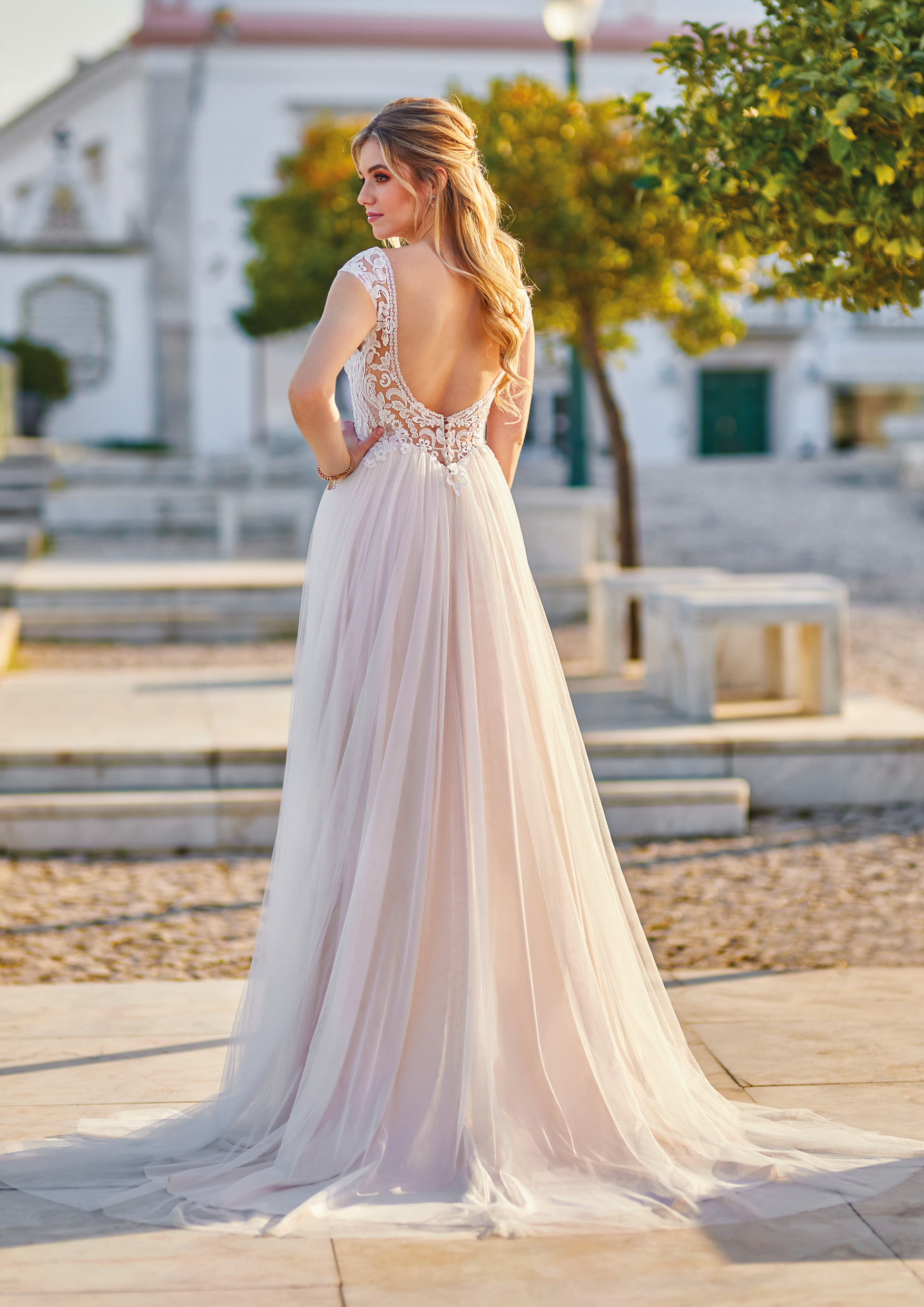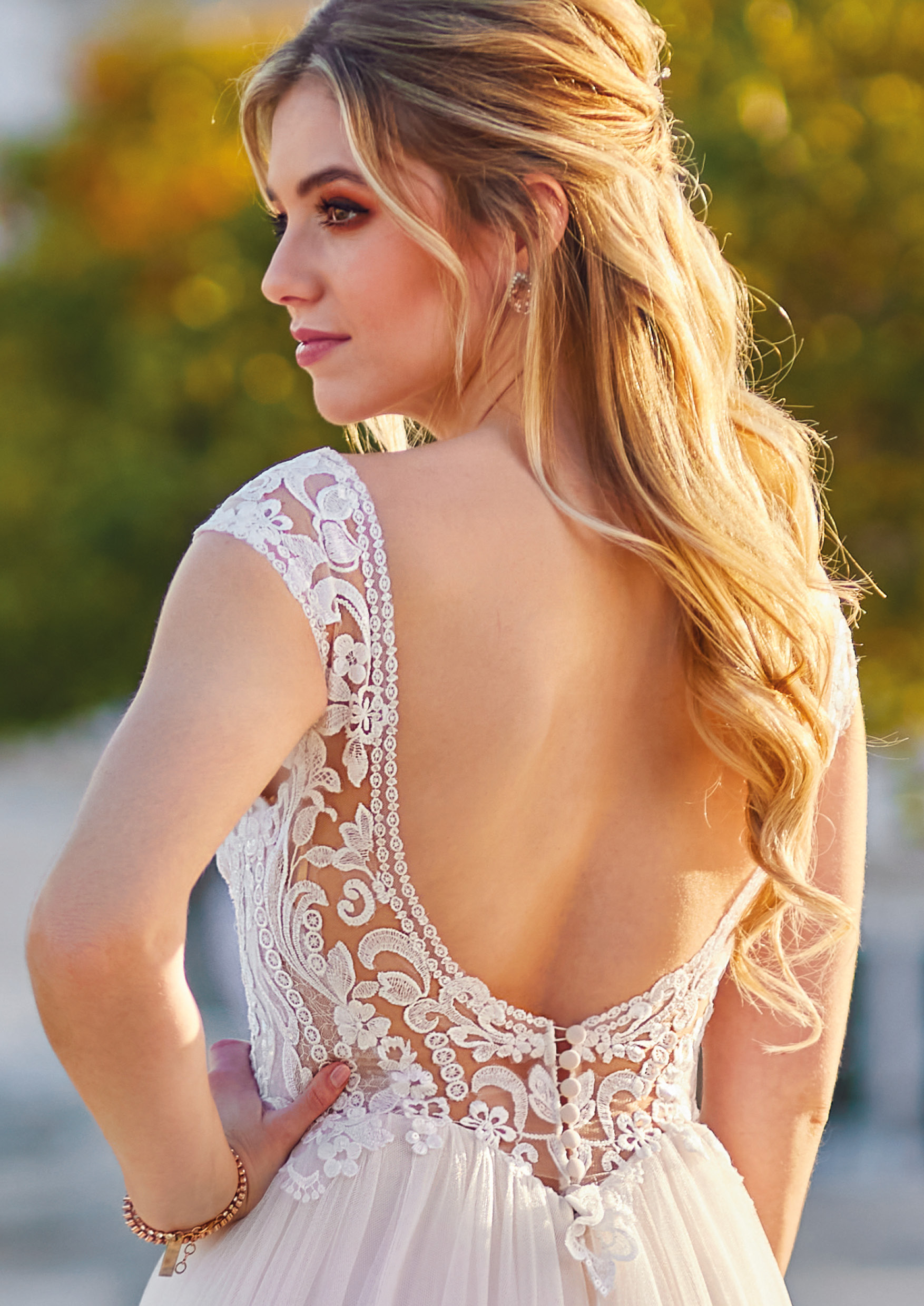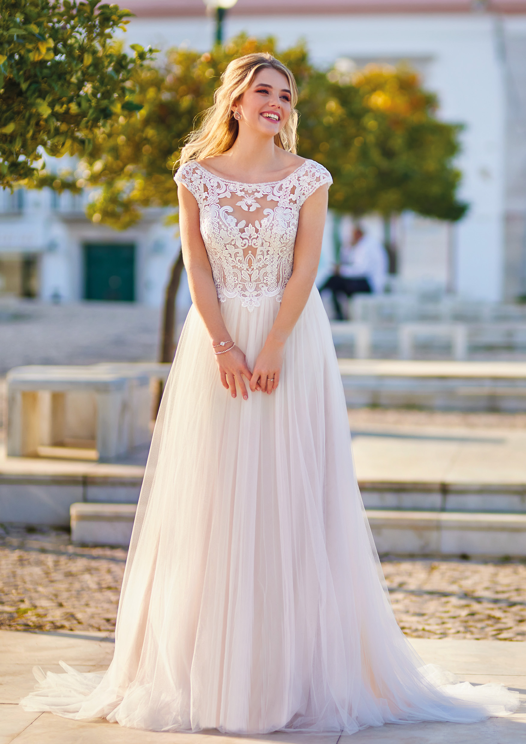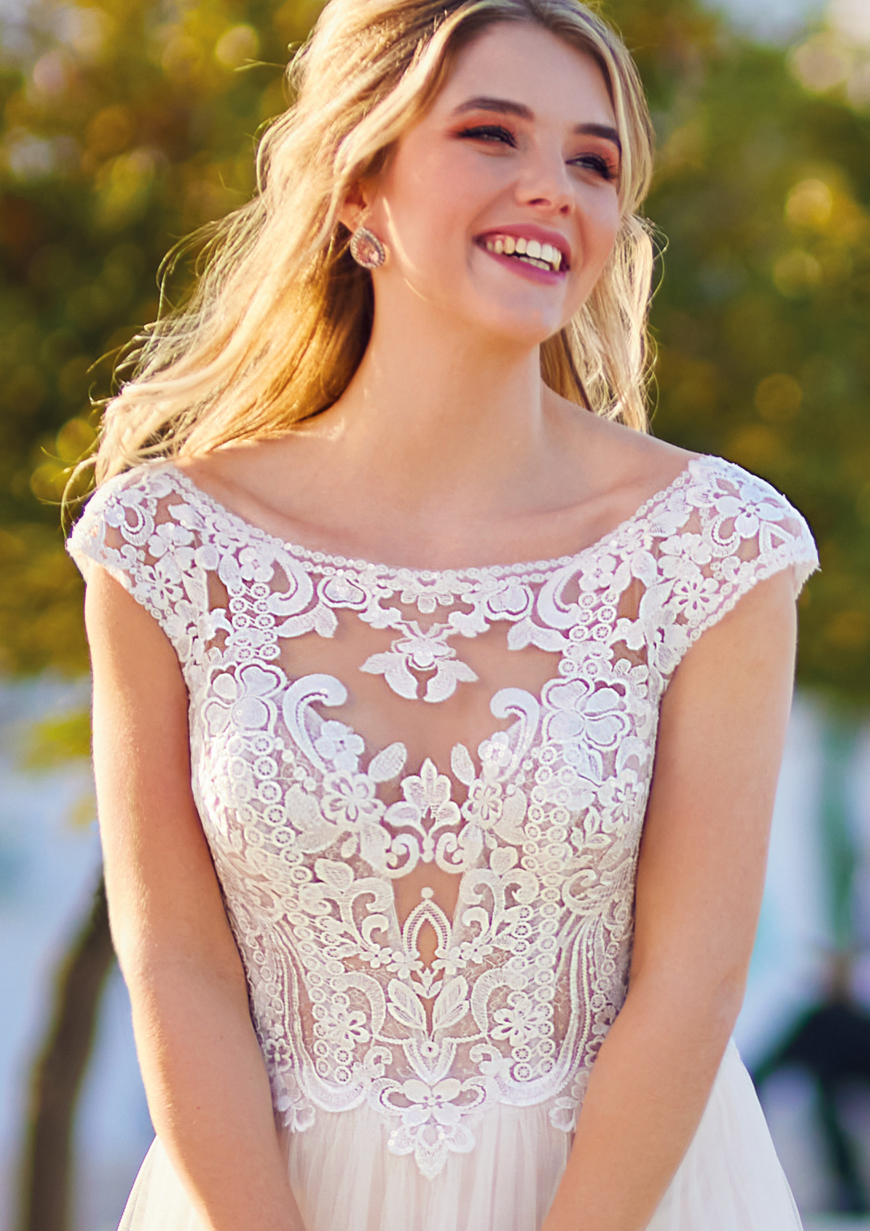 Romantisch und wunderschön ist das Flair dieses champagnerfarbenen, klassischen Brautkleides im Stil-Linie/Ballkleid. Es besticht durch einen hohen Ausschnitt in Kombination mit einem Sweetheart-Detail und eleganten Kappärmeln. Die Rückenpartie ist mit einem V-förmigen Ausschnitt und aus romantische Spitze gefertigt, das sich fort setzt in die Kappärmeln. Mehrere Lagen weich fließenden Tüll kreieren den eleganten Look des Rockes und der Schleppe, die das Bild vollkommen abrundet. Auch im Farbton Elfenbein erhältlich. Alle Materialdetails anzeigen