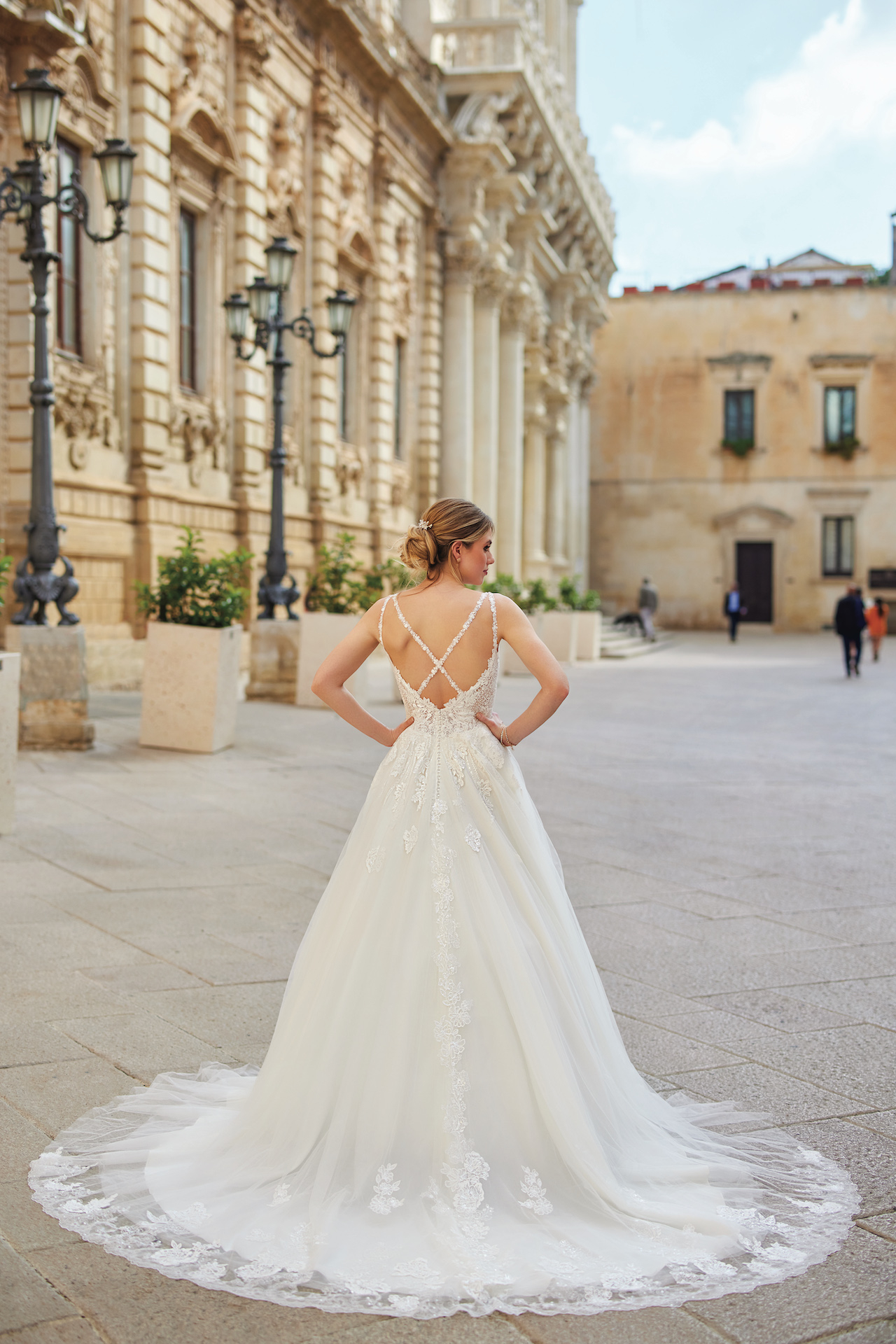 Ein traditionelles und elegantes Brautkleid mit wunderschönen Spitzenapplikationen am Oberteil, die über die Rückseite des Kleides verlaufen und den Schleppensaum betonen. Ein elegantes Kreuzmuster sorgt für einen dramatischen Akzent am Rücken. Der Rock ist aus mehreren Lagen Tüll und Satin gefertigt. Alle Materialdetails anzeigen