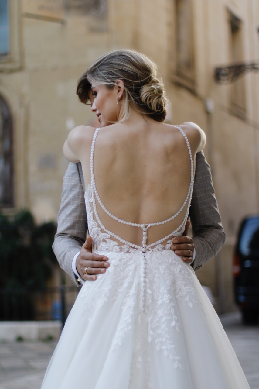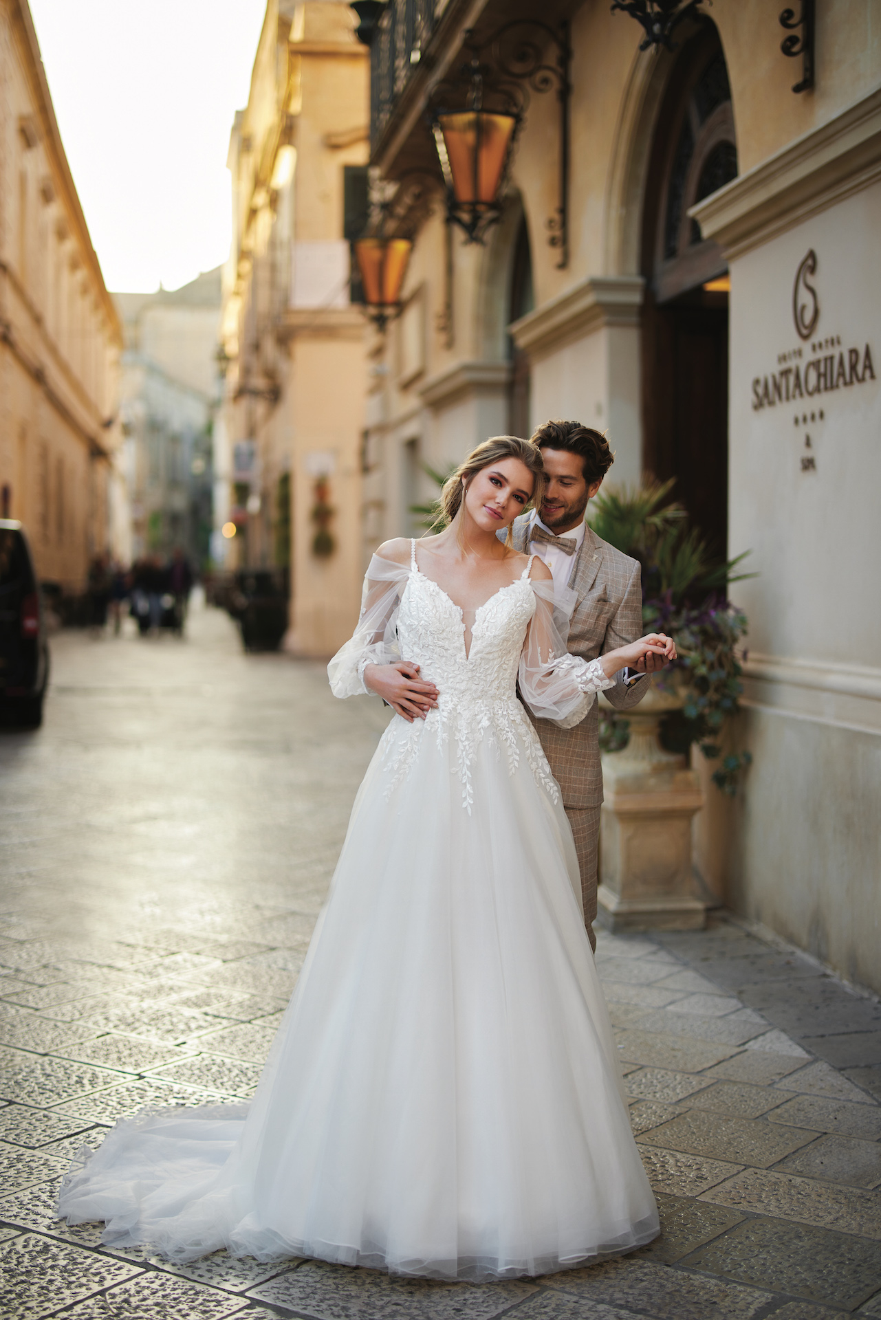 Dieses elegante Brautkleid im Double-Look ist mit luxuriösen abnehmbaren Ärmeln ausgestattet, um zwischen der Zeremonie und dem Empfang einen anderen Look zu schaffen. Das V-förmige Oberteil ist mit eleganten Spitzenapplikationen und dünnen Trägern verziert. Der Rock besteht aus mehreren Lagen Tüll, Organza und Satin. Alle Materialdetails anzeigen