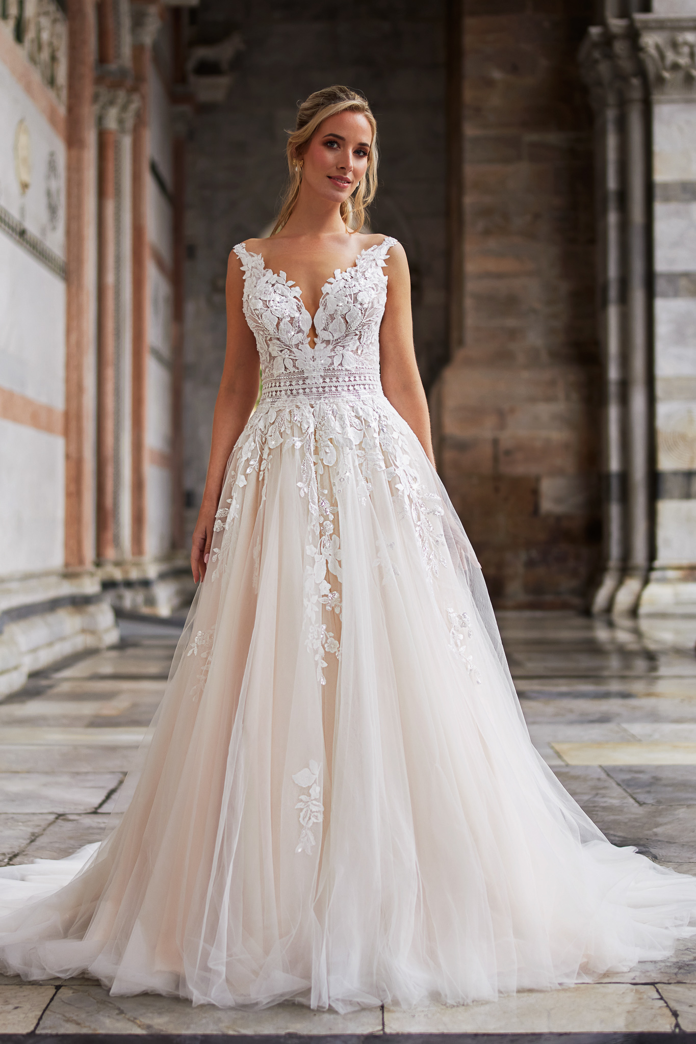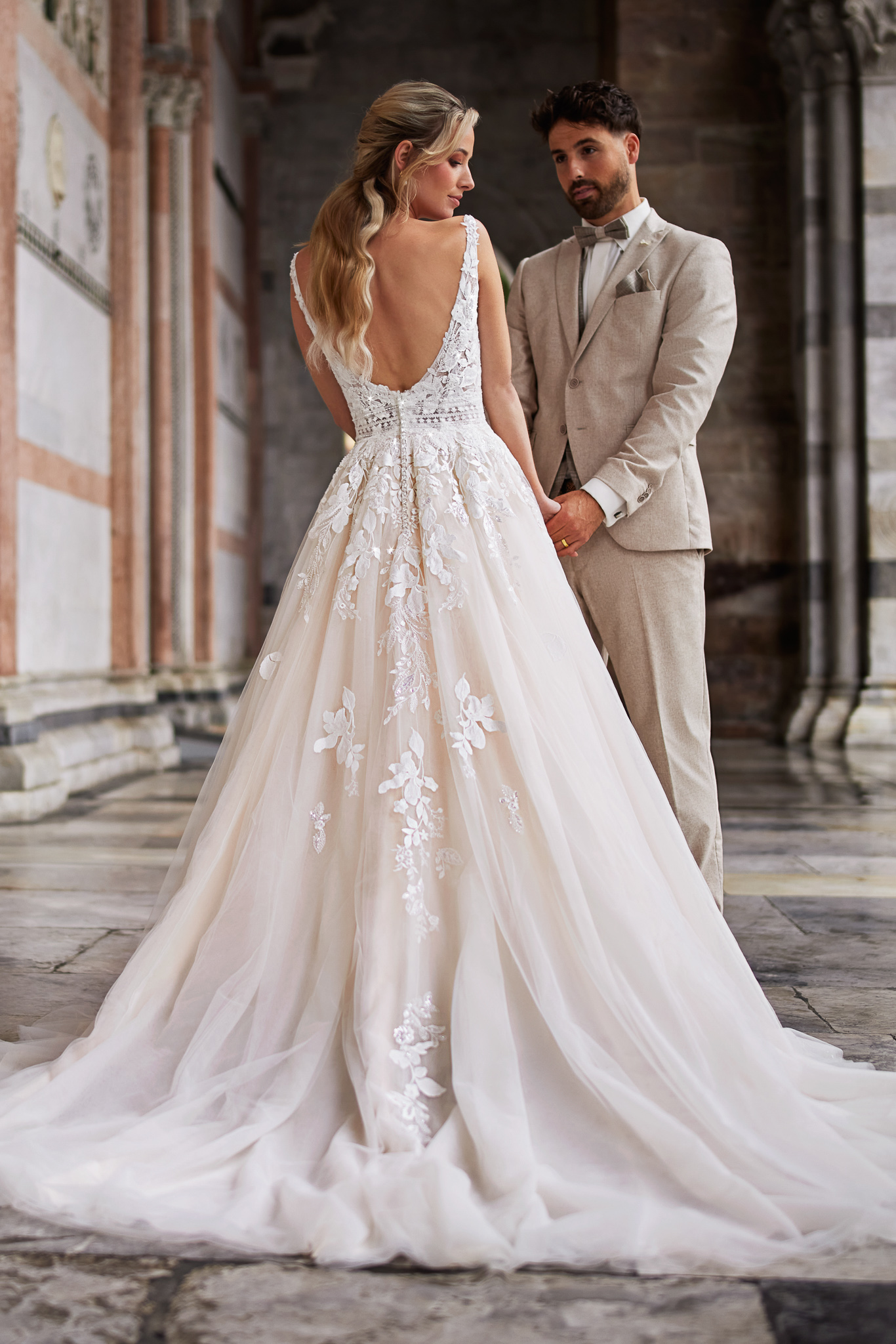 Dieses wunderschöne, glamouröse Brautkleid im Stil eines Ballkleides ist mit mehreren Lagen bauschigen, weichen Tülls sowie Stoffen für den Rock und die fabelhafte Schleppe ein Paradebeispiel für prachtvolles Design. Das Oberteil ist mit sehr detailliert mit wunderschönen Spitzenapplikationen verziert, die sich über das ganze Mieder hinziehen. Ein tiefer V-Ausschnitt prägt die Vorderpartie, und einen breiter Bund, der eine Sanduhr-Figur zaubert. Die gleiche Spitze bildet im Rücken eine spektakuläre V-Optik. Alle Materialdetails anzeigen
