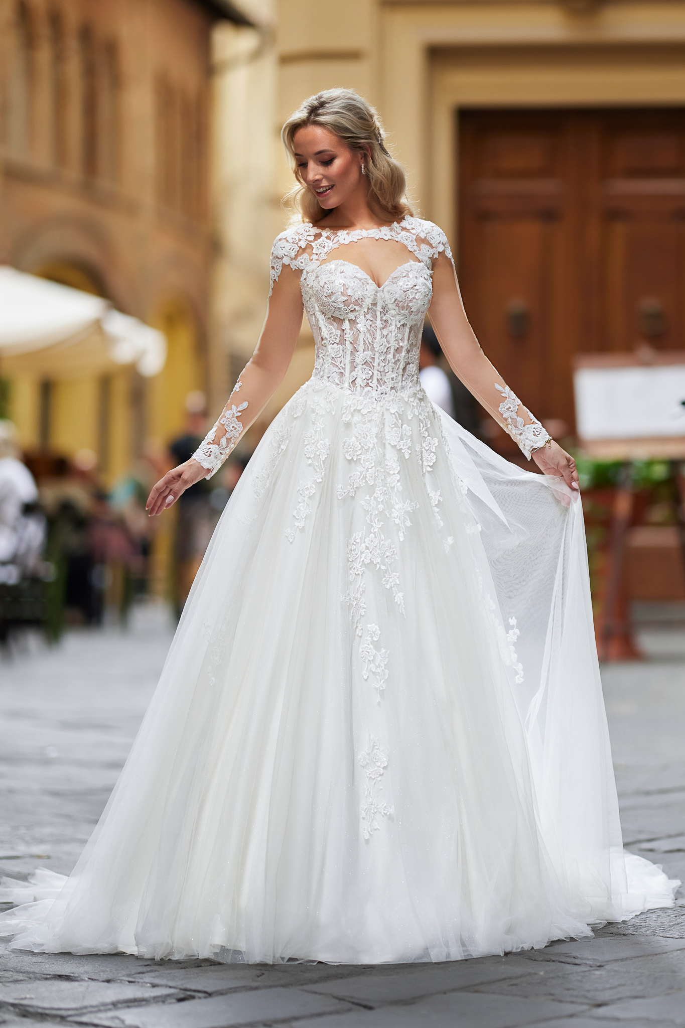 Dieses luxuriöse Brautkleid im Double-Look ist mit eleganten, abnehmbaren langen Ärmeln ausgestattet, um zwischen der Zeremonie und dem Empfang einen anderen Look zu schaffen. Das Korsett-Oberteil mit herzförmigem Ausschnitt ist mit eleganten Spitzenapplikationen verziert, die über den Rock verlaufen. Der Rock besteht aus mehreren Lagen sanft fließendem Tüll und glitzerndem Tüll. Alle Materialdetails anzeigen