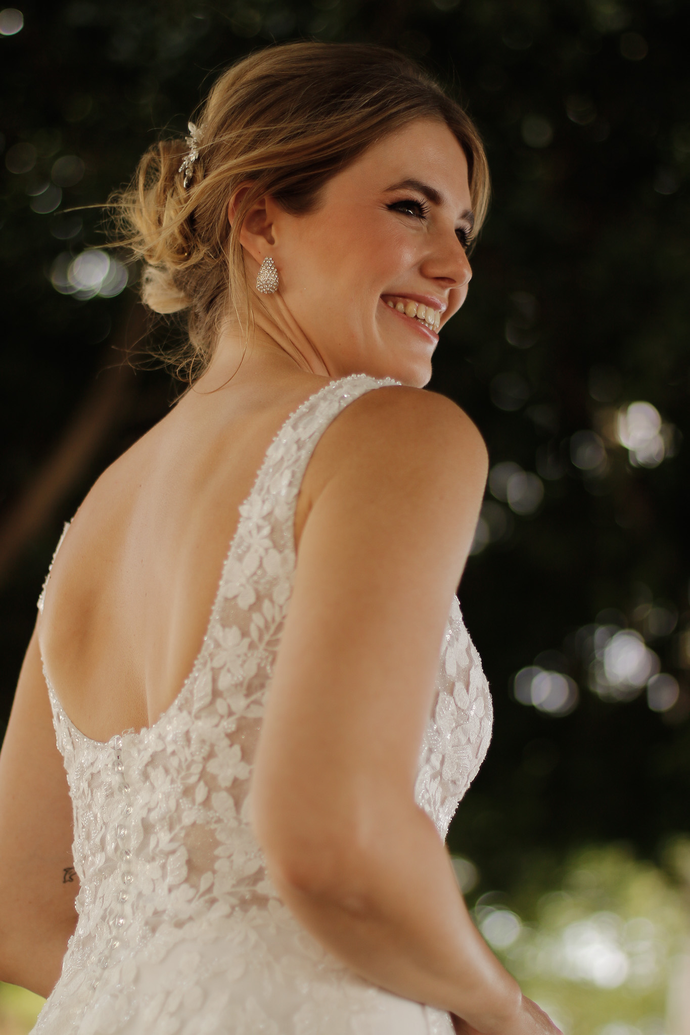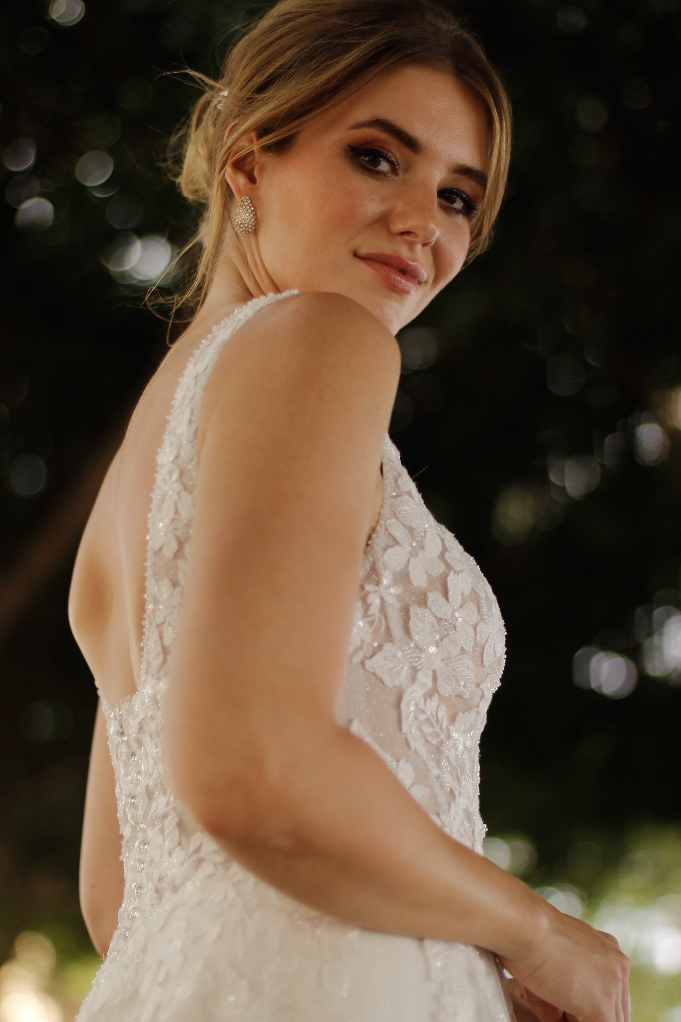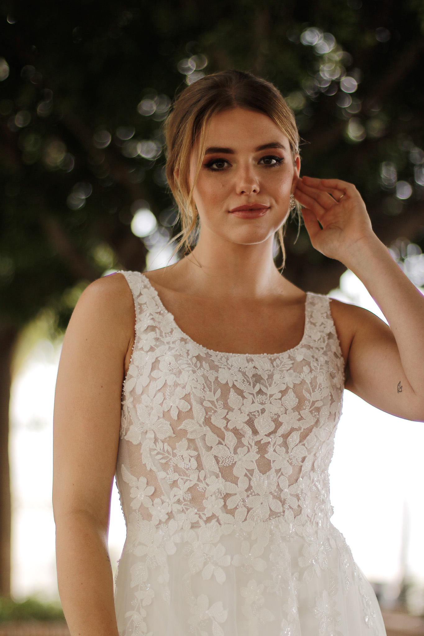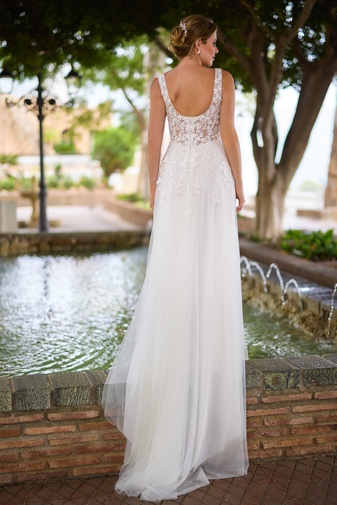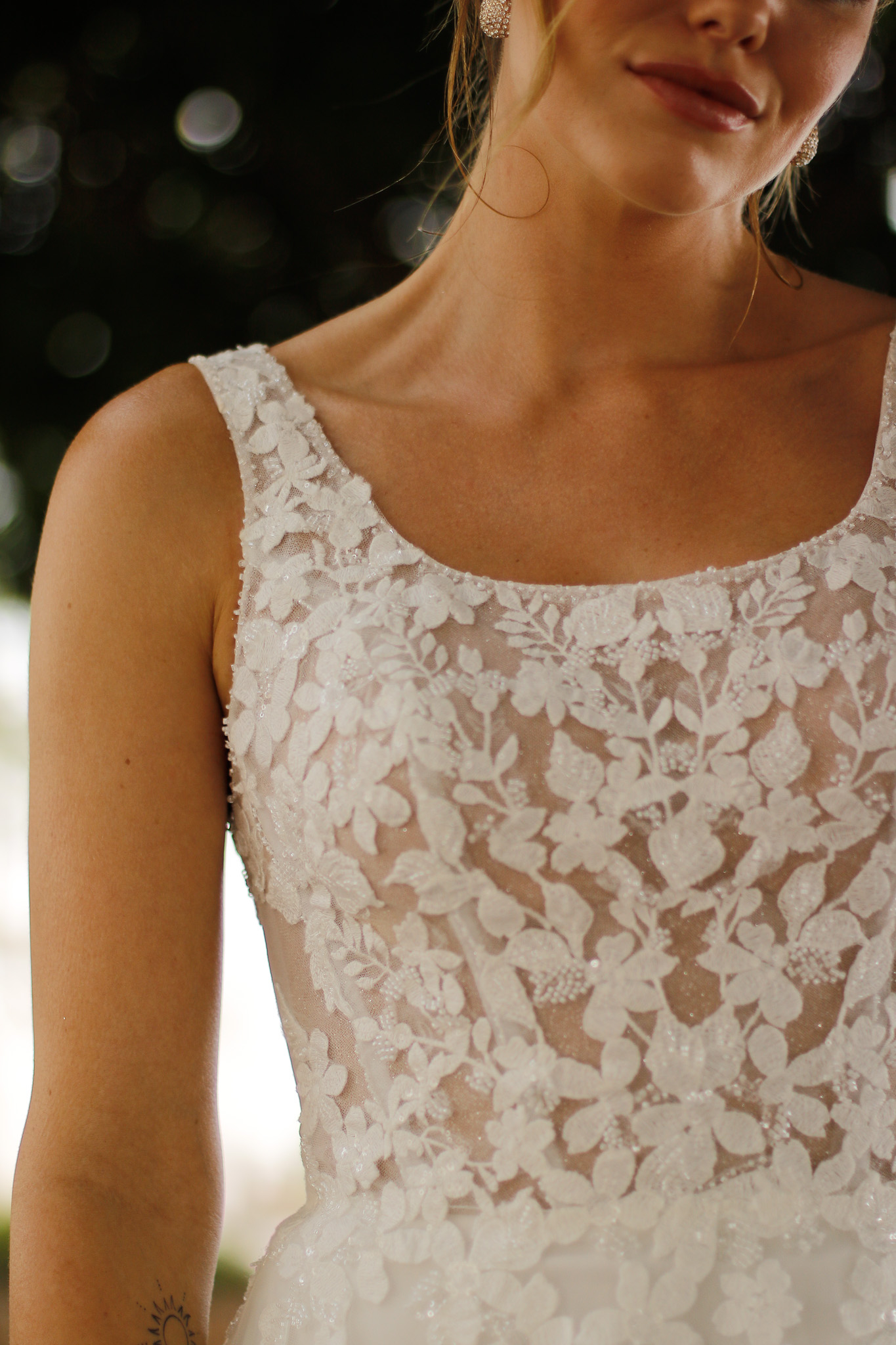 Dieses raffinierte und elegante A-line Brautkleid ist mit zarten Spitzenapplikationen am gesamten Mieder versehen und verlaufen über den Rock. Weiter hat das Kleid einen geraden Ausschnitt. Der Rock ist aus mehreren Lagen Tüll über Satin gefertigt.  Alle Materialdetails anzeigen