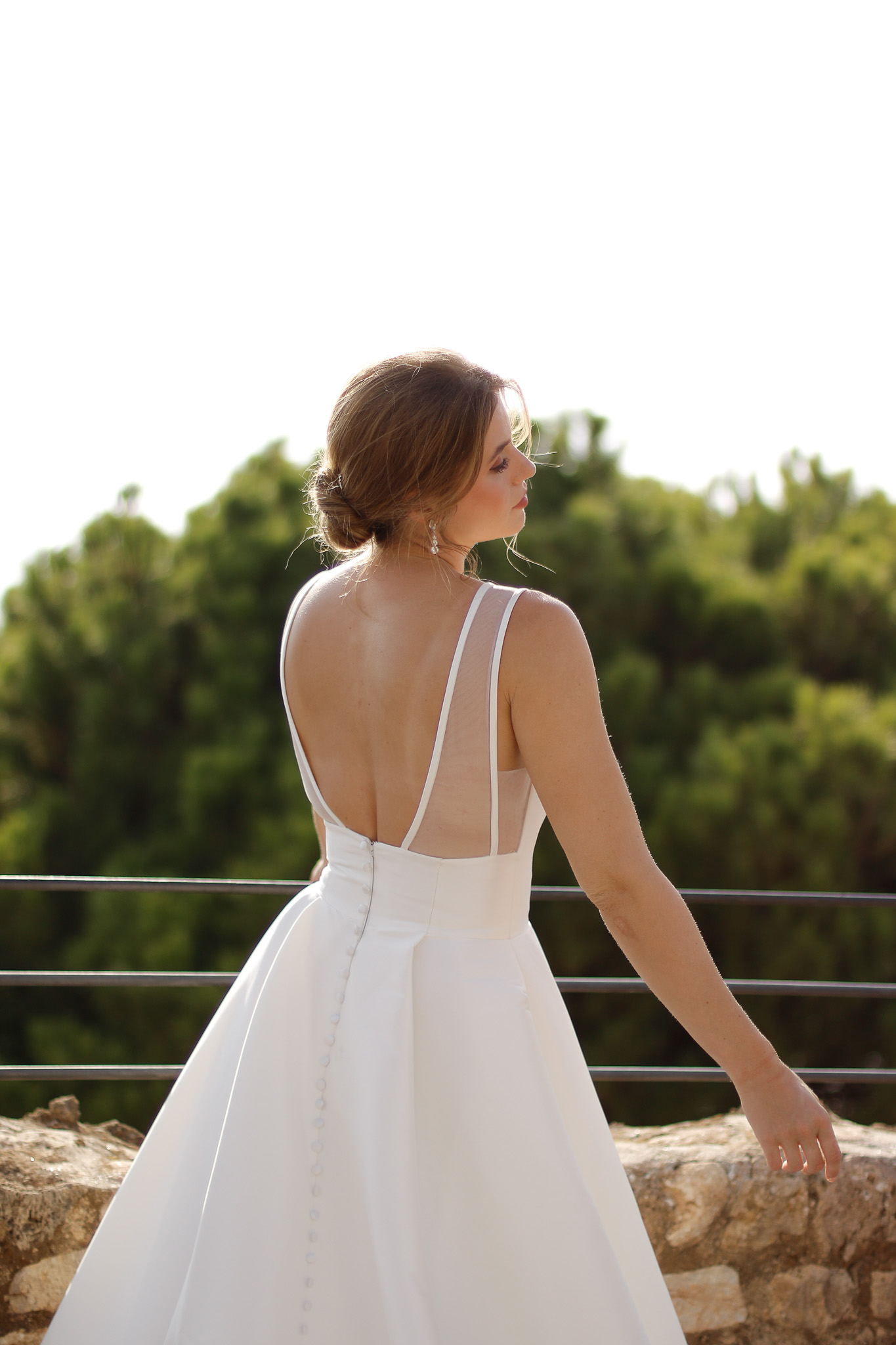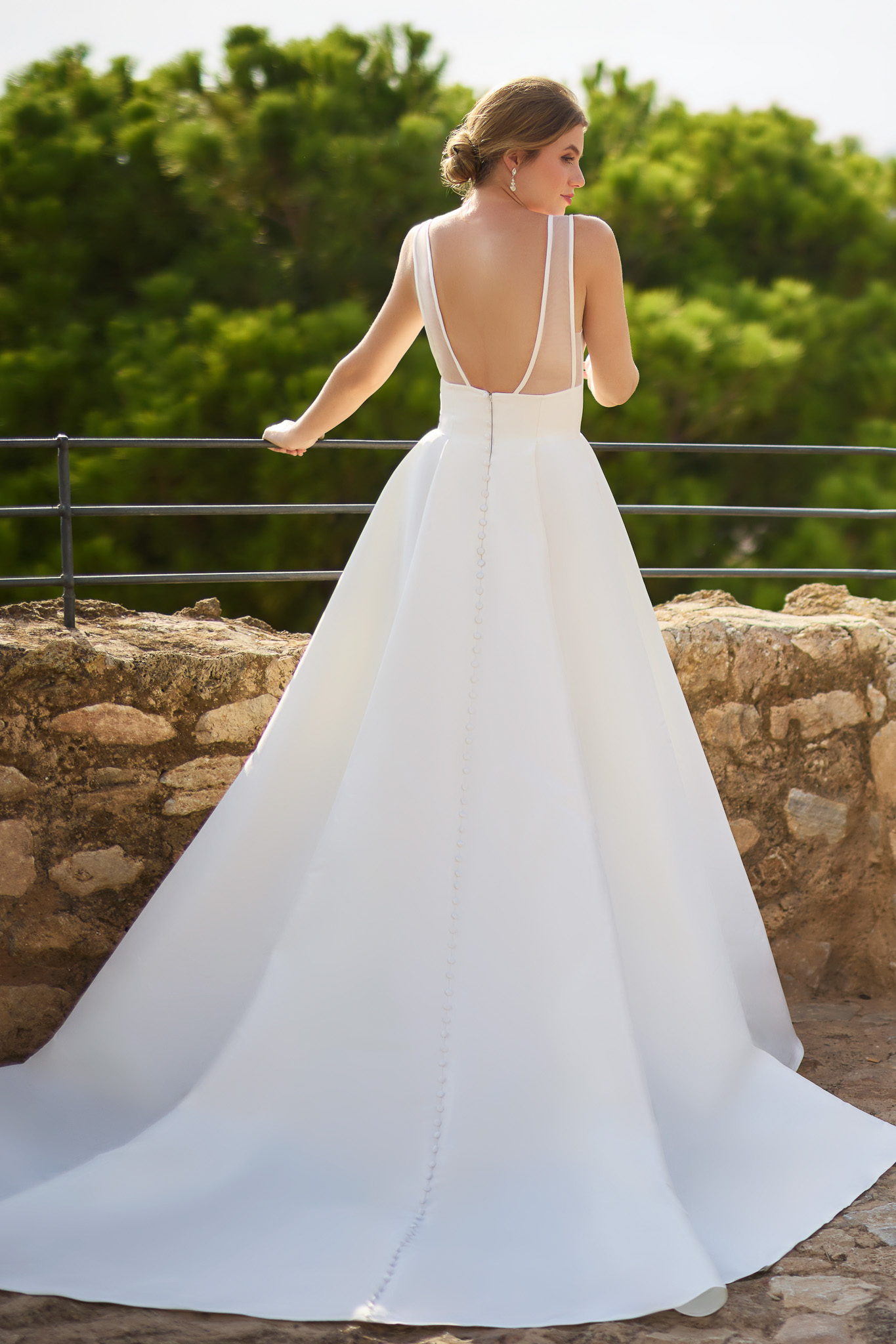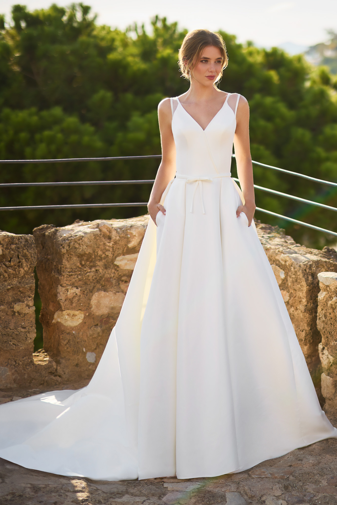 Ein wunderschönes und modernes Brautkleid im Mikado A-Linien-/Ballkleid-Stil mit einem Wickelausschnit. Der Rücken hat transparente Elemente, die an der Vorderseite verbunden und sichtbar sind. Der Rock ist mit luxuriösem Mikado über Satin für eine perfekte Passform geschaffen und verfügt über versteckte Seitennähte Taschen. Alle Materialdetails anzeigen