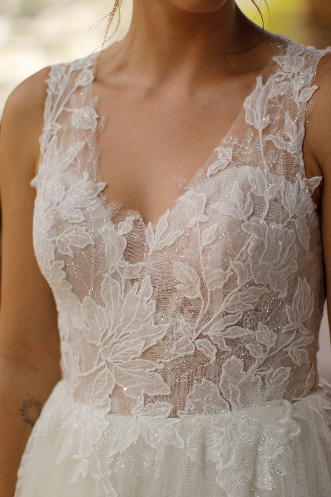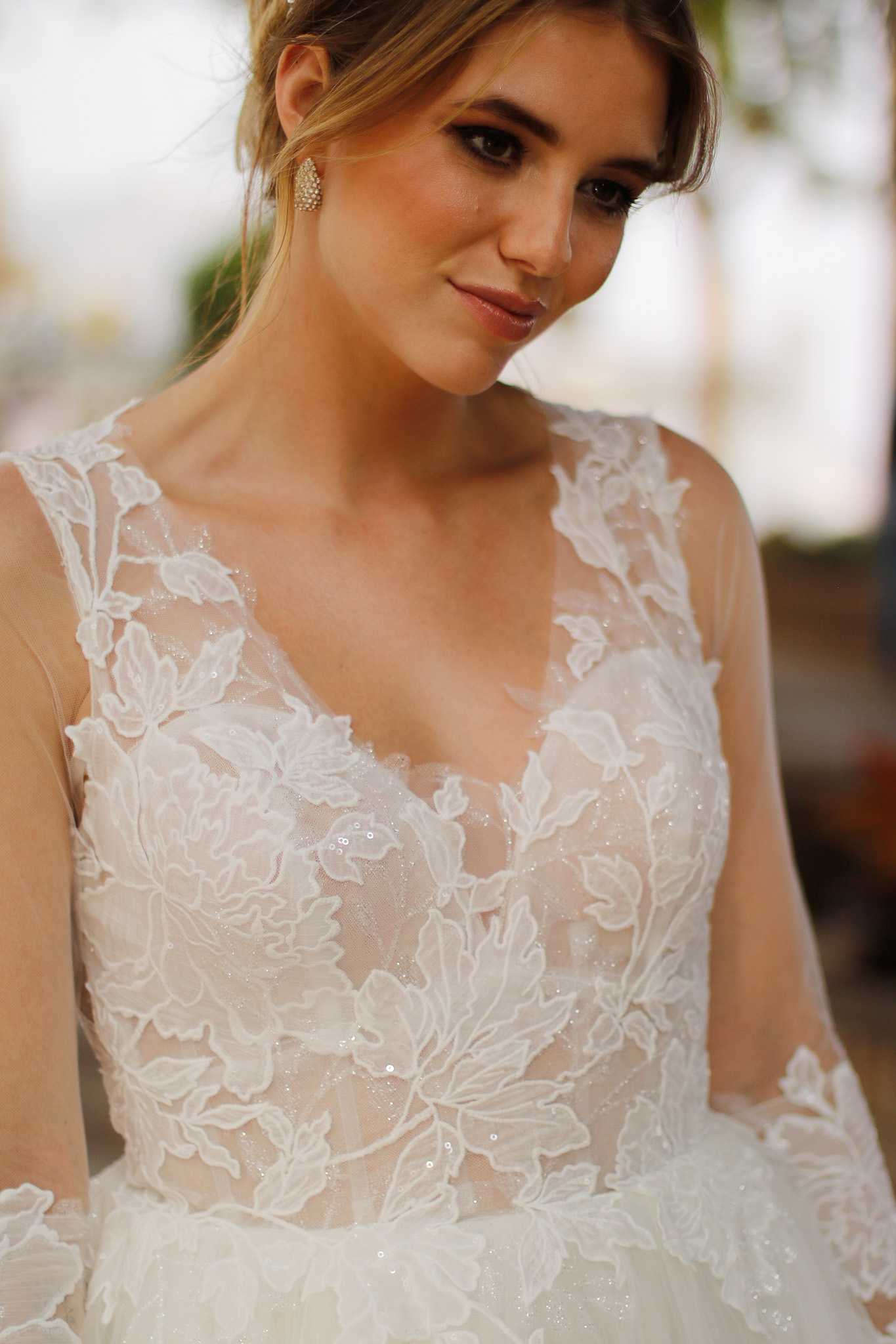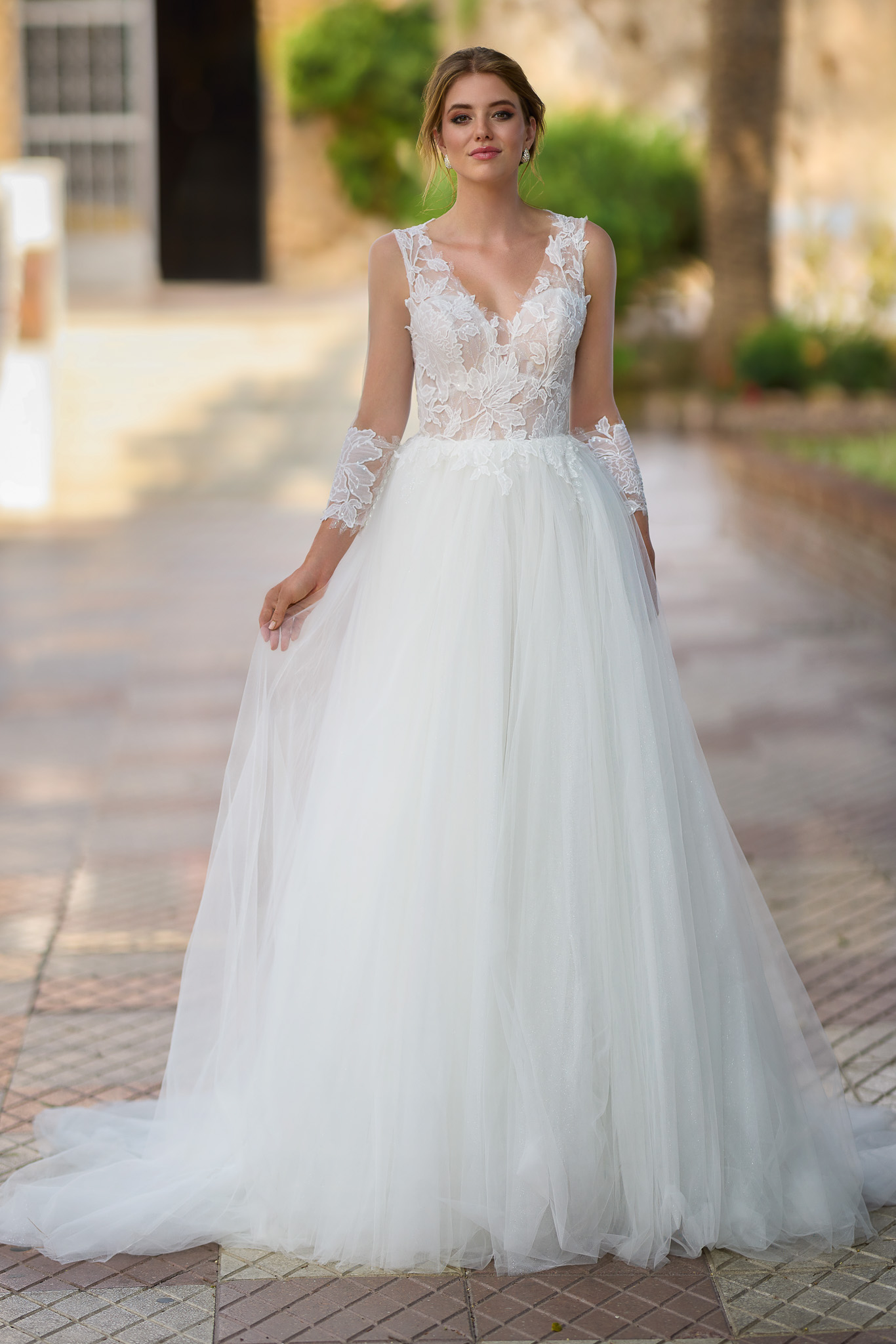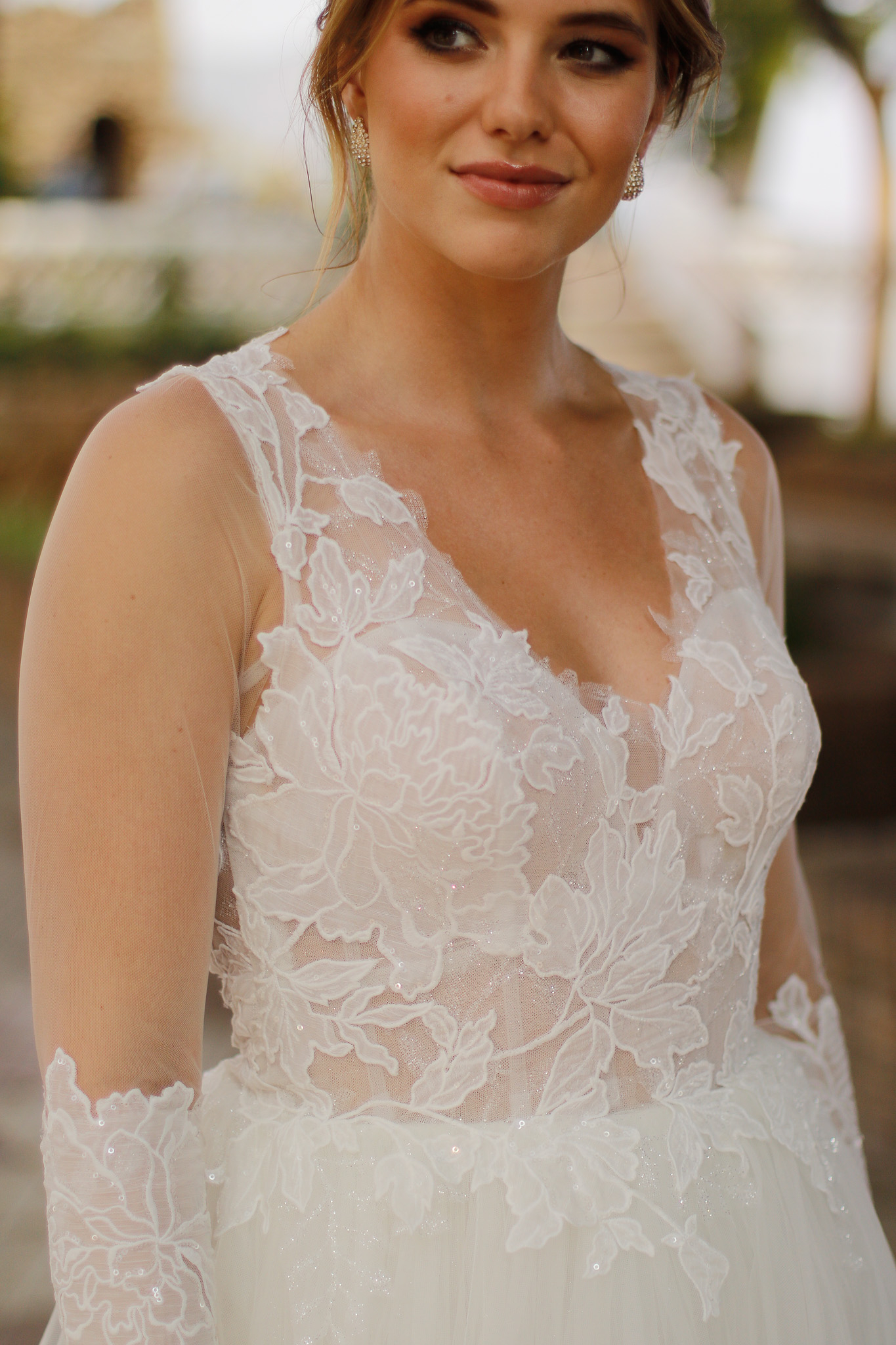Dieses atemberaubende und moderne Brautkleid in A-Linie ist mit wunderschönen Blumenapplikationen über einer Schicht aus transparentem Glitzertüll im Mieder gestaltet und dies bildet auch die beeindruckenden Manschetten, die mit den transparenten abnehmbaren langen Ärmeln verbunden sind. Auf diese Weise können Sie zwischen der Zeremonie und dem Empfang einen anderen Look kreieren. Der voluminöse Rock besteht aus mehreren Lagen (Glitzer-)Tüll und die Schleppe verleiht dem Kleid einen romantischen Touch. Alle Materialdetails anzeigen