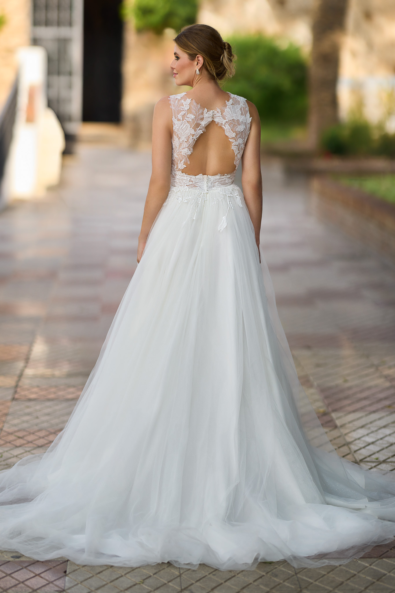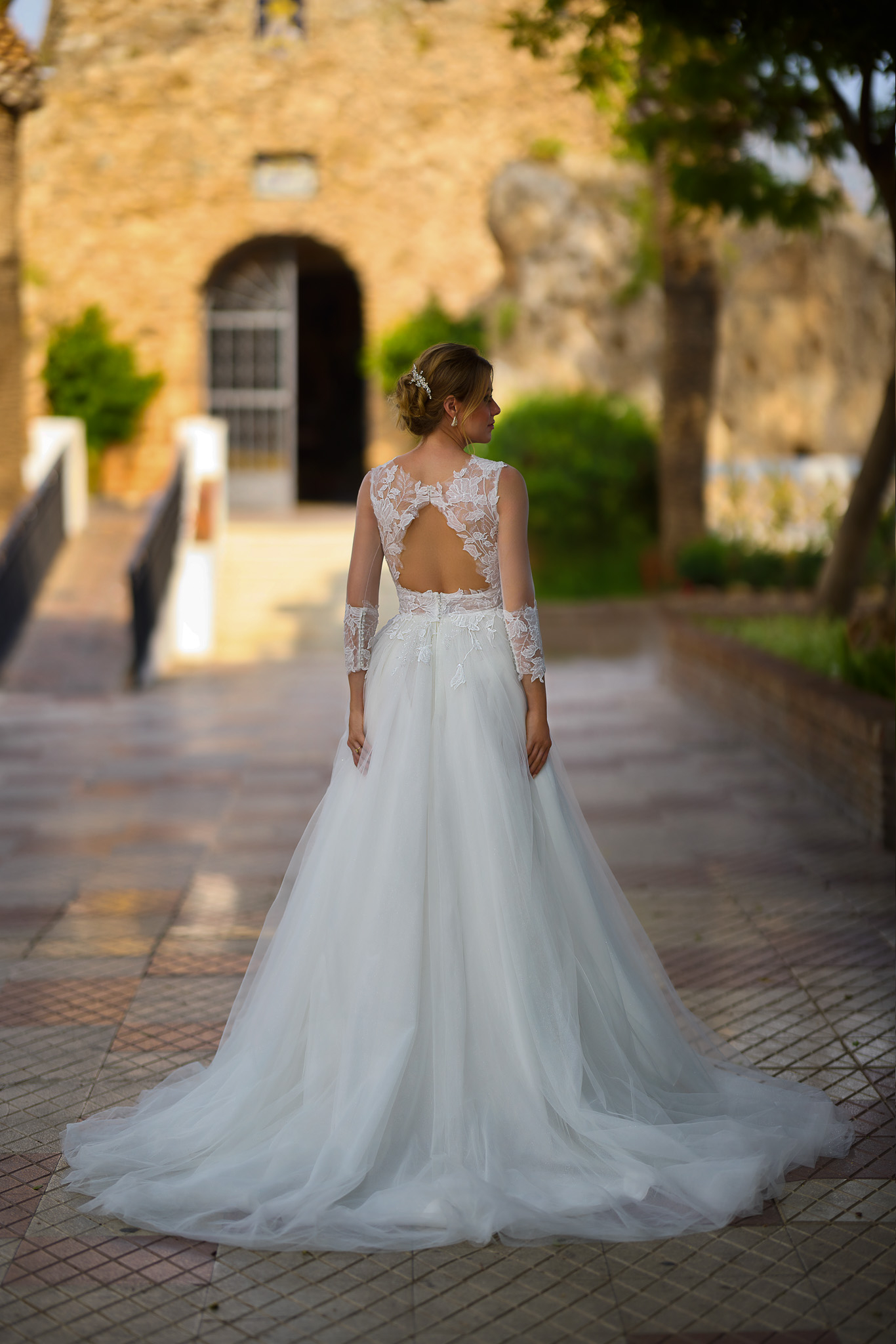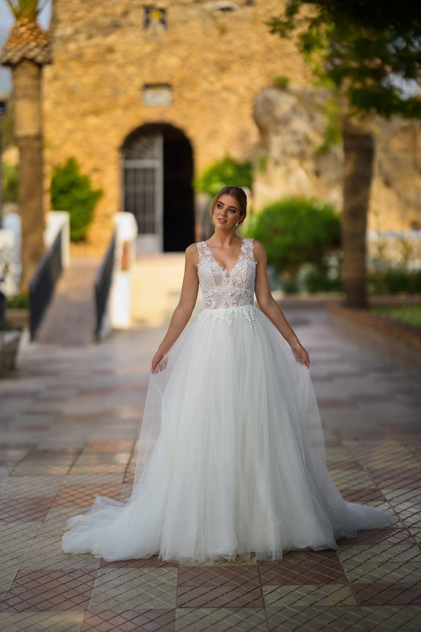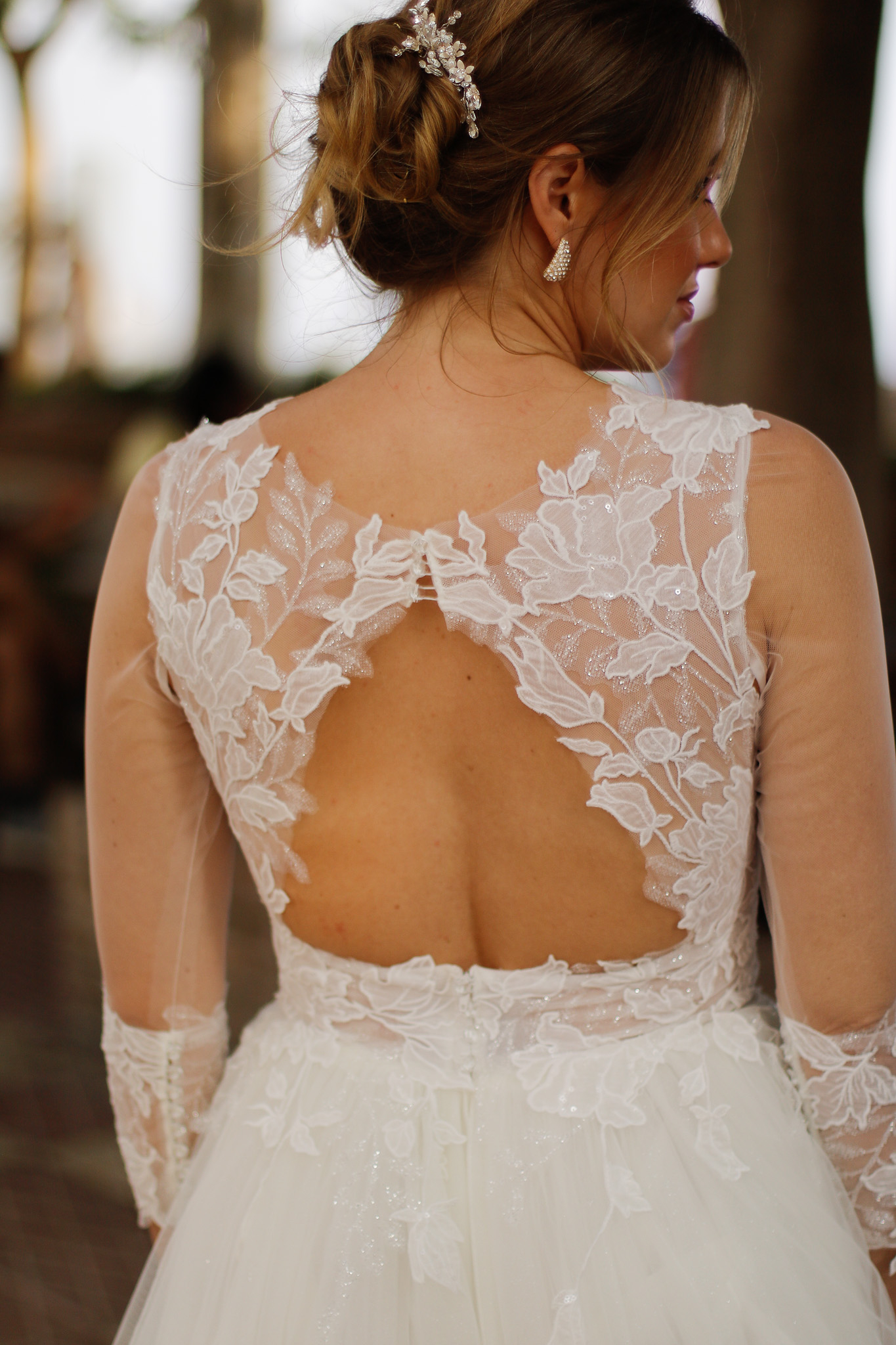 Dieses atemberaubende und moderne Brautkleid in A-Linie ist mit wunderschönen Blumenapplikationen über einer Schicht aus transparentem Glitzertüll im Mieder gestaltet und dies bildet auch die beeindruckenden Manschetten, die mit den transparenten abnehmbaren langen Ärmeln verbunden sind. Auf diese Weise können Sie zwischen der Zeremonie und dem Empfang einen anderen Look kreieren. Der voluminöse Rock besteht aus mehreren Lagen (Glitzer-)Tüll und die Schleppe verleiht dem Kleid einen romantischen Touch. Alle Materialdetails anzeigen