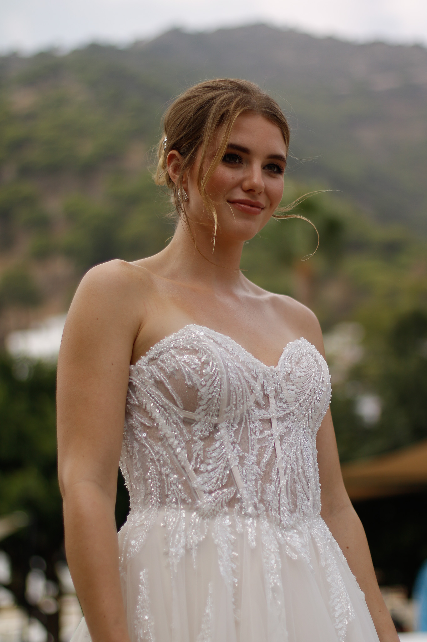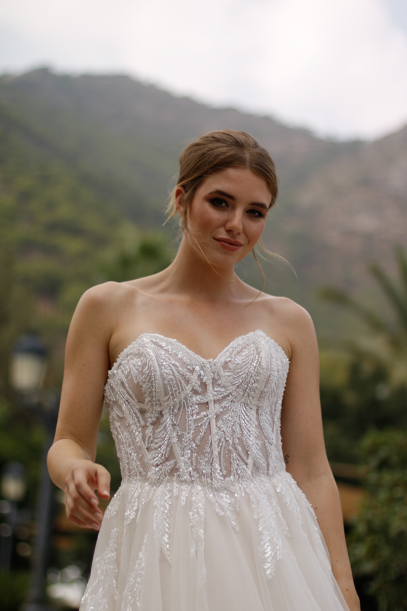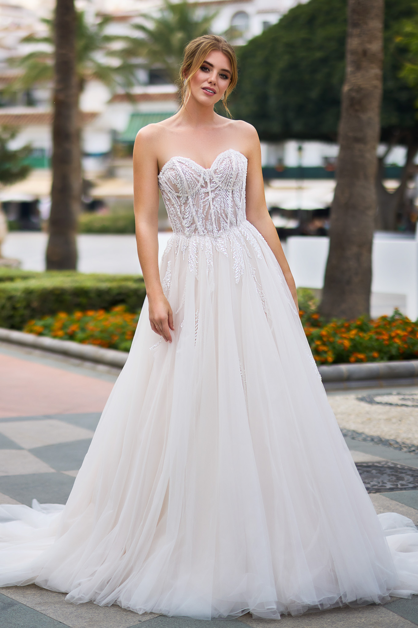 Dieses luxuriöse Brautkleid ist mit einem Korsett-Oberteil mit herzförmigem Ausschnitt und eleganten glänzenden Details und Perlen verziert, die über den Rock verlaufen. Eine zauberhafte, weich fließende Schleppe aus mehreren Lagen Tüll und Organza rundet den Look des Kleides wunderschön ab. Alle Materialdetails anzeigen